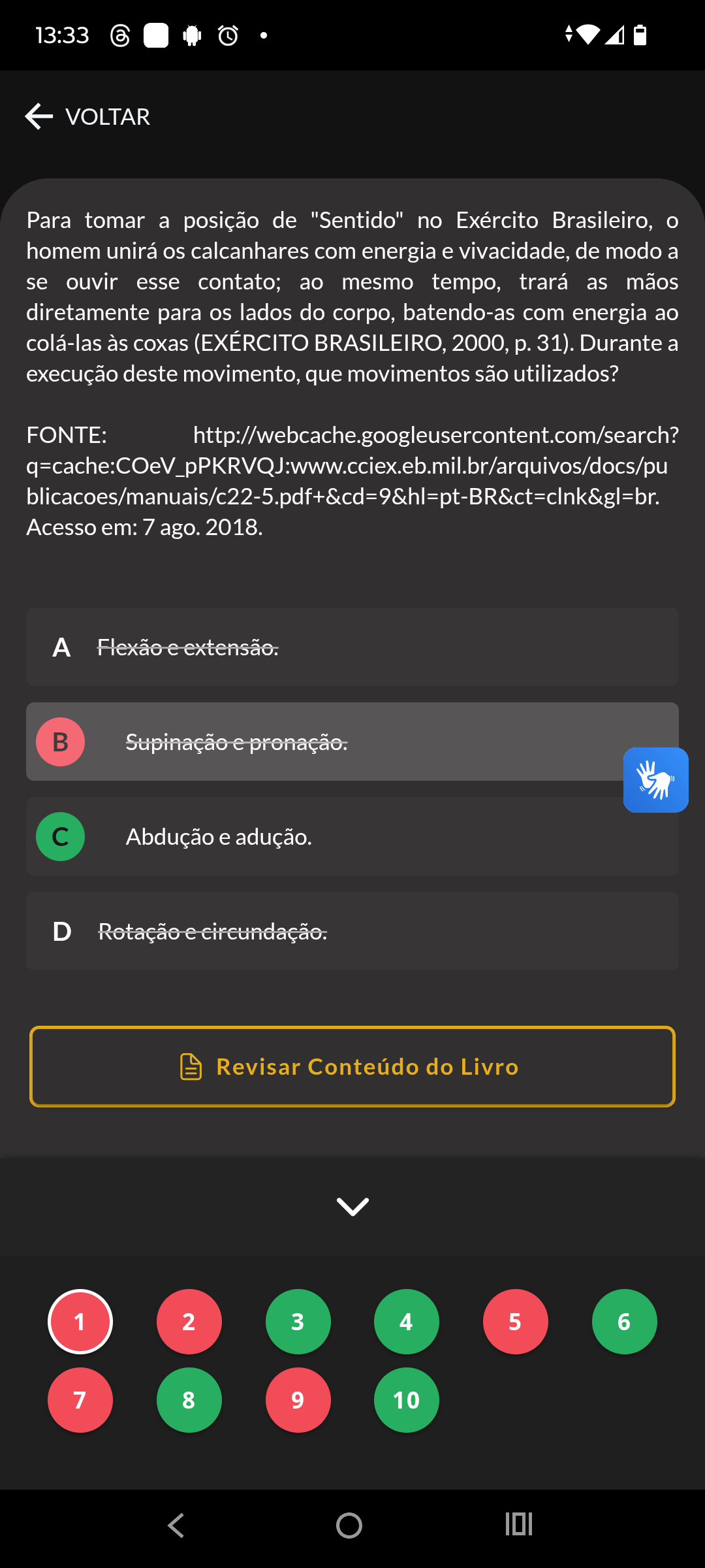 13:33 VOLTAR Para tomar a posição de "Sentido" no Exército Brasileiro, o homem unirá os calcanhares com energia e vivacidade, de modo a se ouvir esse contato; ao mesmo tempo, trará as mãos diretamente para os lados do corpo, batendo-as com energia ao colá-las às coxas (EXÉRCITO BRASILEIRO, 2000, p. 31). Durante a execução deste movimento, que movimentos são utilizados? FONTE: http://webcache.googleusercontent.com/search? q=cache:COeV_pPKRVQJ:www.cciex.eb.mil.br/arquivos/docs/pu Acesso em: 7 ago. 2018. Flexão e extensão. Supinação e pronação. Abdução e adução. D Rotação e circundação. Revisar Conteúdo do Livro 1 2 3 4 5 6 7 8 9 10