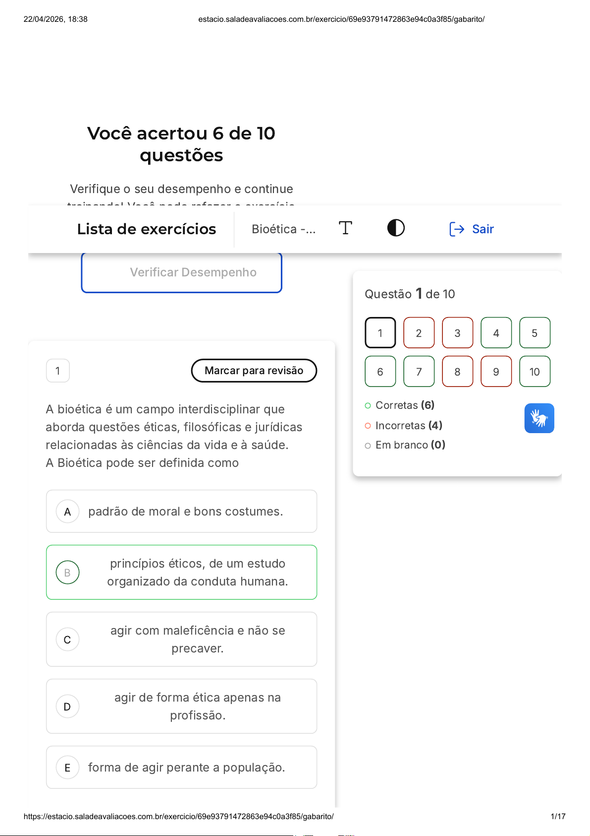 Você acertou 6 de 10 questões Verifique o seu desempenho e continue treinando! Você pode refazer o exercício quantas vezes quiser. Verificar Desempenho A B C D E 1 Marcar para revisão A bioética é um campo interdisciplinar que aborda questões éticas, filosóficas e jurídicas relacionadas às ciências da vida e à saúde. A Bioética pode ser definida como padrão de moral e bons costumes. princípios éticos, de um estudo organizado da conduta humana. agir com maleficência e não se precaver. agir de forma ética apenas na profissão. forma de agir perante a população. Questão 1 de 10 Corretas (6) Incorretas (4) Em branco (0) 1 2 3 4 5 6 7 8 9 10 Lista de exercícios Bioética -… Sair 22/04/2026, 18:38 estacio.saladeavaliacoes.com.br/exercicio/69e93791472863e94c0a3f85/gabarito/ https://estacio.saladeavaliacoes.com.br/exercicio/69e93791472863e94c0a3f85/gabarito/ 1/17 Resposta correta Parabéns, você selecionou a alternativa correta. Confira o gabarito comentado! Gabarito Comentado Para a ética, a vida é uma teia, onde todos os fios são importantes, inseparáveis e coprodutores uns dos outros. Portanto, agir com ética é prezar pela saúde e pela vida do próximo, não esquecendo que você, enquanto profissional, também é humano, que passa por adversidades todos os dias, mas você escolheu como profissão o cuidar. É por isso que você precisa estar atento à manutenção de uma postura consciente, solidária e responsável. 2 Marcar para revisão (Quadrix/2020 - adaptada) Os princípios de beneficência e não maleficência, respeito e justiça são amplamente discutidos na prática de pesquisas científicas. Sobre os quatro princípios básicos da bioética, analise as afirmativas. I - Os quatro princípios fundamentais da bioética são beneficência, autoridade, não maleficência e justiça. II - Preservar a privacidade do paciente, garantir a confidencialidade de suas informações e encorajá-lo a desenvolver sua autonomia são condutas previstas no princípio da beneficência. III - A beneficência promove a reflexão sobre os benefícios trazidos ao indivíduo avaliado e a ponderação sobre os eventuais prejuízos advindos de uma avaliação imprecisa. 22/04/2026, 18:38 estacio.saladeavaliacoes.com.br/exercicio/69e93791472863e94c0a3f85/gabarito/ https://estacio.saladeavaliacoes.com.br/exercicio/69e93791472863e94c0a3f85/gabarito/ 2/17 A B C D E Marque a alternativa que apresenta a(s) afirmativa(s) correta(s). I II II, III I, III I, II Resposta incorreta Opa! A alternativa correta é a letra C. Confira o gabarito comentado! Gabarito Comentado A afirmativa I está incorreta, pois os quatro princípios fundamentais da bioética são beneficência, autonomia, não maleficência e justiça, e não autoridade. A afirmativa II está correta, pois o princípio da beneficência envolve a preservação da privacidade do paciente, a garantia da confidencialidade de suas informações e o encorajamento para o desenvolvimento de sua autonomia. A afirmativa III também está correta, pois a beneficência promove a reflexão sobre os benefícios trazidos ao indivíduo avaliado e a ponderação sobre os eventuais prejuízos advindos de uma avaliação imprecisa. 22/04/2026, 18:38 estacio.saladeavaliacoes.com.br/exercicio/69e93791472863e94c0a3f85/gabarito/ https://estacio.saladeavaliacoes.com.br/exercicio/69e93791472863e94c0a3f85/gabarito/ 3/17 A B C D E 3 Marcar para revisão (CESPE / CEBRASPE/2006 - adaptada) A ética ocupa-se basicamente de questões objetivas, concretas e essencialmente de interesse coletivo. Sobre a diferença entre ética e moral, analise as afirmativas abaixo. I - A ética é permanente enquanto a moral varia de acordo com a cultura. II - A ética tem origem na cultura e a moral varia de acordo com a cultura. III - A ética explica a moral de forma racional e a moral é algo de ordem prática. Marque a alternativa que apresenta a(s) afirmativa(s) correta(s). I II II, III I, III III Resposta incorreta Opa! A alternativa correta é a letra D. Confira o gabarito comentado! Gabarito Comentado 22/04/2026, 18:38 estacio.saladeavaliacoes.com.br/exercicio/69e93791472863e94c0a3f85/gabarito/ https://estacio.saladeavaliacoes.com.br/exercicio/69e93791472863e94c0a3f85/gabarito/ 4/17 A afirmativa I está correta, pois a ética, de fato, é um conjunto de princípios universais e permanentes que guiam o comportamento humano, enquanto a moral pode variar de acordo com a cultura, o tempo e o espaço. Já a afirmativa III também está correta, pois a ética busca explicar e justificar a moral de forma racional, enquanto a moral se refere a normas, valores e comportamentos considerados corretos ou errados em uma determinada sociedade, sendo, portanto, de ordem prática. A afirmativa II está incorreta, pois, ao contrário do que afirma, a ética não tem origem na cultura, mas sim é um conjunto de princípios universais e permanentes. 4 Marcar para revisão (UNCISAL/2012) A Bioética é uma ética aplicada que trata de conflitos e controvérsias morais no âmbito das Ciências da Vida e da Saúde, envolvendo valores e práticas. Suas reflexões abordam temas que atingem a vida de forma irreversível. As opções a seguir apresentam temas tratados pela Bioética, exceto: 22/04/2026, 18:38 estacio.saladeavaliacoes.com.br/exercicio/69e93791472863e94c0a3f85/gabarito/ https://estacio.saladeavaliacoes.com.br/exercicio/69e93791472863e94c0a3f85/gabarito/ 5/17 A B C D E Políticas públicas na área de saúde e combate à mortalidade infantil. Aborto e clonagem. Eutanásia e uso de órgão de animais em seres humanos. Fertilização artificial e conservação do corpo humano após a morte. Produção de transgênicos e engenharia genética humana. Resposta correta Parabéns, você selecionou a alternativa correta. Confira o gabarito comentado! Gabarito Comentado A Bioética se trata de uma matéria transdisciplinar, que permite a cooperação, interação de diversas outras 