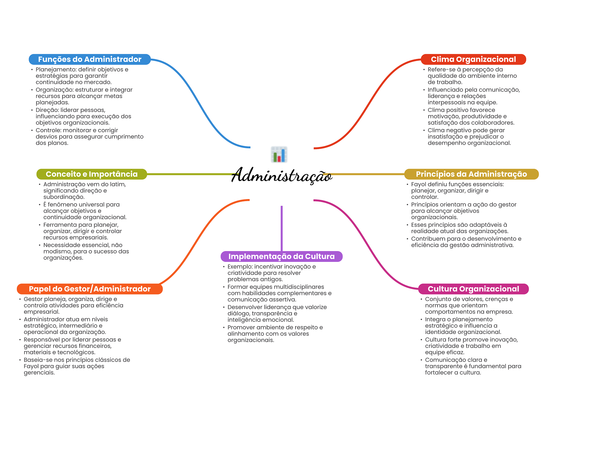 Funções do Administrador Clima Organizacional Planejamento: definir objetivos e Refere-se à percepção da estratégias para garantir qualidade do ambiente interno continuidade no mercado. de trabalho. Organização: estruturar e integrar Influenciado pela comunicação, recursos para alcançar metas liderança e relações planejadas. interpessoais na equipe. Direção: liderar pessoas, Clima positivo favorece influenciando para execução dos motivação, produtividade e objetivos organizacionais. satisfação dos colaboradores. Controle: monitorar e corrigir Clima negativo pode gerar desvios para assegurar cumprimento insatisfação e prejudicar dos planos. desempenho organizacional. Conceito e Importância Administração Princípios da Administração Administração vem do latim, Fayol definiu funções essenciais: significando direção e planejar, organizar, dirigir e subordinação. controlar. É fenômeno universal para Princípios orientam a ação do gestor alcançar objetivos e para alcançar objetivos continuidade organizacional. organizacionais. Ferramenta para planejar, Esses princípios são adaptáveis à organizar, dirigir e controlar realidade atual das organizações. recursos empresariais. Contribuem para O desenvolvimento e Necessidade essencial, não eficiência da gestão administrativa. modismo, para O sucesso das organizações. Implementação da Cultura Exemplo: incentivar inovação e criatividade para resolver problemas antigos. Papel do Gestor/Administrador Formar equipes multidisciplinares Cultura Organizacional com habilidades complementares e Gestor planeja, organiza, dirige e comunicação assertiva. Conjunto de valores, crenças e controla atividades para eficiência Desenvolver liderança que valorize normas que orientam empresarial. diálogo, transparência e comportamentos na empresa. Administrador atua em níveis inteligência emocional. Integra O planejamento estratégico, intermediário e Promover ambiente de respeito e estratégico e influencia a operacional da organização. alinhamento com valores identidade organizacional. Responsável por liderar pessoas e organizacionais. Cultura forte promove inovação, gerenciar recursos financeiros, criatividade e trabalho em materiais e tecnológicos. equipe eficaz. Baseia-se nos princípios clássicos de Comunicação clara e Fayol para guiar suas ações transparente é fundamental para gerenciais. fortalecer a cultura.