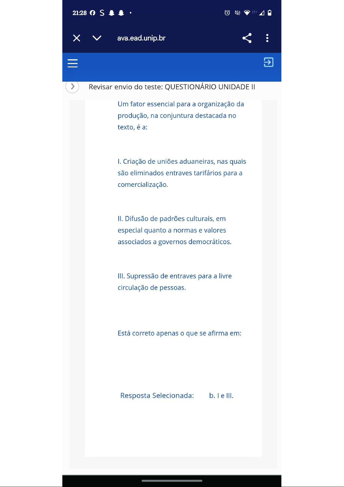 21:28 f S H+ X ava.ead.unip.br Revisar envio do teste: QUESTIONÁRIO UNIDADE Um fator essencial para a organização da produção, na conjuntura destacada no texto, é a: I. Criação de uniões aduaneiras, nas quais são eliminados entraves tarifários para a comercialização. II. Difusão de padrões culturais, em especial quanto a normas e valores associados a governos democráticos. III. Supressão de entraves para a livre circulação de pessoas. Está correto apenas que se afirma em: Resposta Selecionada: b. le III.21:28 f S H+ X ava.ead.unip.br Revisar envio do teste: QUESTIONÁRIO UNIDADE Uma consequência para setor produtivo e outra para mundo do trabalho advindas das transformações citadas no texto estão presentes, respectivamente, em: I. Limitação dos fluxos logísticos e fortalecimento de associações sindicais. II. Aumento dos investimentos industriais e valorização dos postos qualificados. III. Automatização dos processos fabris e aumento dos níveis de desemprego. Está correto apenas que se afirma em: Resposta Selecionada: d. e III.21:28 S H+ X ava.ead.unip.br ... Revisar envio do teste: QUESTIONÁRIO UNIDADE 1. estoques. II. Empresas com estruturas flexíveis e adaptáveis e mão de obra barata. III. Organização em rede e tecnologia de informação. IV. Gestão centralizada e protecionismo econômico. Está correto apenas que se afirma em: Resposta Selecionada: e. I, II e III.21:28 S H+ X ava.ead.unip.br Revisar envio do teste: QUESTIONÁRIO UNIDADE III. A globalização das comunicações aumentou a universalização do acesso a meios de comunicação, eliminando as desigualdades sociais existentes entre países desenvolvidos e os em desenvolvimento. IV. Os efeitos da globalização no mercado de trabalho são evidentes com a criação de modalidades de emprego para países com mão de obra mais barata voltada à execução de serviços que não exigem alta qualificação. V.A globalização intensifica ritmo das mudanças nos meios de produção, tendendo a um aumento de tecnologias limpas e sustentáveis. Está correto apenas que se afirma em: Resposta Selecionada: e. le IV.21:28 S H+ Revisar envio do teste: QUESTIONÁRIO UNIDADE como uma tentativa de redução da interdependência entre os países. Um fato que corrobora com ponto de vista defendido por cientistas políticos em relação ao processo de "desglobalização" é: A formação de blocos econômicos, união de diferentes nações com intuito de estabelecer uma relação econômica fortalecida entre si. II. A expansão das multinacionais, empresas que possuem sua sede em um determinado país e filiais em outros países. III. O Brexit, fato que representa uma adversidade vivenciada pelo principal bloco econômico mundial, abalando ideal de construção de uma Europa integrada. Está correto apenas que se afirma em: Resposta Selecionada: e. III.H+ X ava.ead.unip.br Revisar envio do teste: QUESTIONÁRIO UNIDADE VCL uu Brasil e em sua balança comercial. II. O crescimento da produção industrial e de commodities da economia brasileira nas últimas décadas tem colocado Brasil como potência mundial em situação de desenvolvimento tecnológico na denominada economia do conhecimento. III. A posição de centro financeiro, industrial e econômico na América do Sul reforça papel do Brasil de potência regional na América do Sul e papel do bloco geoeconômico Mercosul no cenário global. Está correto apenas que se afirma em: Resposta Selecionada: a.l. Pergunta 7 0,5 em 0,5 pontos21:28 S H+ X ava.ead.unip.br Revisar envio do teste: QUESTIONÁRIO UNIDADE geógrafo Rogério Haesbaert (2013) compreende que século XXI provavelmente evidenciará um novo período, ainda não muito claro, da força da contradição da globalização em termos de suas dimensões e de seu alcance, aflorando com mais ênfase a dissociação entre sua efetivação material (especialmente em termos tecnoecológicos), seu reconhecimento no campo da cultura (com a ausência ou dificuldade de um consenso simbólico- cultural mais amplo) e sua necessidade (mas também ausência) no nível jurídico- político. Trata-se de uma verdadeira encruzilhada, em que são gestadas novas alternativas, entrelaçando alguns dilemas básicos, tais como: Resposta a. Selecionada: a problemática ecológica, especialmente o aquecimento global. Pergunta 8 0,5 em 0,5 pontos21:29 S H+ X ava.ead.unip.br ... Revisar envio do teste: QUESTIONÁRIO UNIDADE Bauman, autor logo de inicio que "[...] a globalização tanto divide como une; divide enquanto une - e as causas da divisão são idênticas às que promovem a uniformidade do globo". (BAUMAN, Z. Globalização: as consequências humanas. Rio de Janeiro: Jorge Zahar, 1999). Por essa breve reflexão, é possível afirmar que autor considera fenômeno da globalização como um movimento preocupante para a sociedade global na medida em que traz graves consequências. De acordo com seus conhecimentos e com a reflexão de Bauman, é possível afirmar que suas preocupações estão ligadas: Resposta a. Selecionada: ao aumento da desigualdade social entre países ricos e países em desenvolvimento. Pergunta 9 0,5 em 0,5 pontos21:29 f S H+ X ava.ead.unip.br Revisar envio do teste: QUESTIONÁRIO UNIDADE matérias-primas. II. Concentração do estoque de conhecimento nos países mais ricos, que deixa os países pobres à mercê da boa vontade alheia quando são necessários medicamentos e equipamentos de saúde. III. Concentração da produção industrial nos países agrários. IV. Fragmentação da produção agrária, que potencializa a vulnerabilidade social e econômica dos países industrializados. Está correto apenas que se afirma em: Resposta Selecionada: b. le II.21:29 f S H+ Revisar envio do teste: QUESTIONÁRIO UNIDADE De acordo com a visão do autor, podemos afirmar que: I. O processo de urbanização é bastante diferenciado no mundo todo, promovendo novas experiências que abrem os espaços à c