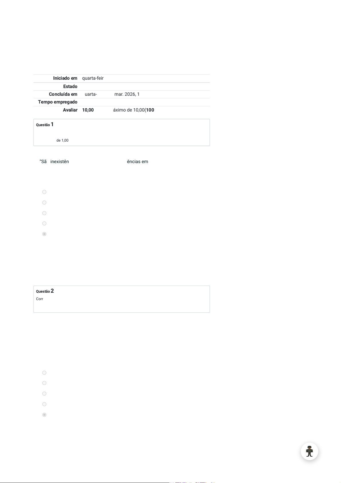 Iniciado em quarta-feira, 25 mar. 2026, 10:25 Estado Finalizada Concluída em quarta-feira, 25 mar. 2026, 10:30 Tempo empregado 5 minutos 54 segundos Avaliar 10,00 de um máximo de 10,00(100%) Questão 1 Correto Atingiu 1,00 de 1,00 Questão 2 Correto Atingiu 1,00 de 1,00 “São inexistências, inadequações ou deficiências em uma fonte de risco.” A definição acima citada refere-se a qual conceito: Escolha uma opção: a. Fator de Risco b. Evento c. Probabilidade d. Causa e. Vulnerabilidade ✓ Sua resposta está correta. A resposta correta é: Vulnerabilidade “É o risco a que uma organização está exposta sem considerar quaisquer ações gerenciais que possam reduzir a probabilidade de sua ocorrência ou seu impacto.” A definição acima refere-se a(ao): Escolha uma opção: a. Transparência b. Valor Público c. Risco Residual d. Gestão de Riscos e. Risco Inerente ✓ Sua resposta está correta. A resposta correta é: Risco Inerente 25/03/2026, 10:32 Exercício de Fixação - UD I: Revisão da tentativa | EBAula https://avaebaula.eb.mil.br/mod/quiz/review.php?attempt=4849301&cmid=532464 1/5 Questão 3 Correto Atingiu 1,00 de 1,00 Questão 4 Correto Atingiu 1,00 de 1,00 “Processo de natureza permanente, estabelecido, direcionado e monitorado pela alta administração e pelos demais gestores, aplicável em todos os escalões que contempla as atividades de identificar, avaliar, tratar e monitorar potenciais eventos que possam afetar a organização.” A definição acima citada refere-se a qual conceito: Escolha uma opção: a. Probabilidade b. Gestão de Riscos ✓ c. Risco d. Governança e. Evento Sua resposta está correta. A resposta correta é: Gestão de Riscos “Obrigação legal que os agentes ou organizações que gerenciam recursos públicos possuem de assumir responsabilidades por suas decisões e de prestarem contas de sua atuação, avocando integralmente para si a consequência de seus atos e omissões.” A definição acima citada refere-se a qual conceito: a. Auditoria Externa b. Auditoria Interna c. Governança d. Accountability ✓ e. Cadeia de Valor Agregado Sua resposta está correta. A resposta correta é: Accountability 25/03/2026, 10:32 Exercício de Fixação - UD I: Revisão da tentativa | EBAula https://avaebaula.eb.mil.br/mod/quiz/review.php?attempt=4849301&cmid=532464 2/5 Questão 5 Correto Atingiu 1,00 de 1,00 Questão 6 Correto Atingiu 1,00 de 1,00 Identificar, avaliar, tratar e monitorar os riscos inerentes às suas atividades, de acordo com as normas em vigor, levando em consideração a probabilidade de ocorrência e o impacto nos objetivos, é uma competência atribuída ao(à): Escolha uma opção: a. Equipes de Gestão de Riscos, Integridade e Controles (EGRIC) b. Proprietários de Riscos e Controles (PRisC) ✓ c. Comitê de Governança, Riscos e Controles do Exército (CGRiCEx) d. Escritório de Gestão de Riscos e Controles do Exército (EGRiCEx) e. Assessorias de Gestão de Riscos e Controles (AGRiC) Sua resposta está correta. A resposta correta é: Proprietários de Riscos e Controles (PRisC) A Gestão de Riscos, obrigatoriamente, inicia-se a partir de qual fase da Gestão de Processos? a. III - diagnosticar os processos de trabalho b. I - identificar os processos de trabalho c. II - mapear os processos de trabalho ✓ d. IV - redesenhar os processos de trabalho e. V - implantar os processos redesenhados Sua resposta está correta. A resposta correta é: II - mapear os processos de trabalho 25/03/2026, 10:32 Exercício de Fixação - UD I: Revisão da tentativa | EBAula https://avaebaula.eb.mil.br/mod/quiz/review.php?attempt=4849301&cmid=532464 3/5 Questão 7 Correto Atingiu 1,00 de 1,00 Questão 8 Correto Atingiu 1,00 de 1,00 “É uma representação gráfica que permite visualizar a forma como são gerados os produtos e os serviços da organização, enquanto que os demais processos internos de trabalho representam detalhadamente as rotinas, o processamento, as entradas e saídas de cada atividade, sendo que ambos são essenciais para que a aplicação da metodologia de gerenciamento de riscos e controles internos da gestão tenha maior efetividade.” A definição acima citada refere-se a qual conceito: Escolha uma opção: a. Fator de Risco b. Cadeia de Valor Agregado ✓ c. Evento d. Vulnerabilidade e. Causa Sua resposta está correta. A resposta correta é: Cadeia de Valor Agregado Conforme consta no Manual Técnico da Metodologia de Gestão de Riscos do EB, os riscos são classificados em: Escolha uma opção: a. Aquisições e contratações, operativos, emprego e integridade b. Estratégicos, operativos, gestão interna e integridade ✓ c. Estratégicos, preparo, gestão interna e gestão de pessoal d. Estratégicos, operativos, gestão do patrimônio e integridade e. Tecnologia da informação, operativos, gestão interna e segurança orgânica Sua resposta está correta. A resposta correta é: Estratégicos, operativos, gestão interna e integridade 25/03/2026, 10:32 Exercício de Fixação - UD I: Revisão da tentativa | EBAula https://avaebaula.eb.mil.br/mod/quiz/review.php?attempt=4849301&cmid=532464 4/5 Questão 9 Correto Atingiu 1,00 de 1,00 Questão 10 Correto Atingiu 1,00 de 1,00 “É realizado nas operações normais e de natureza contínua da organização. Inclui a administração, as atividades de supervisão e outras ações que os servidores executam ao cumprir suas responsabilidades. Abrange cada um dos componentes da estrutura do controle interno, fortalecendo os controles internos da gestão contra ações irregulares, antiéticas, antieconômicas, ineficientes e ineficazes.” A definição acima citada refere-se a qual conceito: Escolha uma opção: a. Sistema de Controle Interno do Poder Executivo Federal b. Política de Gestão de Riscos c. Operação Militar d. Monitoramento Contínuo ✓ e. Plano de Gestão de Riscos Sua resposta está correta. A resposta correta é: Monitoramento Contínuo 