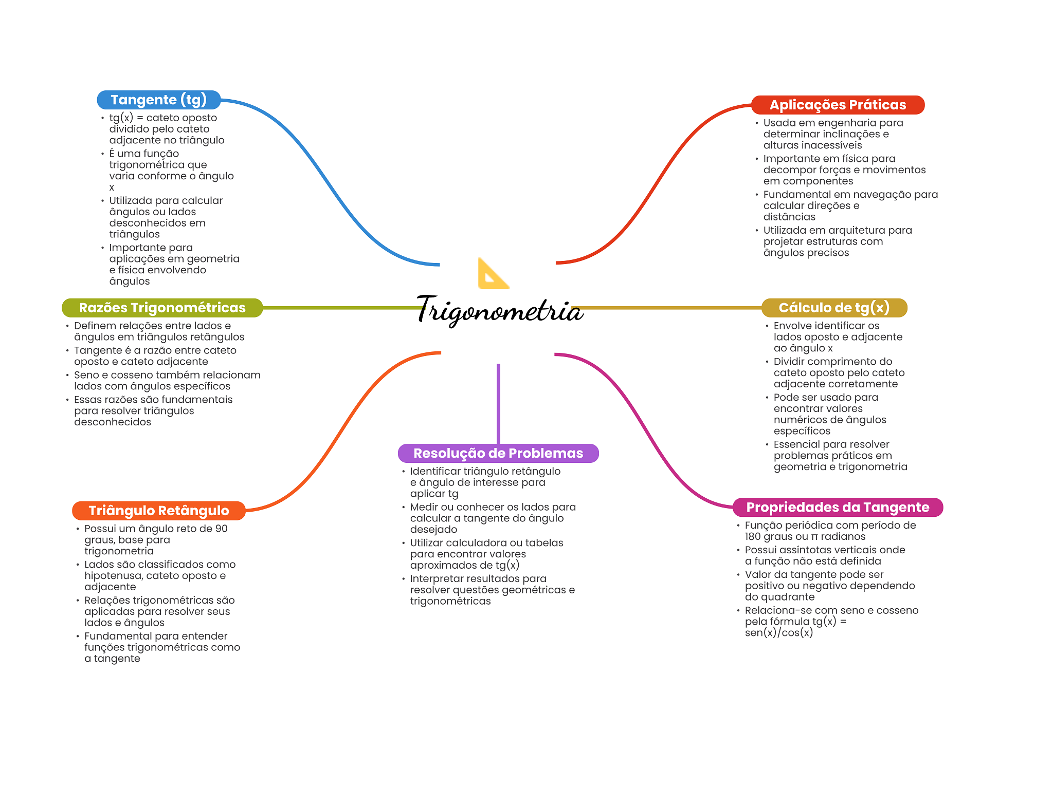 Tangente (tg) Aplicações Práticas tg(x) = cateto oposto Usada em engenharia para dividido pelo cateto determinar inclinações e adjacente no triângulo alturas inacessíveis É uma função Importante em física para trigonométrica que decompor forças e movimentos varia conforme ângulo em componentes X Utilizada para calcular Fundamental em navegação para calcular direções e ângulos ou lados distâncias desconhecidos em triângulos Utilizada em arquitetura para projetar estruturas com Importante para ângulos precisos aplicações em geometria e física envolvendo ângulos Razões Trigonométricas Trigonometria Cálculo de tg Definem relações entre lados e Envolve identificar ângulos em triângulos retângulos lados oposto e adjacente Tangente é a razão entre cateto ao ângulo X oposto e cateto adjacente Dividir comprimento do Seno e cosseno também relacionam cateto oposto pelo cateto lados com ângulos específicos adjacente corretamente Essas razões são fundamentais Pode ser usado para para resolver triângulos encontrar valores desconhecidos numéricos de ângulos específicos Essencial para resolver Resolução de Problemas problemas práticos em Identificar triângulo retângulo geometria e trigonometria e ângulo de interesse para aplicar tg Triângulo Retângulo Medir ou conhecer lados para Propriedades da Tangente calcular a tangente do ângulo Possui um ângulo reto de 90 desejado Função periódica com período de graus, base para Utilizar calculadora ou tabelas 180 graus ou TT radianos trigonometria para encontrar valores Possui assíntotas verticais onde Lados são classificados como aproximados de tg(x) a função não está definida hipotenusa, cateto oposto e Interpretar resultados para Valor da tangente pode ser adjacente resolver questões geométricas e positivo ou negativo dependendo Relações trigonométricas são trigonométricas do quadrante aplicadas para resolver seus Relaciona-se com seno e cosseno lados e ângulos pela fórmula tg(x) = Fundamental para entender sen(x)/cos(x) funções trigonométricas como a tangente