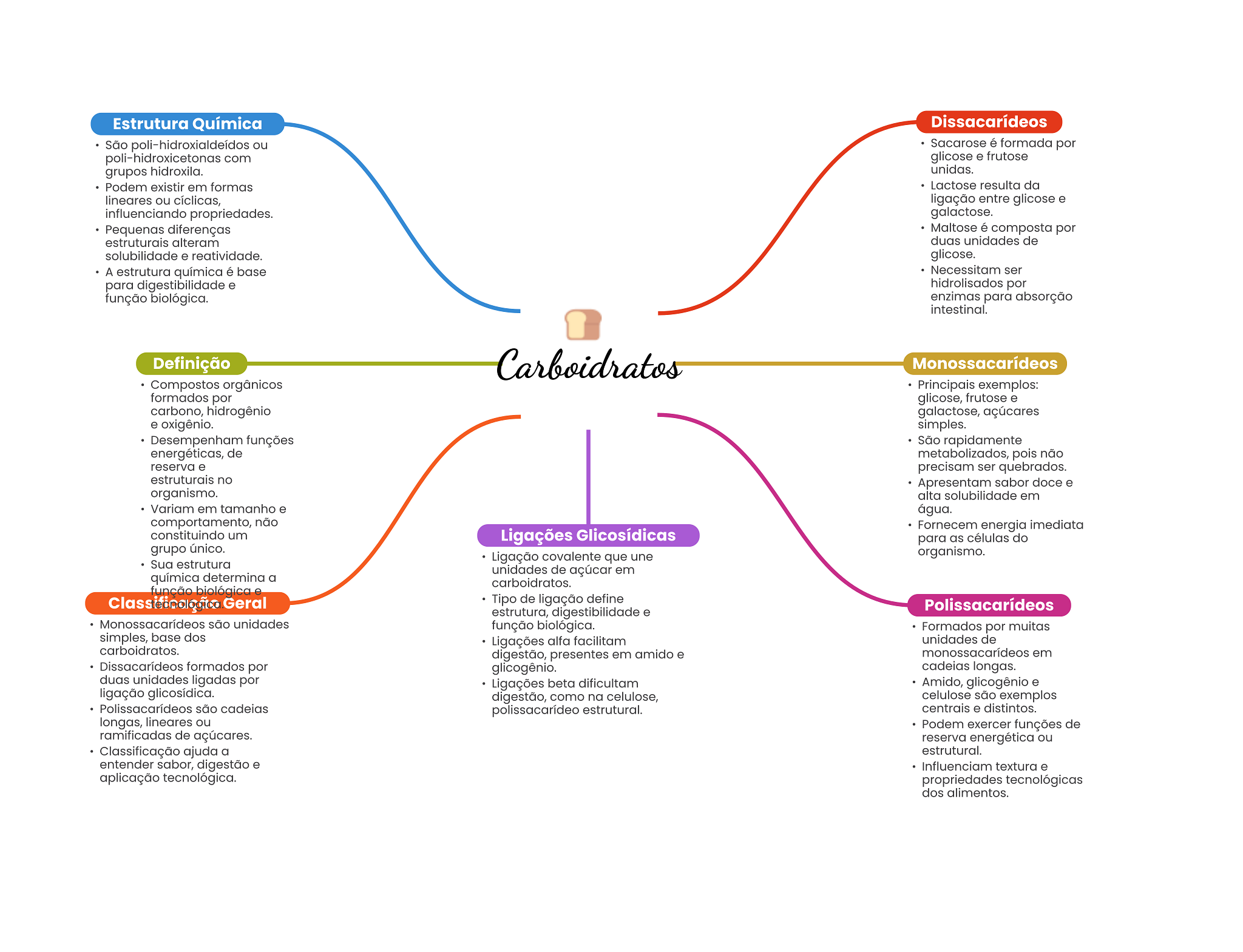 Estrutura Química Dissacarídeos São poli-hidroxialdeídos ou Sacarose é formada por poli-hidroxicetonas com glicose e frutose grupos hidroxila. unidas. Podem existir em formas Lactose resulta da lineares ou cíclicas, ligação entre glicose e influenciando propriedades. galactose. Pequenas diferenças Maltose é composta por estruturais alteram duas unidades de solubilidade e reatividade. glicose. A estrutura química é base Necessitam ser para digestibilidade e hidrolisados por função biológica. enzimas para absorção intestinal. Definição Carboidratos Monossacarídeos Compostos orgânicos Principais exemplos: formados por glicose, frutose e carbono, hidrogênio galactose, açúcares e oxigênio. simples. Desempenham funções São rapidamente energéticas, de metabolizados, pois não reserva e precisam ser quebrados. estruturais no Apresentam sabor doce e organismo. alta solubilidade em Variam em tamanho e água. comportamento, não Fornecem energia imediata constituindo um Ligações Glicosídicas para as células do grupo único. Ligação covalente que une organismo. Sua estrutura unidades de açúcar em química determina a carboidratos. função biológica Geral Tipo de ligação define Polissacarídeos estrutura, digestibilidade e Monossacarídeos são unidades função biológica. Formados por muitas simples, base dos Ligações alfa facilitam unidades de carboidratos. digestão, presentes em amido e monossacarídeos em Dissacarídeos formados por glicogênio. cadeias longas. duas unidades ligadas por Ligações beta dificultam Amido, glicogênio e ligação glicosídica. digestão, como na celulose, celulose são exemplos Polissacarídeos são cadeias polissacarídeo estrutural. centrais e distintos. longas, lineares ou Podem exercer funções de ramificadas de açúcares. reserva energética ou Classificação ajuda a estrutural. entender sabor, digestão e Influenciam textura e aplicação tecnológica. propriedades tecnológicas dos alimentos.
