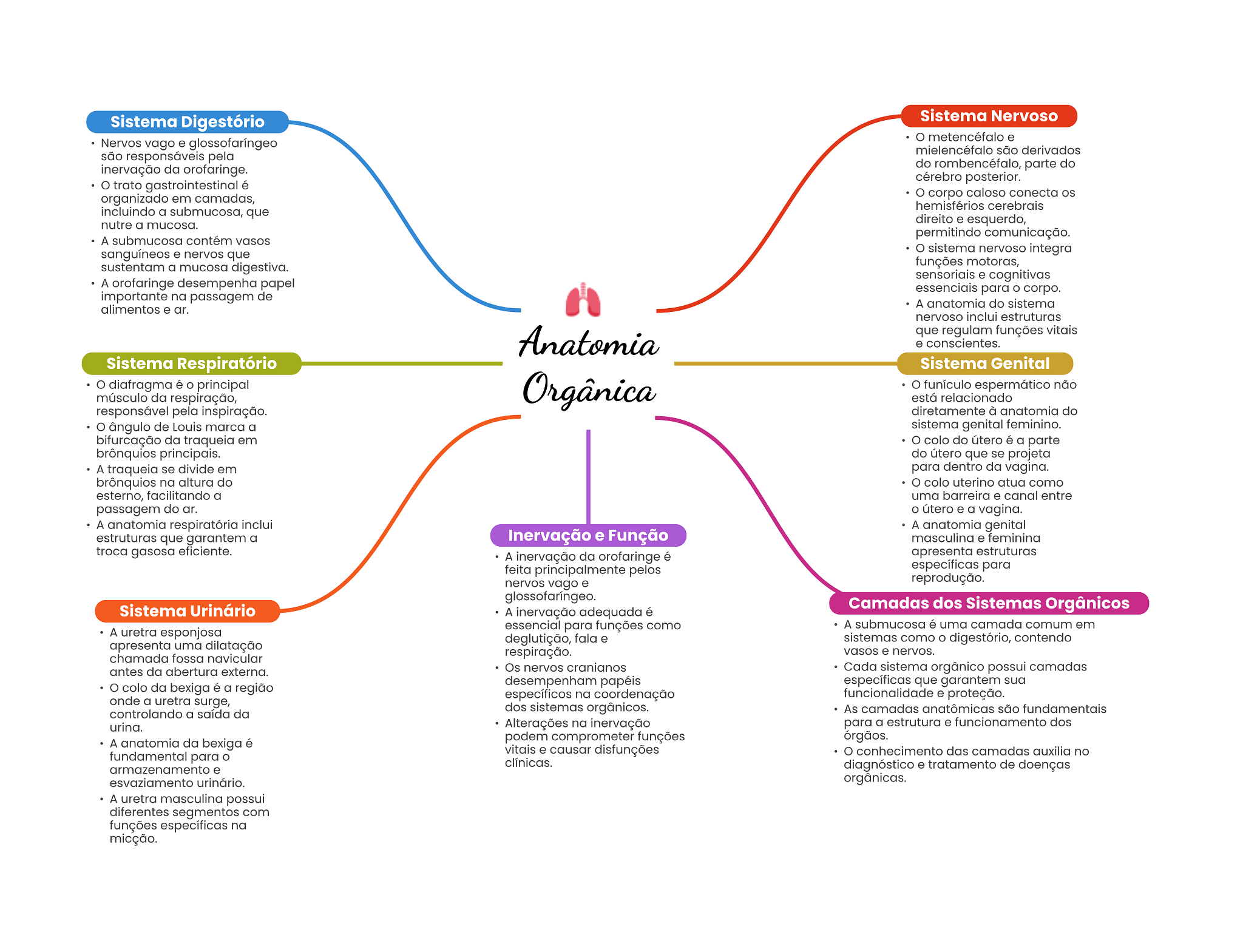 Sistema Digestório Sistema Nervoso metencéfalo e Nervos vago e glossofaríngeo mielencéfalo são derivados são responsáveis pela inervação da orofaringe. do rombencéfalo, parte do cérebro posterior. trato gastrointestinal é organizado em camadas, corpo caloso conecta os hemisférios cerebrais incluindo a submucosa, que nutre a mucosa. direito e esquerdo, permitindo comunicação. A submucosa contém vasos sanguíneos e nervos que O sistema nervoso integra sustentam a mucosa digestiva. funções motoras, sensoriais e cognitivas A desempenha papel essenciais para corpo. importante na passagem de A anatomia do sistema alimentos e ar. nervoso inclui estruturas Anatomia que regulam funções vitais e conscientes. Sistema Respiratório Sistema Genital diafragma é principal músculo da respiração, Orgânica funículo espermático não está relacionado responsável pela inspiração. diretamente à anatomia do ângulo de Louis marca a sistema genital feminino. bifurcação da traqueia em O colo do útero é a parte brônquios principais. do útero que se projeta A traqueia se divide em para dentro da vagina. brônquios na altura do O colo uterino atua como esterno, facilitando a uma barreira e canal entre passagem do ar. O útero e a vagina. A anatomia respiratória inclui A anatomia genital estruturas que garantem a Inervação e Função masculina e feminina troca gasosa eficiente. A inervação da orofaringe é apresenta estruturas feita principalmente pelos específicas para nervos vago e reprodução. glossofaringeo. Sistema Urinário Camadas dos Sistemas Orgânicos A inervação adequada é A uretra esponjosa essencial para funções como A submucosa é uma camada comum em deglutição, fala e sistemas como O digestório, contendo apresenta uma dilatação respiração. vasos e nervos. chamada fossa navicular antes da abertura externa. Os nervos cranianos Cada sistema orgânico possui camadas desempenham papéis específicas que garantem sua colo da bexiga é a região onde a uretra surge, específicos na coordenação funcionalidade e proteção. controlando a saída da dos sistemas orgânicos. As camadas anatômicas são fundamentais urina. Alterações na inervação para a estrutura e funcionamento dos podem comprometer funções órgãos. A anatomia da bexiga é fundamental para vitais e causar disfunções conhecimento das camadas auxilia no clínicas. armazenamento e diagnóstico e tratamento de doenças esvaziamento urinário. orgânicas. A uretra masculina possui diferentes segmentos com funções específicas na micção.