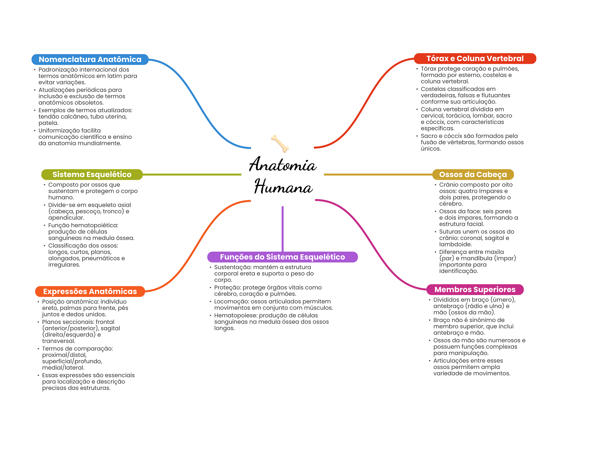 Nomenclatura Anatômica Tórax e Coluna Vertebral Padronização internacional dos Tórax protege coração e pulmões, termos anatômicos em latim para formado por esterno, costelas e evitar variações. coluna vertebral. Atualizações periódicas para Costelas classificadas em inclusão e exclusão de termos verdadeiras, falsas e flutuantes anatômicos obsoletos. conforme sua articulação. Exemplos de termos atualizados: Coluna vertebral dividida em tendão calcâneo, tuba uterina, cervical, torácica, lombar, sacro patela. e cóccix, com características Uniformização facilita específicas. comunicação científica e ensino Sacro e cóccix são formados pela da anatomia mundialmente. fusão de vértebras, formando únicos. Anatomia Sistema Esquelético Ossos da Cabeça Composto por OSSOS que Humana Crânio composto por oito sustentam e protegem corpo OSSOS: quatro ímpares e humano. dois pares, protegendo Divide-se em esqueleto axial cérebro. (cabeça, pescoço, tronco) e Ossos da face: seis pares apendicular. e dois formando a Função hematopoiética: estrutura facial. produção de células Suturas unem do sanguíneas na medula óssea. crânio: coronal, sagital e Classificação dos OSSOS: lambdoide. longos, curtos, planos, Diferença entre maxila alongados, pneumáticos e Funções do Sistema Esquelético (par) e mandíbula (ímpar) irregulares. Sustentação: mantém a estrutura importante para corporal ereta e suporta peso do identificação. corpo. Proteção: protege órgãos vitais como Expressões Anatômicas Membros Superiores cérebro, coração e pulmões. Posição anatômica: indivíduo Locomoção: articulados permitem Divididos em braço (úmero), ereto, palmas para frente, pés movimentos em conjunto com músculos. antebraço (rádio e ulna) e juntos e dedos unidos. Hematopoiese: produção de células mão (ossos da mão). Planos seccionais: frontal sanguíneas na medula óssea dos Braço não é sinônimo de (anterior/posterior), sagital longos. membro superior, que inclui (direita/esquerda) e antebraço e mão. transversal. Ossos da mão são numerosos e Termos de comparação: possuem funções complexas proximal/distal, para manipulação. superficial/profundo, Articulações entre esses medial/lateral. permitem ampla Essas expressões são essenciais variedade de movimentos. para localização e descrição precisas das estruturas.