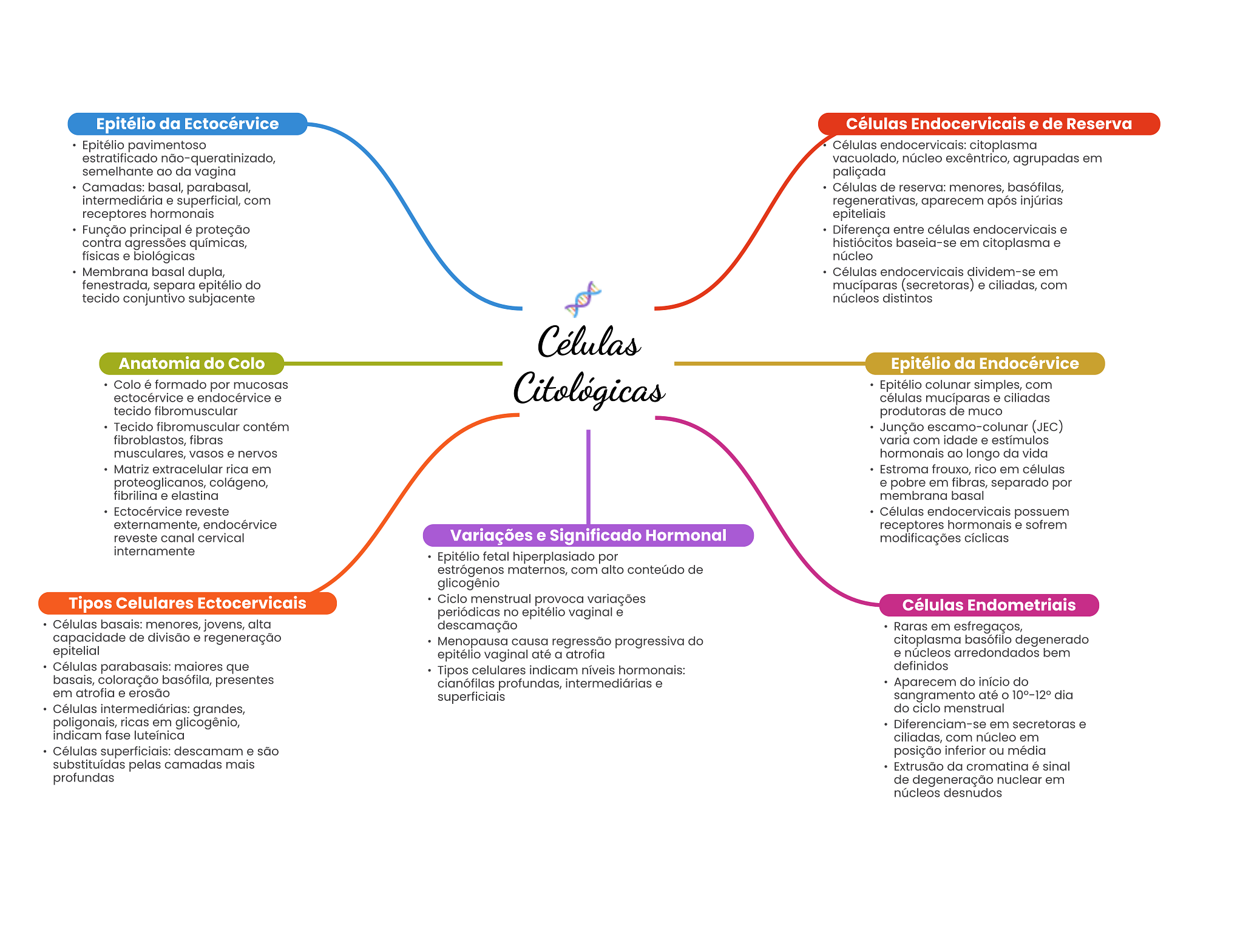 Epitélio da Ectocérvice Células Endocervicais e de Reserva Epitélio pavimentoso Células endocervicais: citoplasma estratificado não-queratinizado, vacuolado, núcleo excêntrico, agrupadas em semelhante ao da vagina Camadas: basal, parabasal, Células de reserva: menores, basófilas, intermediária e superficial, com regenerativas, aparecem após injúrias receptores hormonais epiteliais Função principal é proteção Diferença entre células endocervicais e contra agressões químicas, histiócitos baseia-se em citoplasma e físicas e biológicas núcleo Membrana basal dupla, Células endocervicais dividem-se em fenestrada, separa epitélio do mucíparas (secretoras) e ciliadas, com tecido conjuntivo subjacente núcleos distintos Células Anatomia do Colo Epitélio da Endocérvice Colo é formado por mucosas ectocérvice e endocérvice e Citológicas Epitélio colunar simples, com células mucíparas e ciliadas tecido fibromuscular produtoras de muco Tecido fibromuscular contém Junção escamo-colunar (JEC) fibroblastos, fibras varia com idade e estímulos musculares, vasos e nervos hormonais ao longo da vida Matriz extracelular rica em Estroma frouxo, rico em células proteoglicanos, colágeno, e pobre em fibras, separado por fibrilina e elastina membrana basal Ectocérvice reveste Células endocervicais possuem externamente, endocérvice receptores hormonais e sofrem reveste canal cervical Variações e Significado Hormonal modificações cíclicas internamente Epitélio fetal hiperplasiado por estrógenos maternos, com alto conteúdo de glicogênio Tipos Celulares Ectocervicais Ciclo menstrual provoca variações Células Endometriais periódicas no epitélio vaginal e Células basais: menores, jovens, alta descamação Raras em esfregaços, capacidade de divisão e regeneração Menopausa causa regressão progressiva do citoplasma basófilo degenerado epitelial epitélio vaginal até a atrofia e núcleos arredondados bem Células parabasais: maiores que Tipos celulares indicam níveis hormonais: definidos basais, coloração basófila, presentes cianófilas profundas, intermediárias e Aparecem do início do em atrofia e erosão superficiais sangramento até 10°-12° dia Células intermediárias: grandes, do ciclo menstrual poligonais, ricas em glicogênio, Diferenciam-se em secretoras e indicam fase luteínica ciliadas, com núcleo em Células superficiais: descamam e são posição inferior ou média substituídas pelas camadas mais Extrusão da cromatina é sinal profundas de degeneração nuclear em núcleos desnudos
