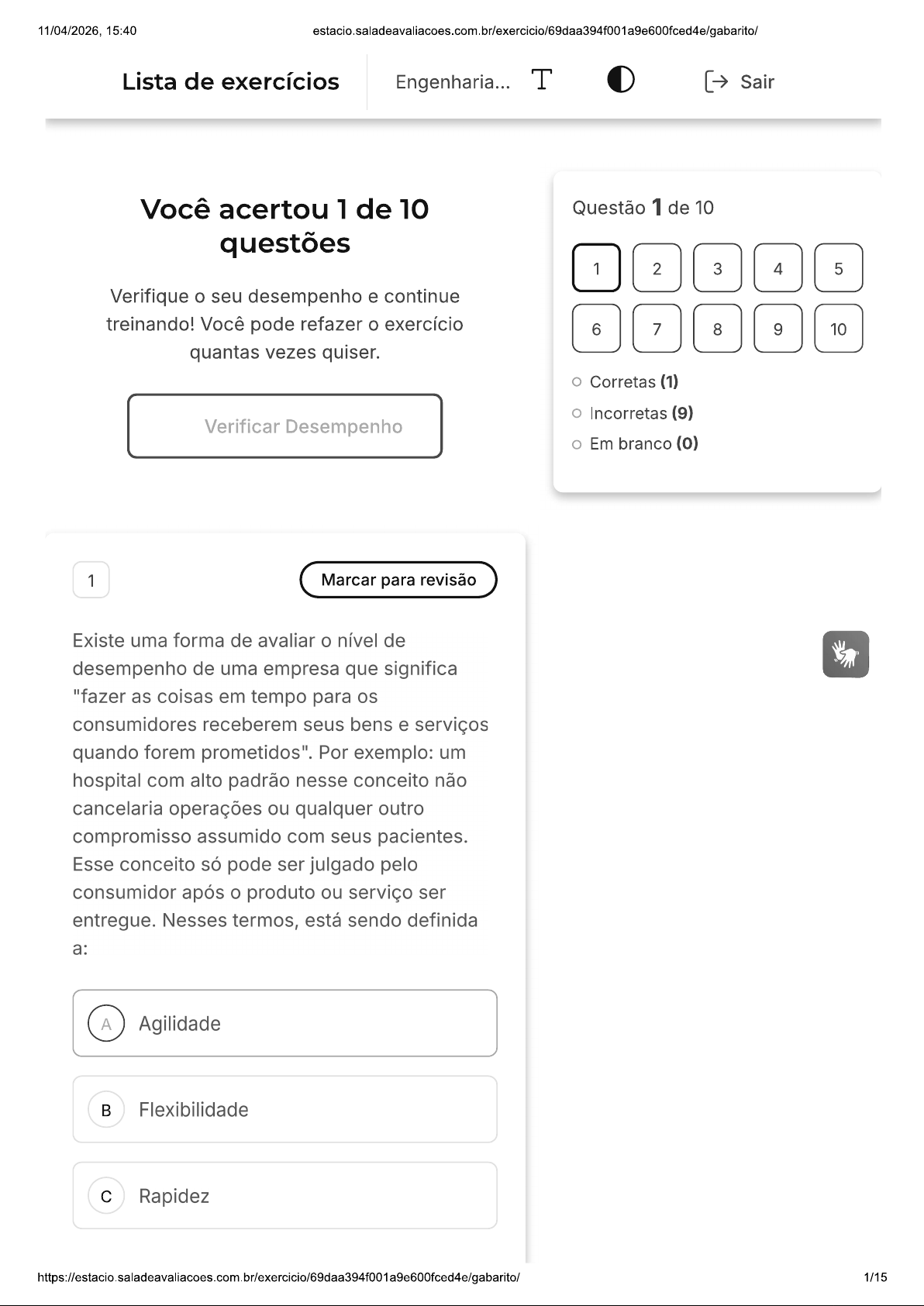 11/04/2026, 15:40 Lista de exercícios Engenharia... T Sair Você acertou 1 de 10 Questão 1 de 10 questões 1 2 3 4 5 Verifique seu desempenho e continue treinando! Você pode refazer exercício 6 7 8 9 10 quantas vezes quiser. Corretas (1) Incorretas (9) Verificar Desempenho Em branco (0) 1 Marcar para revisão Existe uma forma de avaliar nível de desempenho de uma empresa que significa "fazer as coisas em tempo para os consumidores receberem seus bens e serviços quando forem prometidos". Por exemplo: um hospital com alto padrão nesse conceito não cancelaria operações ou qualquer outro compromisso assumido com seus pacientes. Esse conceito só pode ser julgado pelo consumidor após produto ou serviço ser entregue. Nesses termos, está sendo definida a: A Agilidade Flexibilidade c Rapidez 1/1511/04/2026, 15:40 D Confiabilidade E Pontualidade X Resposta incorreta Opa! A alternativa correta é a letra D. Confira gabarito comentado! Gabarito Comentado conceito descrito no enunciado refere-se à "Confiabilidade". Isso porque a confiabilidade é a capacidade de uma empresa de cumprir suas promessas e compromissos, entregando produtos ou serviços no tempo prometido aos consumidores. No exemplo dado, um hospital que não cancela operações ou compromissos assumidos com seus pacientes demonstra alta confiabilidade. Portanto, a alternativa correta é a "D", que corresponde à "Confiabilidade". 2 Marcar para revisão Acerca da gestão de manutenção de equipamentos industriais, julgue as afirmações a seguir: I. Para melhor gestão da manutenção de seus equipamentos, as indústrias devem monitorar consumo e o armazenamento das peças utilizadas e de reposição, por meio de sistemas de informação de gestão de materiais. II. A evolução das tecnologias empregadas nas máquinas e a consequente evolução dos programas de manutenção contribuíram para 2/1511/04/2026, 15:40 estacio.saladeavaliacoes.com.br/exercicio/69daa394f001a9e600fced4e/gabarito/ aumento da vida útil das máquinas e para a diminuição dos custos de produção. Entre os procedimentos de manutenção preventiva de um equipamento, incluem-se troca periódica de peças, limpeza, lubrificação e outras rotinas de manutenção para eliminar possíveis falhas do equipamento. III. Por causar impactos relevantes na produção, a manutenção corretiva não deve ser adotada para equipamentos com alto grau de complexidade. É correto que se afirma em: A c D e III E I, e III X Resposta incorreta Opa! A alternativa correta é a letra E. Confira o gabarito comentado! Gabarito Comentado As afirmações I, e III estão corretas. verdade que monitoramento do consumo e armazenamento de peças é fundamental para a manutenção eficaz dos equipamentos industriais. A falta de peças de reposição pode levar a paralisações 3/1511/04/2026, 15:40 estacio.saladeavaliacoes.com.br/exercicio/69daa394f001a9e600fced4e/gabarito/ inesperadas, afetando a produção. Os sistemas de informação de gestão de materiais auxiliam nesse controle, otimizando estoque e a aquisição de peças. II. Também é verdade que a evolução tecnológica tem contribuído para a melhoria dos programas de manutenção, aumentando a vida útil dos equipamentos e reduzindo os custos de produção. A manutenção preventiva, que inclui ações como limpeza, lubrificação e troca de peças, é essencial para prevenir falhas e garantir o bom funcionamento dos equipamentos. III. A manutenção corretiva, que consiste na correção de falhas após sua ocorrência, pode causar impactos significativos na produção, especialmente em equipamentos de alta complexidade. Esses equipamentos podem exigir períodos prolongados de inatividade para reparos, gerando custos elevados e possíveis riscos à segurança. Portanto, é preferível adotar a manutenção preventiva ou preditiva para esses equipamentos, embora a manutenção corretiva possa ser necessária em situações imprevistas. 3 Marcar para revisão Assinale a opção que apresenta a conceituação correta de confiabilidade. 4/1511/04/2026, 15:40 Fração ou percentual do tempo em que um componente ou sistema A encontra-se disponível para atender de forma satisfatória a uma demanda de funcionamento. Característica inerente a um projeto de sistema ou produto que se refere à facilidade, precisão, segurança e economia na execução de ações de manutenção nesse sistema ou produto. Aplicação de conceitos relativos à otimização dos equipamentos, dos c processos e dos orçamentos, de modo a alcançar uma melhor disponibilidade dos equipamentos. Gestão econômica de bens, assim considerada a ciência aplicada para D medir os valores operacionais de ativos fixos ou físicos. Probabilidade de que componente ou sistema desempenhe com sucesso suas funções, por um período e com condições especificadas, possuir E natureza probabilística, apresentar dependência temporal, depender do critério de sucesso considerado e variar em função das condições de operação. X Resposta incorreta A alternativa correta é a letra Confira o gabarito comentado! 5/1511/04/2026, 15:40 Gabarito Comentado A alternativa correta é a A confiabilidade é definida como a probabilidade de que um componente ou sistema desempenhe com sucesso suas funções, por um período e com condições especificadas. Esta definição possui natureza probabilística, apresenta dependência temporal, depende do critério de sucesso considerado e varia em função das condições de operação. As outras alternativas, embora possam estar relacionadas com a gestão e manutenção de sistemas ou componentes, não definem corretamente conceito de confiabilidade. 4 Marcar para revisão Com relação à manutenção mecânica, analise as proposições a seguir: I. Manutenção corretiva é a manutenção efetuada após a ocorrência de uma falha, destinada a colocar um item em condições de executar uma função requerida. II. Manutenção pre