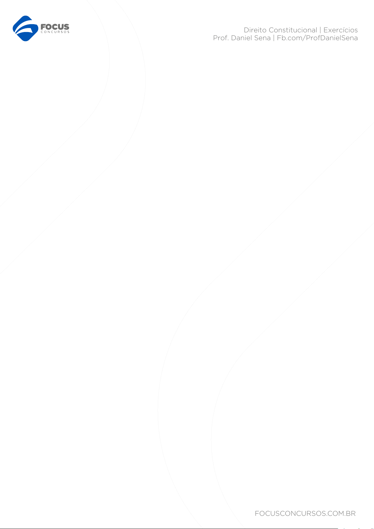 Direito Constitucional | Exercícios Prof. Daniel Sena | Fb.com/ProfDanielSena FOCUSCONCURSOS.COM.BR PODER EXECUTIVO, PODER LEGISLATIVO, PODER JUDICIÁRIO, FUNÇÕES ESSENCIAIS À JUSTIÇA, ADMINISTRAÇÃO PÚBLICA E ORDEM SOCIAL 1. (CESPE/ANVISA/2016) Nos termos da CF, um ente federativo terá o direito de secessão, isto é, de desagregar-se da Federação, seja em caso de crise institucional, seja por decisão da população diretamente interessada, mediante plebiscito. 2. (CESPE/ANVISA/2016) Apesar de não possuírem sua própria Constituição, os municípios, em simetria com os estados, desempenham as funções dos Poderes Executivo, Judiciário e Legislativo, em razão da autonomia administrativa estabelecida no texto da CF. 3. (CESPE/ANVISA/2016) Em caso de desmembramento de município, faz-se necessária consulta por meio de plebiscito, tanto à população do território remanescente como, também, à daquele a ser desmembrado. 4. (CESPE/ANVISA/2016) Situação hipotética: O estado de Minas Gerais editou norma geral sobre matéria de competência concorrente, ante a ausência de norma geral editada pela União. Todavia, meses depois, a União promulgou lei estabelecendo normas gerais acerca da matéria. Assertiva: Nessa situação, a lei estadual terá sua eficácia suspensa naquilo que for contrária à lei federal. 5. (CESPE/PGE-AM/2016) Acerca do regime constitucional de distribuição de competências normativas, julgue o item subsequente. No âmbito das competências concorrentes, lei federal sobre normas gerais suspende a eficácia de lei estadual superveniente, no que esta lhe for contrária. 6. (CESPE/TCE-PA/2016) A fusão de dois municípios depende de consulta prévia, mediante plebiscito, das respectivas populações, após divulgação dos estudos de viabilidade municipal. 7. (CESPE/TCE-PA/2016) O estado do Pará pode explorar diretamente, ou mediante concessão, os serviços locais de gás canalizado, não podendo a regulamentação da exploração ocorrer por meio de medida provisória. Acerca da organização do Estado, julgue o item subsecutivo. 8. (CESPE/TCE-PA/2016) Compete privativamente à União legislar sobre direito civil, comercial e financeiro. 9. (CESPE/TCE-PA/2016) Os estados-membros, mediante lei ordinária específica, podem instituir regiões metropolitanas, constituídas por agrupamentos de municípios, para integrar a organização, o planejamento e a execução de funções públicas de interesse comum. 10. (CESPE/DPU/2016) No que se refere à proteção e à defesa da saúde, a União exerce competência legislativa concorrente, cabendo-lhe o estabelecimento de normas gerais. 11. (CESPE/DPU/2016) Com base nas disposições da Constituição Federal de 1988, julgue o item subsequente. 1 Direito Constitucional | Exercícios Prof. Daniel Sena | Fb.com/ProfDanielSena FOCUSCONCURSOS.COM.BR O Congresso Nacional poderá editar lei complementar para a fusão de dois estados em um novo, desde que as populações diretamente interessadas aprovem a fusão mediante plebiscito. 12. (CESPE/TCE-RN/2015) Compete aos municípios criar, organizar e suprimir distritos, desde que observada a legislação estadual. 13. (CESPE/TCE-RN/2015) Por possuírem autonomia política, os territórios federais têm sua criação, transformação em estado ou reintegração ao estado de origem dependente da aprovação, por plebiscito, da população diretamente interessada e da ratificação do Congresso Nacional. 14. (CESPE/FUB/2016) Legalidade, impessoalidade, moralidade, publicidade e eficiência são princípios aplicáveis exclusivamente à administração pública federal: eles não se aplicam à administração pública dos estados, do Distrito Federal nem dos municípios. 15. (CESPE/FUB/2016) Com referência à Constituição Federal de 1988 e às disposições nela inscritas relativamente a direitos sociais e políticos, administração pública e servidores públicos, julgue o item subsequente. Com exceção de casos específicos previstos em lei, a administração pública deve realizar processo de licitação para a contratação de obras, serviços, compras e alienações. 16. (CESPE/FUB/2016) Com referência à Constituição Federal de 1988 e às disposições nela inscritas relativamente a direitos sociais e políticos, administração pública e servidores públicos, julgue o item subsequente. Diferentemente do que ocorre com os trabalhadores da iniciativa privada, a Constituição Federal de 1988 não assegura ao servidor público o direito de greve nem o de livre associação sindical. 17. (CESPE/FUB/2016) Diferentemente dos cargos em comissão, as funções de confiança somente podem ser preenchidas por servidores ocupantes de cargo efetivo. 18. (CESPE/FUB/2016) A União, os estados, o Distrito Federal e os municípios devem, obrigatoriamente, instituir, no âmbito de sua competência, regime jurídico único aplicável tanto aos servidores da administração direta quanto aos das autarquias, empresas públicas, fundações e sociedades de economia mista. 19. (CESPE/FUB/2016) Segundo a CF, o concurso público é válido por dois anos e prorrogável uma vez por igual período, e a estabilidade do servidor nomeado em cargo de provimento efetivo somente se verificará após este exercer três anos de atividade no cargo. 20. (CESPE/ANVISA/2016) A pessoa jurídica de direito público responderá pelos danos que seu agente público causar a terceiros, sendo assegurado a ela o direito de regresso contra o servidor responsável apenas em caso de dolo. 21. (CESPE/FUNPRESP/2016) Conforme o entendimento do STF, dada a ausência da referida lei complementar, aplicam-se as regras do regime geral de previdência social à aposentadoria especial do servidor público. 2 Direito Constitucional | Exercícios Prof. Daniel Sena | Fb.com/ProfDanielSena FOCUSCONCURSOS.COM.BR 22. (CESPE/TCE-PA/2016) De acordo com a legislação federal, mediante emenda constitucional, a aposent