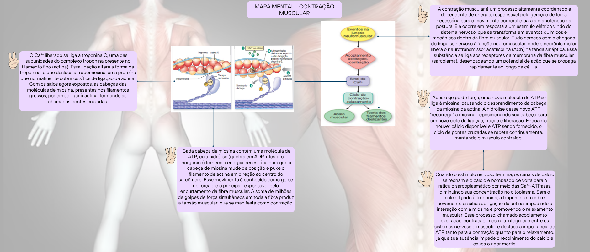 dependente de energia, pela geração de força necessária para O movimento corporal e para a manutenção postura. Ela ocorre em resposta a um estímulo elétrico vindo Eventos na junção sistema nervoso, que se transforma em eventos químicos e neuromuscular mecânicos dentro da fibra muscular. Tudo começa com a cheg do impulso nervoso junção neuromuscular, onde O neurônio m libera neurotransmissor acetilcolina (ACh) na fenda sináptica. Troponina Actina G liberado se liga à troponina uma das expondo 0 sitio Acoplamento substância se liga aos receptores da membrana da fibra muscu presente subunidades do complexo troponina presente no excitação- de actina contração (sarcolema), desencadeando um potencial de ação que se prop ilamento fino (actina). Essa ligação altera a forma da rapidamente ao longo da célula. oponina, que desloca a tropomiosina, uma proteína Cabeça actina normalmente cobre sítios de ligação da actina. miosina movida Sinal de Com os sítios agora expostos, as cabeças das Movimento moléculas de miosina, presentes nos filamentos de força grossos, podem se ligar à actina, formando as Ciclo de contração- Após golpe de força, uma nova molécula de ATP se chamadas pontes cruzadas. liga à miosina, causando desprendimento da cabeça da miosina da actina. A hidrólise desse novo ATP Abalo Teoria dos filamentos "recarrega" a miosina, reposicionando sua cabeça para muscular deslizantes um novo ciclo de ligação, tração e liberação. Enquanto houver cálcio disponível e ATP sendo fornecido, O ciclo de pontes cruzadas se repete continuamente, mantendo músculo contraído. Cada cabeça de miosina contém uma molécula de cuja hidrólise (quebra em ADP + fosfato inorgânico) fornece a energia necessária para que a cabeça de miosina mude de posição e puxe O filamento de actina em direção ao centro do Quando estímulo nervoso termina, canais de cálcio sarcômero. Esse movimento é conhecido como golpe se fecham e O cálcio é bombeado de volta para O de força e é O principal responsável pelo retículo sarcoplasmático por meio das encurtamento da fibra muscular. A soma de milhões diminuindo sua concentração no citoplasma. Sem de golpes de força simultâneos em toda a fibra produz cálcio ligado à troponina, a tropomiosina cobre a tensão muscular, que se manifesta como contração. novamente sítios de ligação da actina, impedindo a interação com a miosina e promovendo O relaxamento muscular. Esse processo, chamado acoplamento excitação-contração, mostra a integração entre sistemas nervoso e muscular e destaca a importância do ATP tanto para a contração quanto para O relaxamento, já que sua ausência impede recolhimento do cálcio e