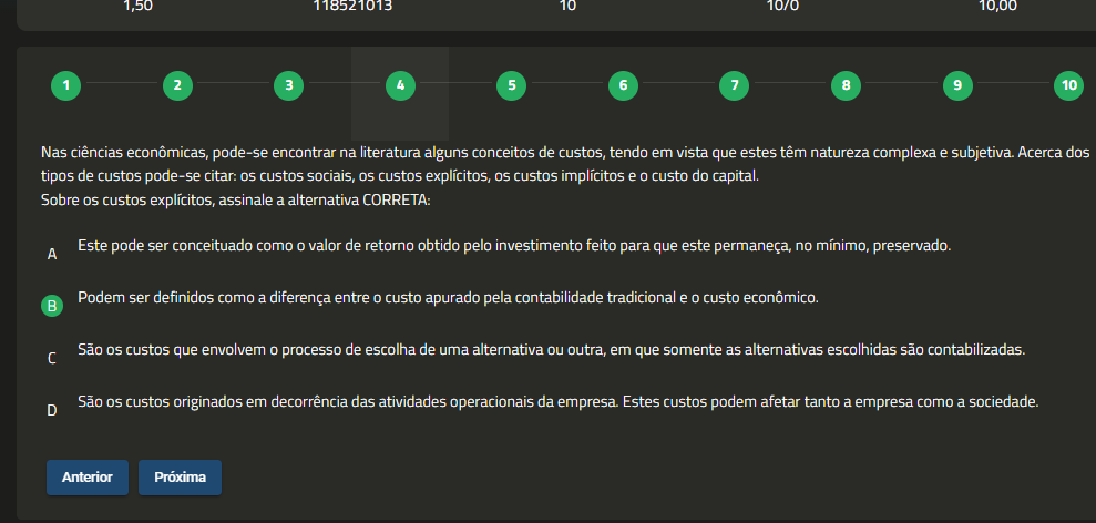 1,50 118521013 10 10/0 10,00 1 2 3 4 5 6 7 8 9 10 Nas ciências econômicas, pode-se encontrar na literatura alguns conceitos de custos, tendo em vista que estes têm natureza complexa e subjetiva. Acerca dos tipos de custos pode-se citar: custos sociais, custos explícitos, custos implícitos e 0 custo do capital. Sobre custos explícitos, assinale a alternativa CORRETA: A Este pode ser conceituado como 0 valor de retorno obtido pelo investimento feito para que este permaneça, no mínimo, preservado. B Podem ser definidos como a diferença entre 0 custo apurado pela contabilidade tradicional e 0 custo econômico. C São custos que envolvem processo de escolha de uma alternativa ou outra, em que somente as alternativas escolhidas são contabilizadas. D São custos originados em decorrência das atividades operacionais da empresa. Estes custos podem afetar tanto a empresa como a sociedade. Anterior Próxima