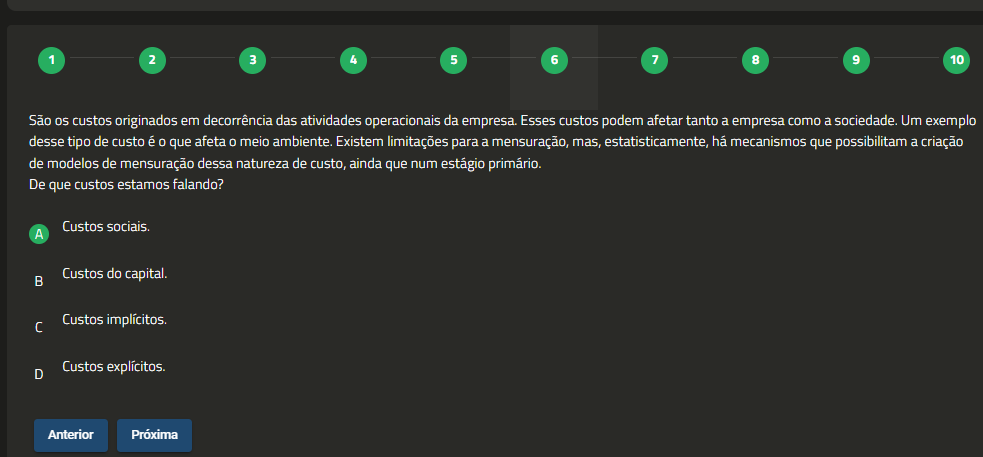 1 2 3 4 5 6 7 8 9 10 São custos originados em decorrência das atividades operacionais da empresa. Esses custos podem afetar tanto a empresa como a sociedade. Um exemplo desse tipo de custo é 0 que afeta 0 meio ambiente. Existem limitações para a mensuração, mas, estatisticamente, mecanismos que possibilitam a criação de modelos de mensuração dessa natureza de custo, ainda que num estágio primário. De que custos estamos falando? Custos sociais. A B Custos do capital. C Custos D Custos explícitos. Anterior Próxima