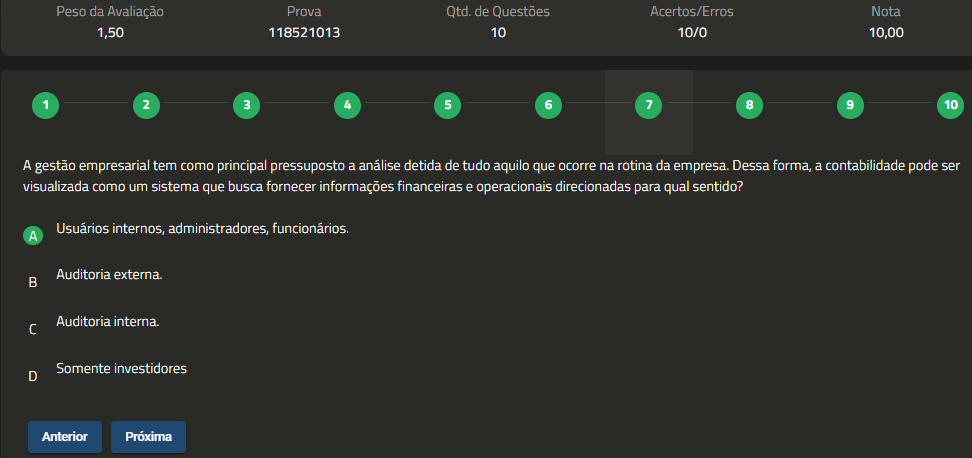 Peso da Avaliação Prova Qtd. de Questões Acertos/Erros Nota 1,50 118521013 10 10/0 10,00 1 2 3 4 5 6 7 8 9 10 A gestão empresarial tem como principal pressuposto a análise detida de tudo aquilo que ocorre na rotina da empresa. Dessa forma, a contabilidade pode ser visualizada como um sistema que busca fornecer informações financeiras e operacionais direcionadas para qual sentido? A Usuários internos, administradores, funcionários. Auditoria externa. B Auditoria interna. C Somente investidores D Anterior Próxima