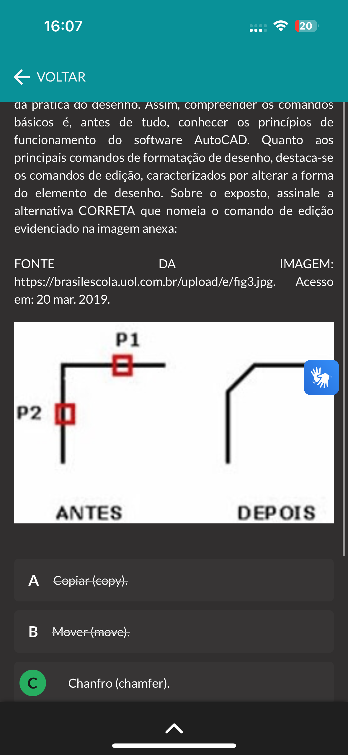 16:07 20 VOLTAR da pratica do desenho. Assim, compreender os comandos básicos é, antes de tudo, conhecer os princípios de funcionamento do software AutoCAD. Quanto aos principais comandos de formatação de desenho, destaca-se os comandos de edição, caracterizados por alterar a forma do elemento de desenho. Sobre exposto, assinale a alternativa CORRETA que nomeia o comando de edição evidenciado na imagem anexa: FONTE DA IMAGEM: https://brasilescola.uol.com.br/upload/e/fig3.jpg Acesso em: 20 mar. 2019. P1 P2 ANTES DEPOIS A Chanfro (chamfer).