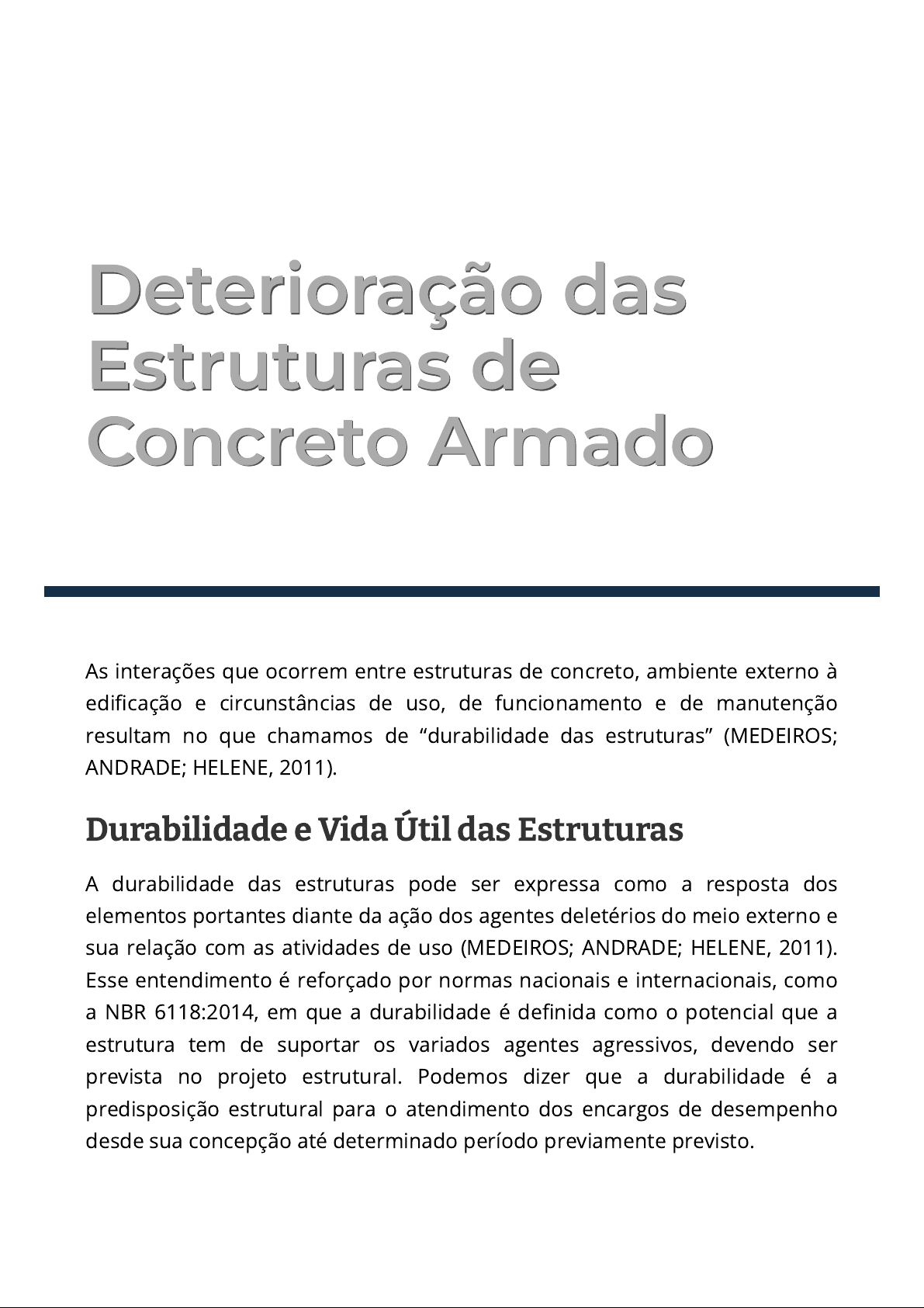 As interações que ocorrem entre estruturas de concreto, ambiente externo à edificação e circunstâncias de uso, de funcionamento e de manutenção resultam no que chamamos de “durabilidade das estruturas” (MEDEIROS; ANDRADE; HELENE, 2011). Durabilidade e Vida Útil das Estruturas A durabilidade das estruturas pode ser expressa como a resposta dos elementos portantes diante da ação dos agentes deletérios do meio externo e sua relação com as atividades de uso (MEDEIROS; ANDRADE; HELENE, 2011). Esse entendimento é reforçado por normas nacionais e internacionais, como a NBR 6118:2014, em que a durabilidade é definida como o potencial que a estrutura tem de suportar os variados agentes agressivos, devendo ser prevista no projeto estrutural. Podemos dizer que a durabilidade é a predisposição estrutural para o atendimento dos encargos de desempenho desde sua concepção até determinado período previamente previsto. Deterioração dasDeterioração das Estruturas deEstruturas de Concreto ArmadoConcreto Armado