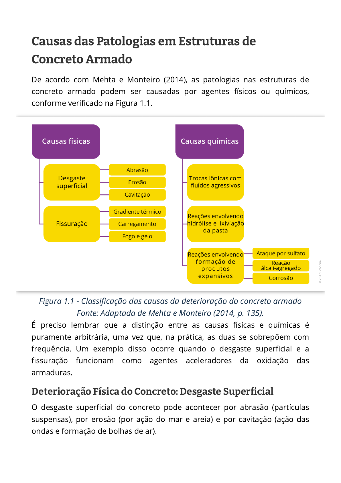 Causas das Patologias em Estruturas de Concreto Armado De acordo com Mehta e Monteiro (2014), as patologias nas estruturas de concreto armado podem ser causadas por agentes físicos ou químicos, conforme verificado na Figura 1.1. É preciso lembrar que a distinção entre as causas físicas e químicas é puramente arbitrária, uma vez que, na prática, as duas se sobrepõem com frequência. Um exemplo disso ocorre quando o desgaste superficial e a fissuração funcionam como agentes aceleradores da oxidação das armaduras. Deterioração Física do Concreto: Desgaste Superficial O desgaste superficial do concreto pode acontecer por abrasão (partículas suspensas), por erosão (por ação do mar e areia) e por cavitação (ação das ondas e formação de bolhas de ar). Figura 1.1 - Classificação das causas da deterioração do concreto armado Fonte: Adaptada de Mehta e Monteiro (2014, p. 135).