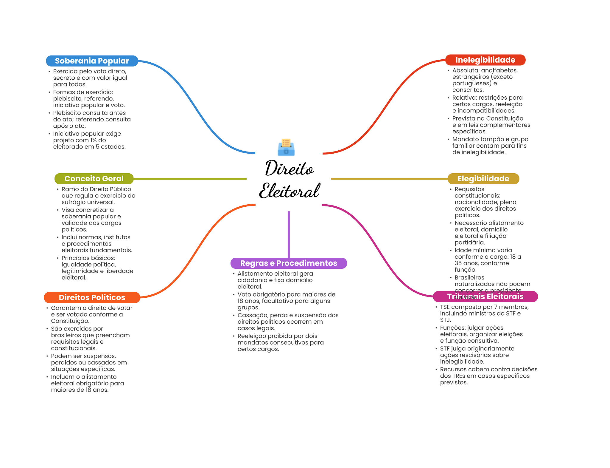 Soberania Popular Inelegibilidade Exercida pelo voto direto, Absoluta: analfabetos, secreto e com valor igual estrangeiros (exceto para todos. portugueses) e Formas de exercício: conscritos. plebiscito, referendo, Relativa: restrições para iniciativa popular e voto. certos cargos, reeleição Plebiscito consulta antes e incompatibilidades. do ato; referendo consulta Prevista na Constituição após ato. e em leis complementares Iniciativa popular exige específicas. projeto com 1% do Mandato tampão e grupo eleitorado em 5 estados. familiar contam para fins de inelegibilidade. Direito Conceito Geral Elegibilidade Ramo do Direito Público Eleitoral Requisitos que regula exercício do constitucionais: sufrágio universal. nacionalidade, pleno Visa concretizar a exercício dos direitos soberania popular e políticos. validade dos cargos Necessário alistamento políticos. eleitoral, domicílio Inclui normas, institutos eleitoral e filiação e procedimentos partidária. eleitorais fundamentais. Idade mínima varia Princípios básicos: conforme cargo: 18 a igualdade política, Regras e Procedimentos 35 anos, conforme legitimidade e liberdade função. Alistamento eleitoral gera eleitoral. cidadania e fixa domicílio Brasileiros eleitoral. naturalizados não podem presidente Direitos Políticos Voto obrigatório para maiores de Tribunais Eleitorais 18 anos, facultativo para alguns Garantem direito de votar grupos. TSE composto por 7 membros, e ser votado conforme a Cassação, perda e suspensão dos incluindo ministros do STF e Constituição. direitos políticos ocorrem em STJ. São exercidos por casos legais. Funções: julgar ações brasileiros que preencham Reeleição proibida por dois eleitorais, organizar eleições requisitos legais e mandatos consecutivos para e função consultiva. constitucionais. certos cargos. STF julga originariamente Podem ser suspensos, ações rescisórias sobre perdidos ou cassados em inelegibilidade. situações específicas. Recursos cabem contra decisões Incluem alistamento dos TREs em casos específicos eleitoral obrigatório para previstos. maiores de 18 anos.