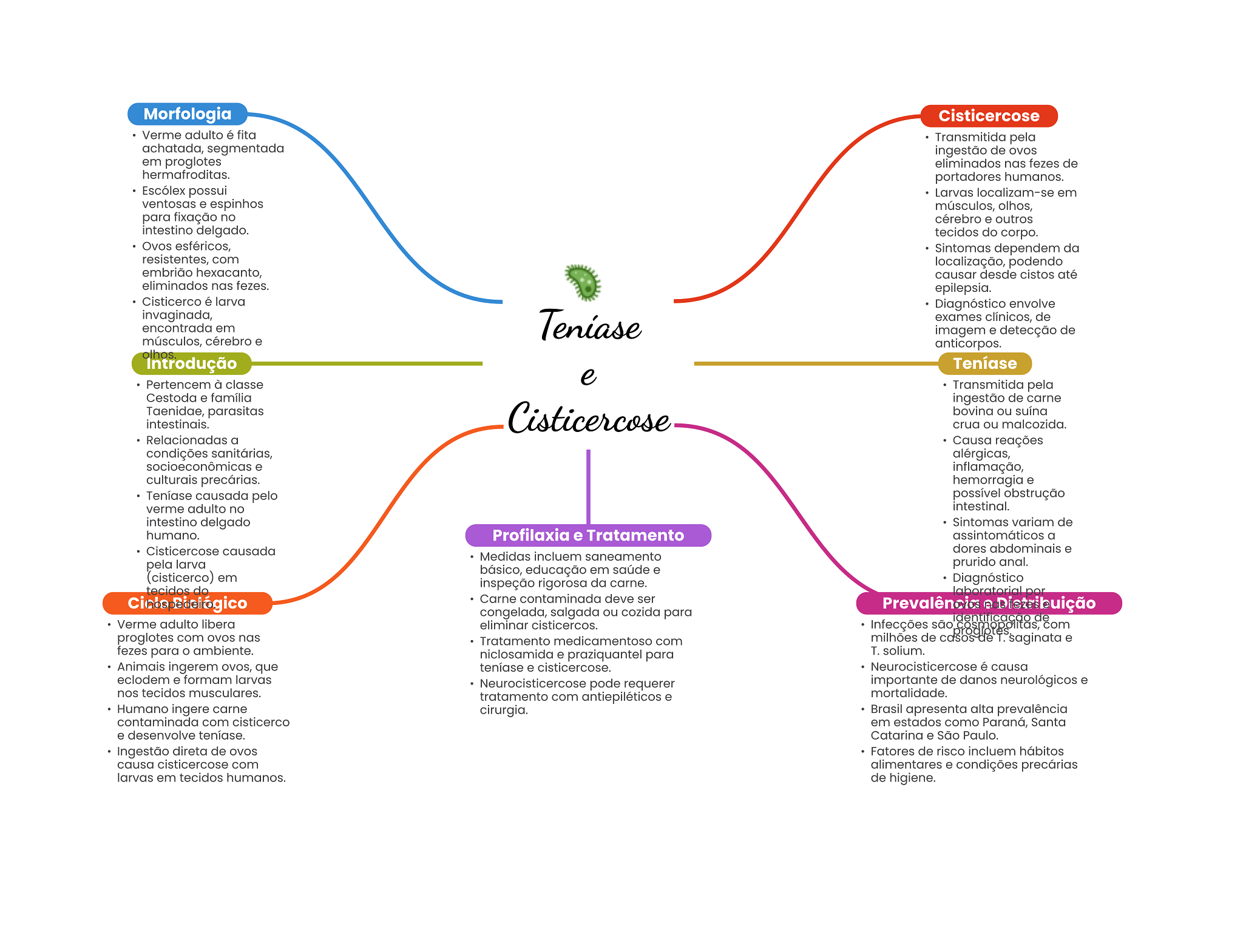 Morfologia Cisticercose Verme adulto é fita Transmitida pela achatada, segmentada ingestão de ovos em proglotes eliminados nas fezes de hermafroditas. portadores humanos. Escólex possui Larvas localizam-se em ventosas e espinhos músculos, olhos, para fixação no cérebro e outros intestino delgado. tecidos do corpo. Ovos esféricos, Sintomas dependem da resistentes, com localização, podendo embrião hexacanto, causar desde cistos até eliminados nas fezes. epilepsia. Cisticerco é larva Diagnóstico envolve invaginada, encontrada em Teníase exames clínicos, de imagem e detecção de músculos, cérebro e anticorpos. olhos Introdução Teníase Pertencem à classe e Transmitida pela Cestoda e família ingestão de carne Taenidae, parasitas intestinais. Cisticercose bovina ou suína crua ou malcozida. Relacionadas a Causa reações condições sanitárias, alérgicas, socioeconômicas e inflamação, culturais precárias. hemorragia e Teníase causada pelo possível obstrução verme adulto no intestinal. intestino delgado Sintomas variam de humano. Profilaxia e Tratamento assintomáticos a Cisticercose causada dores abdominais e Medidas incluem saneamento pela larva prurido anal. (cisticerco) em básico, educação em saúde e inspeção rigorosa da carne. Diagnóstico tecidos do laboratorial por Carne contaminada deve ser Prevalência Dietribuição congelada, salgada ou cozida para identificação de Verme adulto libera eliminar cisticercos. Infecções são cosmopolitas, com proglotes com ovos nas Tratamento com milhões de casos de e fezes para ambiente. niclosamida e praziquantel para T. solium. Animais ingerem ovos, que teníase e cisticercose. Neurocisticercose é causa eclodem e formam larvas Neurocisticercose pode requerer importante de danos neurológicos e nos tecidos musculares. tratamento com antiepiléticos e mortalidade. Humano ingere carne cirurgia. Brasil apresenta alta prevalência contaminada com cisticerco em estados como Paraná, Santa e desenvolve teníase. Catarina e São Paulo. Ingestão direta de ovos Fatores de risco incluem hábitos causa cisticercose com alimentares e condições precárias larvas em tecidos humanos. de higiene.