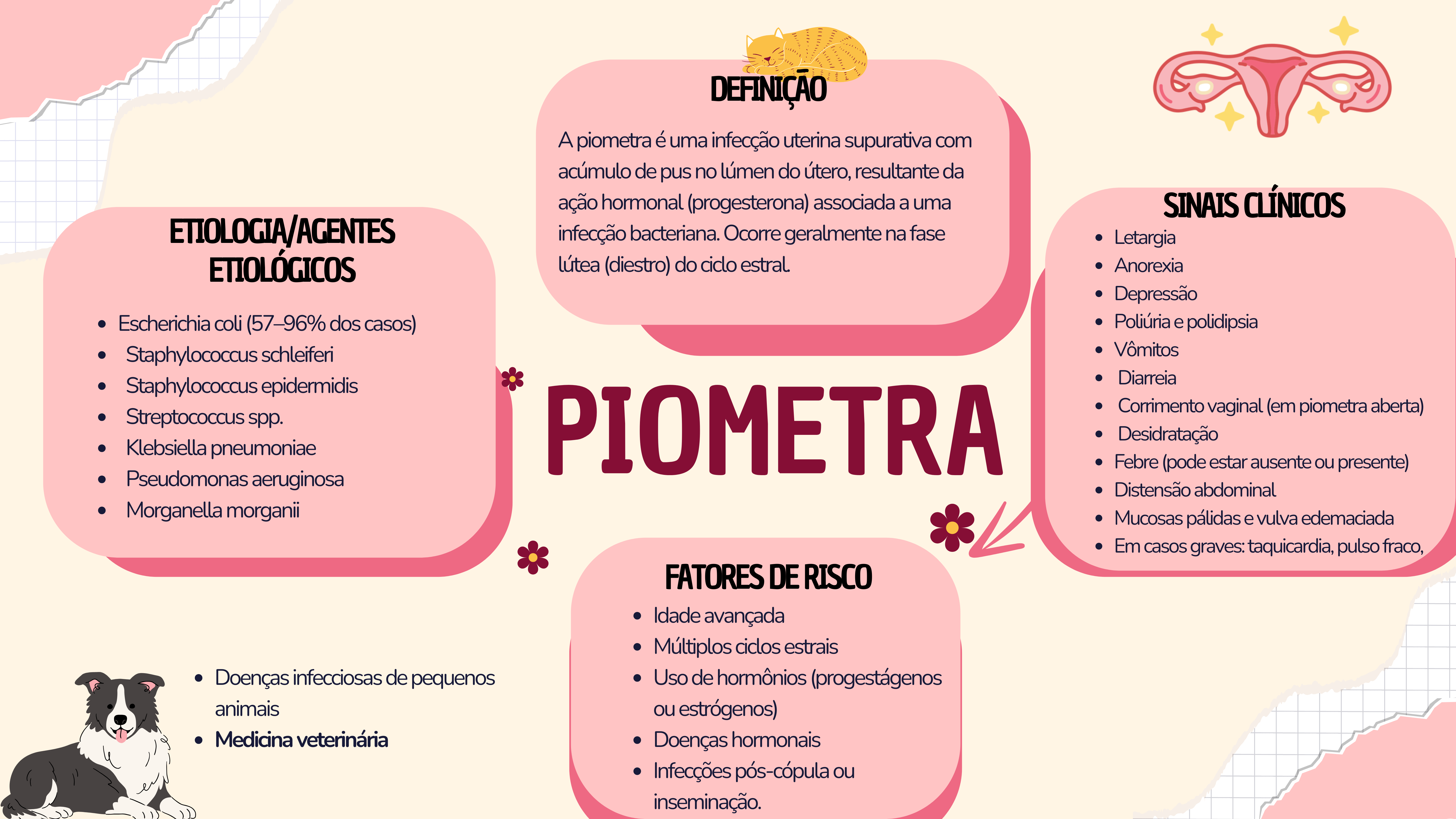 DEFINIÇÃO A piometra é uma infecção uterina supurativa com acúmulo de pus no lúmen do útero, resultante da ação hormonal (progesterona) associada a uma SINAIS CLÍNICOS ETIOLOGIA/AGENTES infecção bacteriana. Ocorre geralmente na fase Letargia ETIOLÓGICOS lútea (diestro) do ciclo estral. Anorexia Depressão Escherichia coli (57-96% dos casos) Poliúria e polidipsia Staphylococcus schleiferi Vômitos Staphylococcus epidermidis Diarreia Streptococcus spp. PIOMETRA Corrimento vaginal (em piometra aberta) Desidratação Klebsiella pneumoniae Febre (pode estar ausente ou presente) Pseudomonas aeruginosa Distensão abdominal Morganella morganii Mucosas pálidas e vulva edemaciada Em casos graves: taquicardia, pulso fraco, FATORES DE RISCO Idade avançada Múltiplos ciclos estrais Doenças infecciosas de pequenos Uso de hormônios (progestágenos animais ou estrógenos) Medicina veterinária Doenças hormonais Infecções pós-cópula ou inseminação.