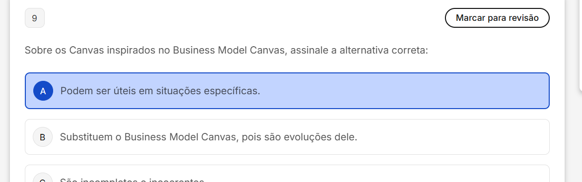 9 Marcar para revisão Sobre Canvas inspirados no Business Model Canvas, assinale a alternativa correta: A Podem ser úteis em situações específicas. B Substituem O Business Model Canvas, pois são evoluções dele.