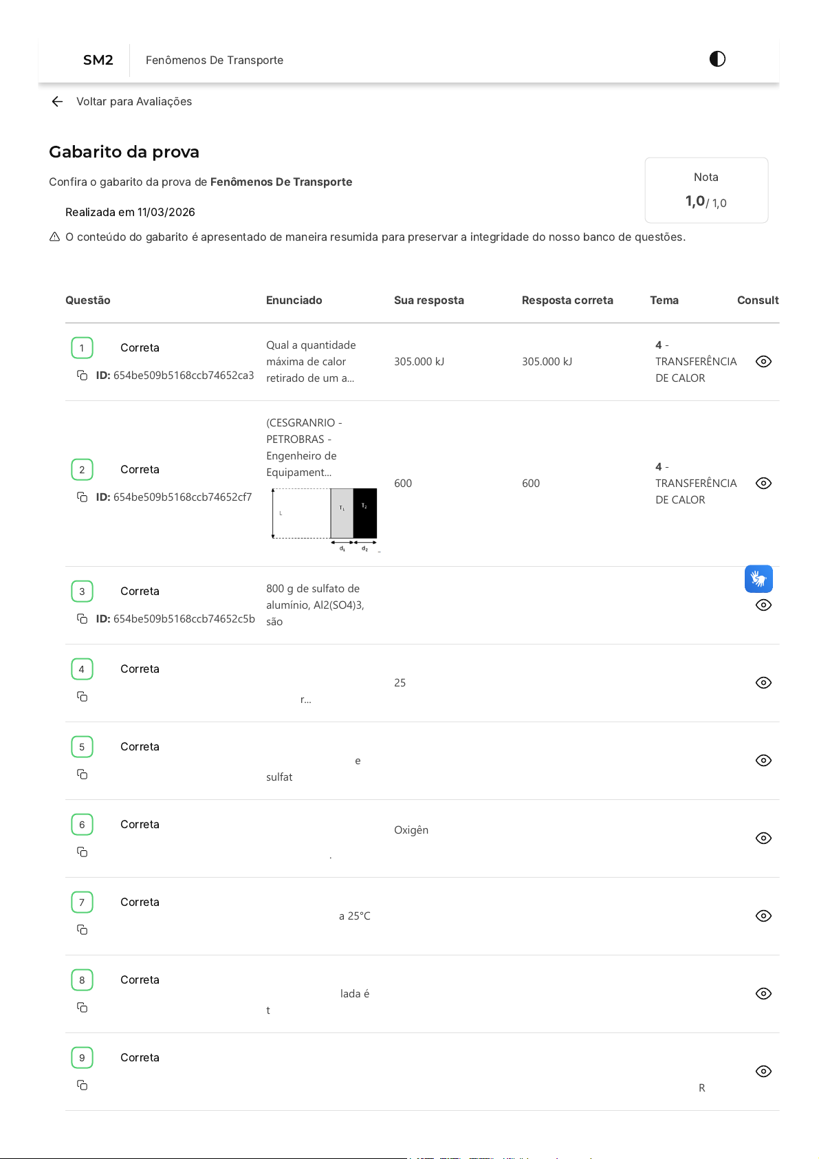 11/03/26, 22:56 estacio.saladeavaliacoes.com.br/prova/69b21c355a8ea69f0403f2ab/gabarito/reduzido/ https://estacio.saladeavaliacoes.com.br/prova/69b21c355a8ea69f0403f2ab/gabarito/reduzido/ 1/2 Voltar para Avaliações Gabarito da prova Confira o gabarito da prova de Fenômenos De Transporte Realizada em 11/03/2026 Nota 1,0/ 1,0 O conteúdo do gabarito é apresentado de maneira resumida para preservar a integridade do nosso banco de questões. Questão Enunciado Sua resposta Resposta correta Tema Consult Correta ID: 654be509b5168ccb74652ca3 Qual a quantidade máxima de calor retirado de um a... 305.000 kJ 305.000 kJ 4 - TRANSFERÊNCIA DE CALOR Correta ID: 654be509b5168ccb74652cf7 (CESGRANRIO - PETROBRAS - Engenheiro de Equipament... 600 600 4 - TRANSFERÊNCIA DE CALOR Correta ID: 654be509b5168ccb74652c5b 800 g de sulfato de alumínio, Al2(SO4)3, são despe... 2,1.10-6 2,1.10-6 5 - TRANSFERÊNCIA DE MASSA Correta ID: 654be509b5168ccb74652c61 Num ambiente com ar seco, é colocada água no inter... 25 segundos 25 segundos 5 - TRANSFERÊNCIA DE MASSA Correta ID: 654be509b5168ccb74652cfd Para decantação de partículas, 800 g de sulfato de... 0,040 0,040 5 - TRANSFERÊNCIA DE MASSA Correta ID: 654be509b5168ccb74652cb5 Qual das misturas abaixo terá a maior difusividade... Oxigênio em gás carbônico Oxigênio em gás carbônico 5 - TRANSFERÊNCIA DE MASSA Correta ID: 654be509b5168ccb74652caf A difusividade do oxigênio no ar a 25°C é de 2,1x1... 1,2x10-5 1,2x10-5 5 - TRANSFERÊNCIA DE MASSA Correta ID: 654be5feb5168ccb7466d4b6 O fundo de um copo com água destilada é totalmente... 50 50 5 - TRANSFERÊNCIA DE MASSA Correta ID: 654be5feb5168ccb7466d4aa (CESGRANRIO - PETROBRAS - Engenheiro de Proce... II e IV II e IV 4 - TRANSFERÊNCIA DE CALOR 1 2 3 4 5 6 7 8 9 SM2 Fenômenos De Transporte https://estacio.saladeavaliacoes.com.br/avaliacoes/ 11/03/26, 22:56 estacio.saladeavaliacoes.com.br/prova/69b21c355a8ea69f0403f2ab/gabarito/reduzido/ https://estacio.saladeavaliacoes.com.br/prova/69b21c355a8ea69f0403f2ab/gabarito/reduzido/ 2/2 Correta ID: 654be5feb5168ccb7466d4b0 Em qual das situações abaixo apenas a difusão é si... Transporte de gás oriundo de vazamento em uma resi... Transporte de gás oriundo de vazamento em uma resi... 5 - TRANSFERÊNCIA DE MASSA 10 Encontrou algum problema? Você pode copiar o ID da questão e abrir um requerimento. Na tela inicial do Campus Virtual �SIA�, acesse "Atendimento > Requerimento > Novo > Currículo/Aula/horário > Analisar ambiente de avaliação/exercícios"