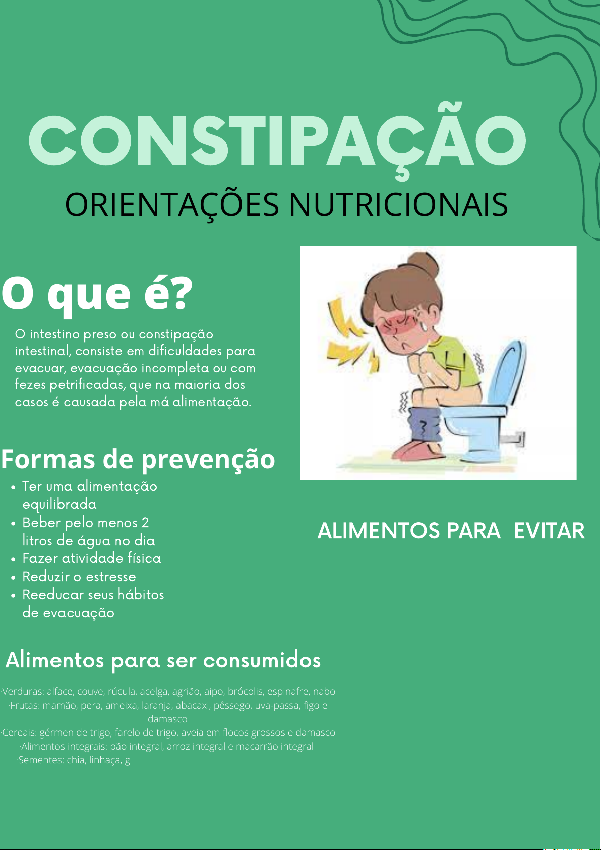 CONSTIPAÇÃO O intestino preso ou constipação intestinal, consiste em dificuldades para evacuar, evacuação incompleta ou com fezes petrificadas, que na maioria dos casos é causada pela má alimentação. Ter uma alimentação equilibrada Beber pelo menos 2 litros de água no dia Fazer atividade física Reduzir o estresse Reeducar seus hábitos de evacuação Alimentos para ser consumidos ALIMENTOS PARA EVITAR ORIENTAÇÕES NUTRICIONAIS O que é? Formas de prevenção ·Verduras: alface, couve, rúcula, acelga, agrião, aipo, brócolis, espinafre, nabo ·Frutas: mamão, pera, ameixa, laranja, abacaxi, pêssego, uva-passa, figo e damasco ·Cereais: gérmen de trigo, farelo de trigo, aveia em flocos grossos e damasco ·Alimentos integrais: pão integral, arroz integral e macarrão integral ·Sementes: chia, linhaça, gergelim, semente de abóbora e de girassol. ·Probióticos naturais: iogurte natural e kefir ·Frutas como: maça, banana maça, goiaba. ·Massas ·Farinhas refinadas em excesso (trigo) ·Cereais refinados em excesso (creme de arroz, amido de milho, polvilho) ·Farinha de mandioca, excesso de batata ·Excesso de refrigerante e baixo consumo de água Além disso é importante beber pelo menos 2 litros de água por dia, pois assim é possível que as fibras da alimentação fiquem hidratadas, aumentando o bolo fecal e facilitando sua eliminação