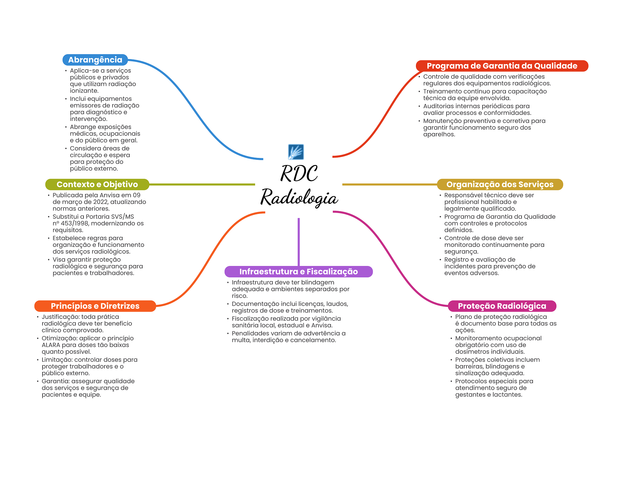 Abrangência Programa de Garantia da Qualidade Aplica-se a serviços públicos e privados Controle de qualidade com verificações que utilizam radiação regulares dos equipamentos radiológicos. ionizante. Treinamento contínuo para capacitação Inclui equipamentos técnica da equipe envolvida. emissores de radiação Auditorias internas periódicas para para diagnóstico e avaliar processos e conformidades. intervenção. Manutenção preventiva e corretiva para Abrange exposições garantir funcionamento seguro dos médicas, ocupacionais aparelhos. e do público em geral. Considera áreas de circulação e espera para proteção do público externo. RDC Contexto e Objetivo Organização dos Serviços Publicada pela Anvisa em 09 Radiologia Responsável técnico deve ser de março de 2022, atualizando profissional habilitado e normas anteriores. legalmente qualificado. Substitui a Portaria SVS/MS Programa de Garantia da Qualidade n° 453/1998, modernizando com controles e protocolos requisitos. definidos. Estabelece regras para Controle de dose deve ser organização e funcionamento monitorado continuamente para dos serviços radiológicos. segurança. Visa garantir proteção Registro e avaliação de radiológica e segurança para incidentes para prevenção de pacientes e trabalhadores. Infraestrutura e Fiscalização eventos adversos. Infraestrutura deve ter blindagem adequada e ambientes separados por risco. Princípios e Diretrizes Documentação inclui licenças, laudos, Proteção Radiológica registros de dose e treinamentos. Justificação: toda prática Fiscalização realizada por vigilância Plano de proteção radiológica radiológica deve ter benefício sanitária local, estadual e Anvisa. é documento base para todas as clínico comprovado. Penalidades variam de advertência a ações. Otimização: aplicar princípio multa, interdição e cancelamento. Monitoramento ocupacional ALARA para doses tão baixas obrigatório com uso de quanto possível. dosímetros individuais. Limitação: controlar doses para Proteções coletivas incluem proteger trabalhadores e barreiras, blindagens e público externo. sinalização adequada. Garantia: assegurar qualidade Protocolos especiais para dos serviços e segurança de atendimento seguro de pacientes e equipe. gestantes e lactantes.