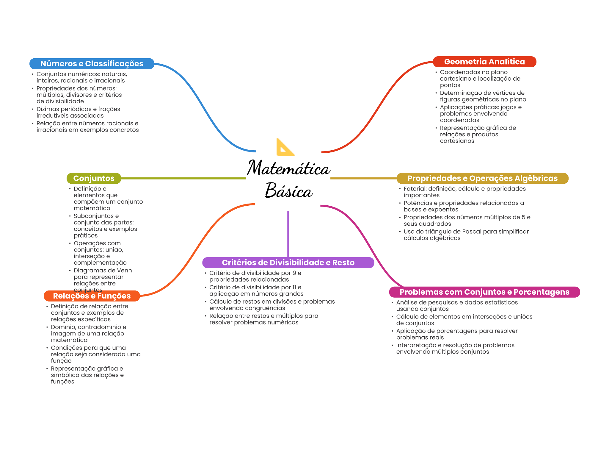 Números e Classificações Geometria Analítica Conjuntos numéricos: naturais, Coordenadas no plano inteiros, racionais e irracionais cartesiano e localização de Propriedades dos números: pontos múltiplos, divisores e critérios Determinação de vértices de de divisibilidade figuras geométricas no plano Dízimas periódicas e frações Aplicações práticas: jogos e irredutíveis associadas problemas envolvendo coordenadas Relação entre números racionais e irracionais em exemplos concretos Representação gráfica de relações e produtos cartesianos Matemática Conjuntos Propriedades e Operações Algébricas Definição e elementos que Básica Fatorial: definição, cálculo e propriedades importantes compõem um conjunto Potências e propriedades relacionadas a matemático bases e expoentes Subconjuntos e Propriedades dos números múltiplos de 5 e conjunto das partes: seus quadrados conceitos e exemplos Uso do triângulo de Pascal para simplificar práticos cálculos algébricos Operações com conjuntos: união, interseção e complementação Critérios de Divisibilidade e Resto Diagramas de Venn Critério de divisibilidade por 9 e para representar propriedades relacionadas relações entre conjuntos Critério de divisibilidade por 11 e Relações e Funções aplicação em números grandes Problemas com Conjuntos e Porcentagens Cálculo de restos em divisões e problemas Análise de pesquisas e dados estatísticos Definição de relação entre envolvendo congruências usando conjuntos conjuntos e exemplos de relações específicas Relação entre restos e múltiplos para Cálculo de elementos em interseções e uniões resolver problemas numéricos de conjuntos Domínio, contradomínio e imagem de uma relação Aplicação de porcentagens para resolver matemática problemas reais Condições para que uma Interpretação e resolução de problemas relação seja considerada uma envolvendo múltiplos conjuntos função Representação gráfica e simbólica das relações e funções