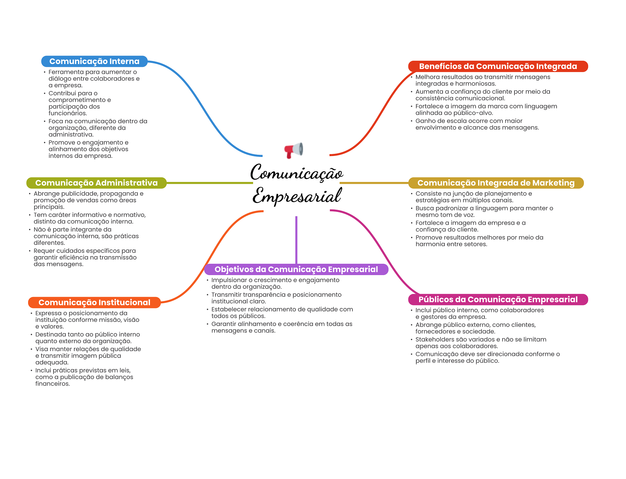 Comunicação Interna Benefícios da Comunicação Integrada Ferramenta para aumentar diálogo entre colaboradores e Melhora resultados ao transmitir mensagens a empresa. integradas e harmoniosas. Contribui para Aumenta a confiança do cliente por meio da comprometimento e consistência participação dos Fortalece a imagem da marca com linguagem funcionários. alinhada ao público-alvo. Foca na comunicação dentro da Ganho de escala ocorre com maior organização, diferente da envolvimento e alcance das mensagens. administrativa. Promove O engajamento e alinhamento dos objetivos internos da empresa. Comunicação Comunicação Administrativa Comunicação Integrada de Marketing Abrange publicidade, propaganda e promoção de vendas como áreas Empresarial Consiste na junção de planejamento e estratégias em múltiplos canais. principais. Busca padronizar a linguagem para manter O Tem caráter informativo e normativo, mesmo tom de distinto da comunicação interna. Fortalece a imagem da empresa e a Não é parte integrante da confiança do cliente. comunicação interna, são práticas Promove resultados melhores por meio da diferentes. harmonia entre setores. Requer cuidados específicos para garantir eficiência na transmissão das mensagens. Objetivos da Comunicação Empresarial Impulsionar crescimento e engajamento dentro da organização. Transmitir transparência e posicionamento Comunicação Institucional institucional claro. Públicos da Comunicação Empresarial Estabelecer relacionamento de qualidade com Expressa posicionamento da Inclui público interno, como colaboradores todos públicos. instituição conforme missão, visão e gestores da empresa. e valores. Garantir alinhamento e coerência em todas as Abrange público externo, como clientes, mensagens e canais. fornecedores e sociedade. Destinada tanto ao público interno quanto externo da organização. Stakeholders são variados e não se limitam Visa manter relações de qualidade apenas aos colaboradores. e transmitir imagem pública Comunicação deve ser direcionada conforme adequada. perfil e interesse do público. Inclui práticas previstas em leis, como a publicação de balanços financeiros.