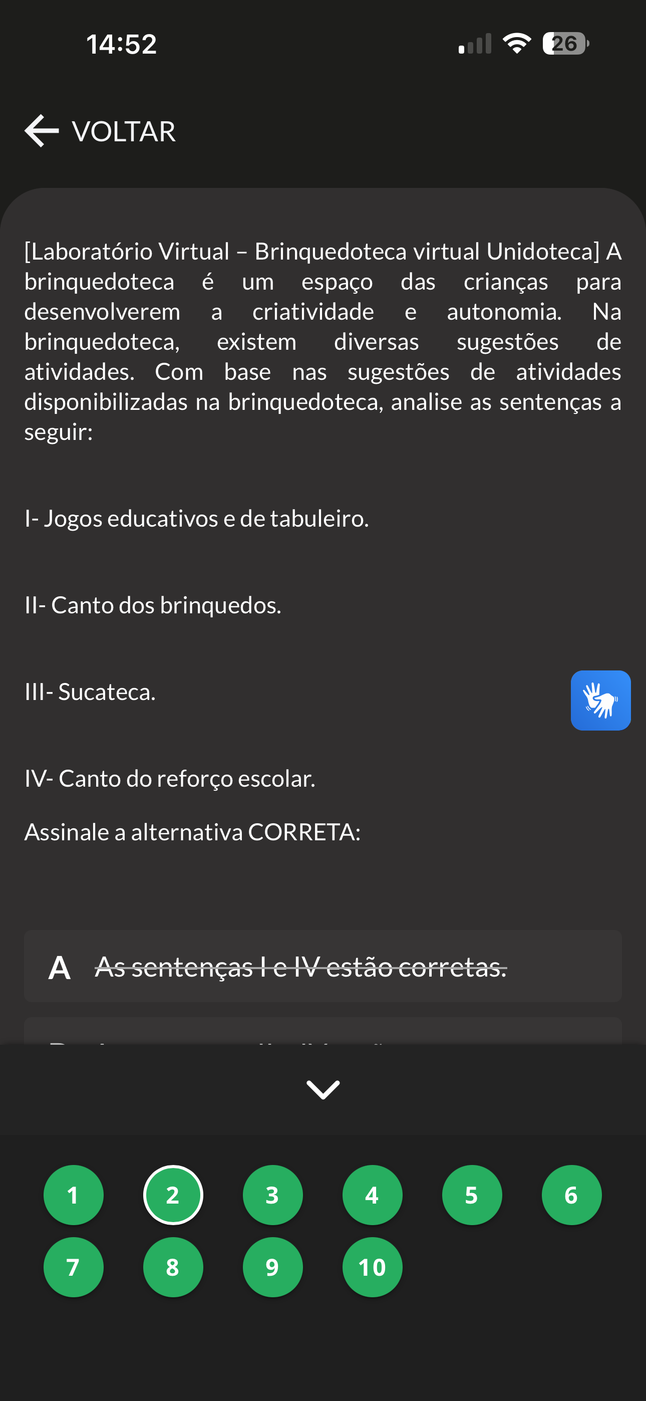 14:52 26 VOLTAR [Laboratório Virtual - Brinquedoteca virtual Unidoteca] A brinquedoteca é um espaço das crianças para desenvolverem a criatividade e autonomia. Na brinquedoteca, existem diversas sugestões de atividades. Com base nas sugestões de atividades disponibilizadas na brinquedoteca, analise as sentenças a seguir: I- Jogos educativos e de tabuleiro. II- Canto dos brinquedos. III- Sucateca. IV- Canto do reforço escolar. Assinale a alternativa CORRETA: A As sentenças le IV estão corretas. 1 2 3 4 5 6 7 8 9 10