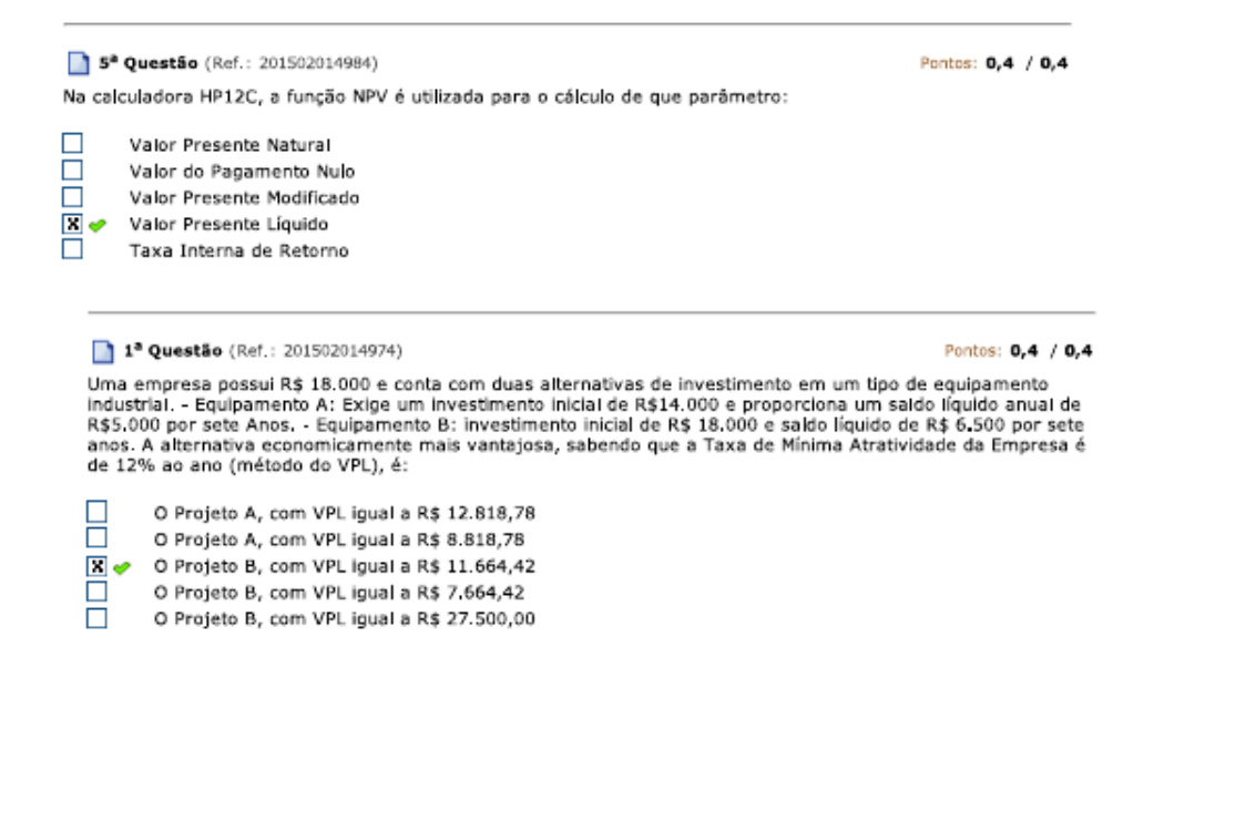 Questão (Ref.: 201502014984) Pontos: 0,4 / 0,4 Na calculadora HP12C, função NPV é utilizada para cálculo de que Valor Presente Natural Valor do Pagamento Nulo Valor Presente Modificado Valor Presente Líquido Taxa Interna de Retorno Questão (Ref.: 201502014974) Pontos: 0,4 / 0,4 Uma empresa possui R$ 18.000 e conta com duas alternativas de investimento em um tipo de equipamento Equipamento A: Exige um de R$14.000 e um saldo líquido anual de R$5,000 por sete Equipamento B: investimento inicial de R$ 18,000 e saldo líquido de R$ 6.500 por sete anos. A alternativa economicamente mais vantajosa, sabendo que a Taxa de Minima Atratividade da Empresa é de 12% ao ano (método do VPL), é: Projeto A, com VPL igual a R$ 12.818,78 Projeto A, com VPL igual a R$ 8.818,78 X Projeto B, com VPL a R$ 11.664,42 Projeto B, com VPL igual a Projeto B, com VPL igual a R$ 27.500,00