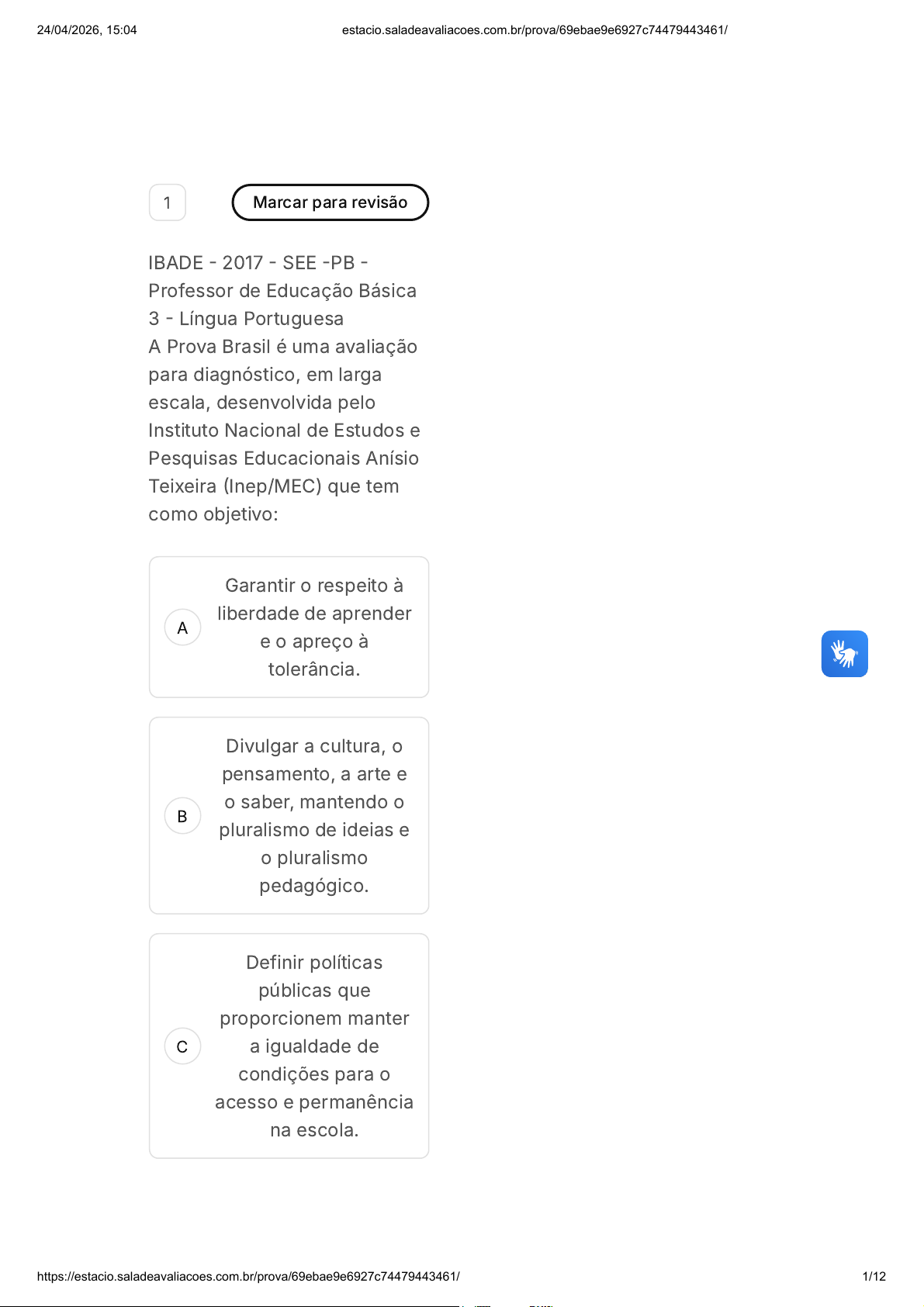 A B C 1 Marcar para revisão IBADE - 2017 - SEE -PB - Professor de Educação Básica 3 - Língua Portuguesa A Prova Brasil é uma avaliação para diagnóstico, em larga escala, desenvolvida pelo Instituto Nacional de Estudos e Pesquisas Educacionais Anísio Teixeira (Inep/MEC) que tem como objetivo: Garantir o respeito à liberdade de aprender e o apreço à tolerância. Divulgar a cultura, o pensamento, a arte e o saber, mantendo o pluralismo de ideias e o pluralismo pedagógico. Definir políticas públicas que proporcionem manter a igualdade de condições para o acesso e permanência na escola. 24/04/2026, 15:04 estacio.saladeavaliacoes.com.br/prova/69ebae9e6927c74479443461/ https://estacio.saladeavaliacoes.com.br/prova/69ebae9e6927c74479443461/ 1/12 D E Avaliar a qualidade do ensino oferecido pelo sistema educacional brasileiro a partir de testes padronizados e questionários socioeconômicos. Selecionar alunos através da valorização da experiência extraescolar, garantindo o padrão de qualidade. 2 Marcar para revisão A Constituição Federal de 1988 foi um marco importante para a educação brasileira, consolidando a ideia política de uma educação republicana e democrática. Dentro desse contexto, as diretrizes que regem a Educação Básica assumiram um papel significativo. Qual é a relação entre a Constituição Federal de 1988 e as diretrizes que regem a Educação Básica no Brasil? 24/04/2026, 15:04 estacio.saladeavaliacoes.com.br/prova/69ebae9e6927c74479443461/ https://estacio.saladeavaliacoes.com.br/prova/69ebae9e6927c74479443461/ 2/12 A B C A Constituição Federal de 1988 não estabeleceu diretrizes específicas para a Educação Básica. A Constituição Federal de 1988 determinou que as diretrizes para a Educação Básica devem ser estabelecidas exclusivamente pelo poder executivo. A Constituição Federal de 1988 conferiu autonomia aos estados e municípios para definir suas próprias diretrizes para a Educação Básica. 24/04/2026, 15:04 estacio.saladeavaliacoes.com.br/prova/69ebae9e6927c74479443461/ https://estacio.saladeavaliacoes.com.br/prova/69ebae9e6927c74479443461/ 3/12 D E A Constituição Federal de 1988 estabeleceu princípios e diretrizes gerais para a Educação Básica, incluindo a garantia de qualidade e equidade na oferta da educação. A Constituição Federal de 1988 atribuiu a definição das diretrizes para a Educação Básica exclusivamente ao poder legislativo. 3 Marcar para revisão VUNESP - 2019 - SEDUC-SP - Supervisor de Ensino De acordo com Libâneo, Oliveira e Toschi (2012), desde 1990 vêm sendo criados e aplicados exames de âmbito federal, dos quais se destacam o Sistema de Avaliação Básica - Saeb (1994), o Exame Nacional de Ensino Médio ¿ Enem (1998), o Exame de Certificação de Competências de Jovens e Adultos - Encceja (2002), a Prova Brasil (2005), a Provinha Brasil (2007), o Índice de Desenvolvimento da Educação Básica - Ideb. Para eles, os instrumentos de avaliação 24/04/2026, 15:04 estacio.saladeavaliacoes.com.br/prova/69ebae9e6927c74479443461/ https://estacio.saladeavaliacoes.com.br/prova/69ebae9e6927c74479443461/ 4/12 A B C D E nacional visam a realização de avaliações em larga escala, por meio de testes padronizados e questionários socioeconômicos, para Oferta à população, de comparação entre o desempenho de escolas públicas e privadas. Diagnóstico da qualidade do ensino oferecido pelo sistema educacional brasileiro. Classificação das escolas do país, oferecendo a sua clientela uma referência para escolha Comparação do nível de instrução da mão de obra brasileira com o de outros países. Prestação de contas aos financiadores dos programas de melhoria do ensino. 00 hora : 41 min : 28 seg Ocultar Questão 8 de 10 Respondidas (10) Em branco (0) Finalizar prova 1 2 3 4 5 6 7 8 9 10 SM2 Avaliação Institucional 24/04/2026, 15:04 estacio.saladeavaliacoes.com.br/prova/69ebae9e6927c74479443461/ https://estacio.saladeavaliacoes.com.br/prova/69ebae9e6927c74479443461/ 5/12 A B C D E 4 Marcar para revisão INAZ do Pará - 2019 - Prefeitura de Magalhães Barata - PA - Professor - Pedagogia ''É aplicada aos alunos do quinto e nono anos do ensino fundamental que respondem a questões de Língua Portuguesa e Matemática.'' (Fonte: Inep.gov.br) O trecho acima refere-se a(ao) Prova Brasil. Provinha Brasil. PISA. IDEB. Tratado de Bologna. 5 Marcar para revisão (FAUEL/ 2020) A Provinha Brasil é uma avaliação diagnóstica do nível de alfabetização das crianças matriculadas em escolas públicas brasileiras. Em qual 24/04/2026, 15:04 estacio.saladeavaliacoes.com.br/prova/69ebae9e6927c74479443461/ https://estacio.saladeavaliacoes.com.br/prova/69ebae9e6927c74479443461/ 6/12 A B C D E ano de escolarização essa avaliação é aplicada? 3º ano. 2º ano. 5º ano. 1º ano. 9º ano. 6 Marcar para revisão Avaliações de larga escala de desempenho são mecanismos que visam fomentar processos avaliativos para a Educação Nacional, visando: 24/04/2026, 15:04 estacio.saladeavaliacoes.com.br/prova/69ebae9e6927c74479443461/ https://estacio.saladeavaliacoes.com.br/prova/69ebae9e6927c74479443461/ 7/12 A B C D E Gerar indicadores que possam ser analisados, comparados e dar base a decisões. Criar um teto de qualidade, apontando que instituições podem ou não continuar, protegendo os brasileiros. Criar um mecanismo de medição e comparação dos estudantes do Brasil e do exterior. Gerar um processo de transformação contínua da educação pelo estudo das fragilidades dos alunos. Criar um mecanismo de fiscalização eficiente das escolas, criando formas de melhoria. 7 Marcar para revisão A avaliação de rendimento deve ser reconhecida como um 24/04/2026, 15:04 estacio.saladeavaliacoes.com.br/prova/69ebae9e6927c74479443461/ https://estacio.saladeavaliacoes.com.br/prova/69ebae9e6927c74479443461/ 8/12 A B C D E potencial processo de avaliação institucional interna na educação. Seu papel é: Diagno