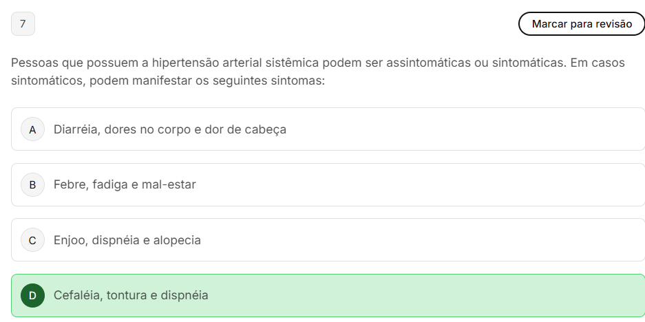 7 Marcar para revisão Pessoas que possuem a hipertensão arterial sistêmica podem ser assintomáticas ou sintomáticas. Em casos sintomáticos, podem manifestar seguintes sintomas: A Diarréia, dores no corpo e dor de cabeça B Febre, fadiga e mal-estar C Enjoo, dispnéia e alopecia D Cefaléia, tontura e dispnéia