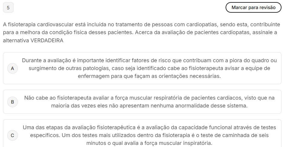 5 Marcar para revisão A fisioterapia cardiovascular está incluída no tratamento de pessoas com cardiopatias, sendo esta, contribuinte para a melhora da condição física desses pacientes. Acerca da avaliação de pacientes cardiopatas, assinale a alternativa VERDADEIRA Durante a avaliação é importante identificar fatores de risco que contribuam com a piora do quadro ou A surgimento de outras patologias, caso seja identificado cabe ao fisioterapeuta avisar a equipe de enfermagem para que façam as orientações necessárias. Não cabe ao fisioterapeuta avaliar a força muscular respiratória de pacientes cardíacos, visto que na maioria das vezes eles não apresentam nenhuma anormalidade desse sistema. Uma das etapas da avaliação fisioterapêutica é a avaliação da capacidade funcional através de testes C específicos. Um dos testes mais utilizados dentro da fisioterapia é teste de caminhada de seis minutos qual avalia a força muscular inspiratória.