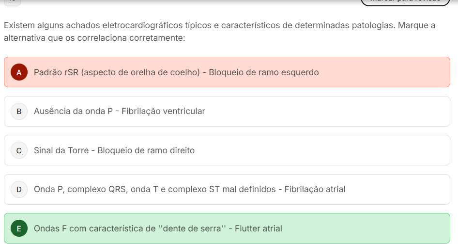 Existem alguns achados eletrocardiográficos típicos e característicos de determinadas patologias. Marque a alternativa que correlaciona corretamente: A Padrão rSR (aspecto de orelha de coelho) - Bloqueio de ramo esquerdo Ausência da onda P - Fibrilação ventricular C Sinal da Torre - Bloqueio de ramo direito D Onda P, complexo QRS, onda T e complexo ST mal definidos - Fibrilação atrial E Ondas F com característica de "dente de serra" - Flutter atrial