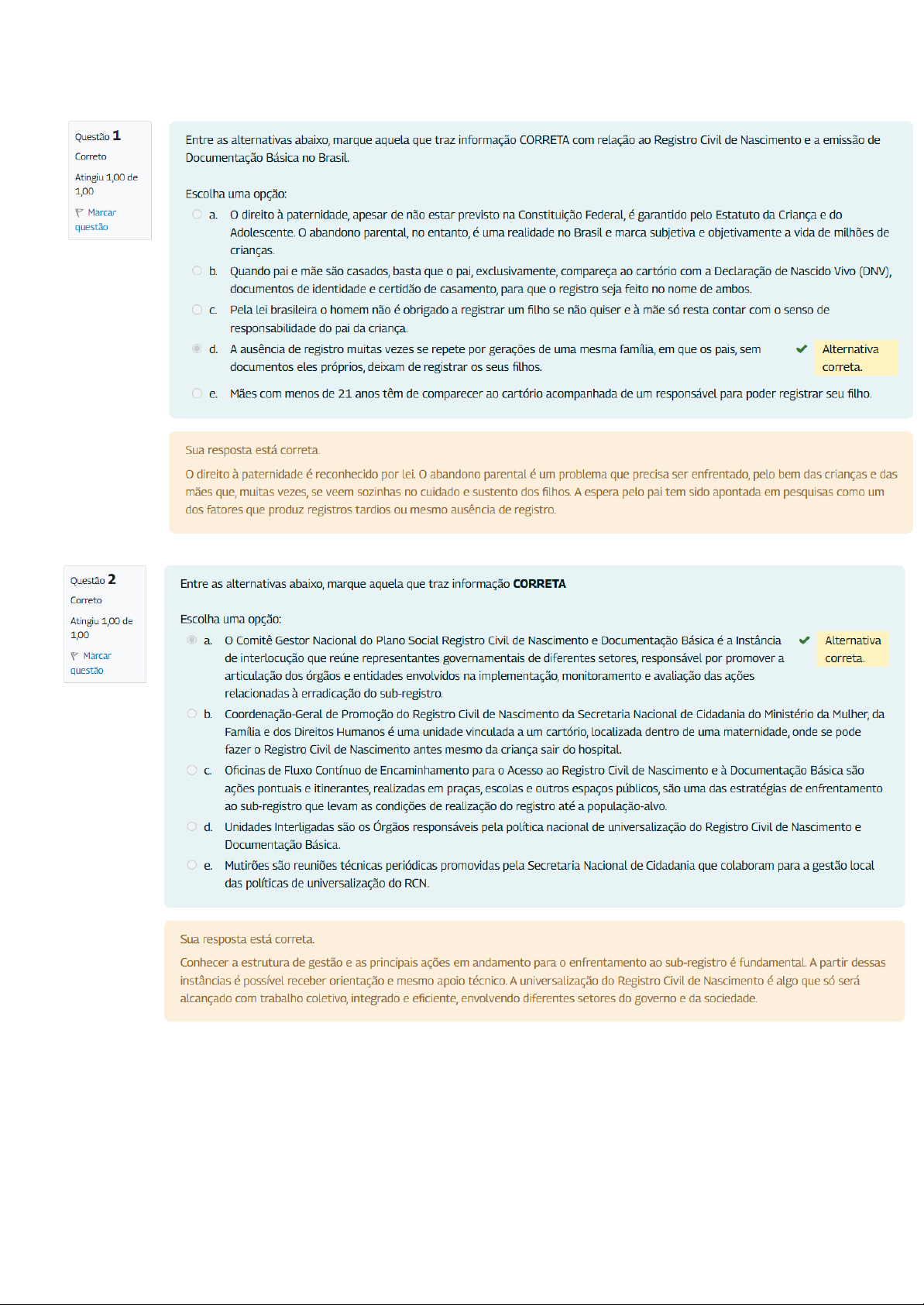 Questão 1 Entre as alternativas abaixo, marque aquela que traz informação CORRETA com relação ao Registro Civil de Nascimento e a emissão de Correto Documentação Básica no Brasil. Atingiu 1,00 de 1,00 Escolha uma opção: Marcar a. 0 direito à paternidade, apesar de não estar previsto na Constituição Federal, é garantido pelo Estatuto da Criança e do questão Adolescente. abandono parental, no entanto, é uma realidade no Brasil e marca subjetiva e objetivamente a vida de milhões de crianças. b. Quando pai e mãe são casados, basta que pai, exclusivamente, compareça ao cartório com a Declaração de Nascido Vivo (DNV), documentos de identidade e certidão de casamento, para que registro seja feito no nome de ambos. C. Pela lei brasileira 0 homem não é obrigado a registrar um filho se não quiser e à mãe só resta contar com senso de responsabilidade do pai da criança. d. A ausência de registro muitas vezes se repete por gerações de uma mesma família, em que os pais, sem Alternativa documentos eles próprios, deixam de registrar os seus filhos. correta. e. Mães com menos de 21 anos têm de comparecer ao cartório acompanhada de um responsável para poder registrar seu filho. Sua resposta está correta. 0 direito à paternidade é reconhecido por lei. 0 abandono parental é um problema que precisa ser enfrentado, pelo bem das crianças e das mães que, muitas vezes, se veem sozinhas no cuidado e sustento dos filhos. A espera pelo pai tem sido apontada em pesquisas como um dos fatores que produz registros tardios ou mesmo ausência de registro. Questão 2 Entre as alternativas abaixo, marque aquela que traz informação CORRETA Correto Atingiu 1,00 de Escolha uma opção: 1,00 a. Comitê Gestor Nacional do Plano Social Registro Civil de Nascimento e Documentação Básica é a Instância Alternativa P Marcar de interlocução que reúne representantes governamentais de diferentes setores, responsável por promover a correta. questão articulação dos órgãos e entidades envolvidos na implementação, monitoramento e avaliação das ações relacionadas à erradicação do sub-registro. b. Coordenação-Geral de Promoção do Registro Civil de Nascimento da Secretaria Nacional de Cidadania do Ministério da Mulher, da Família e dos Direitos Humanos é uma unidade vinculada a um cartório, localizada dentro de uma maternidade, onde se pode fazer Registro Civil de Nascimento antes mesmo da criança sair do hospital. C. Oficinas de Fluxo Contínuo de Encaminhamento para Acesso ao Registro Civil de Nascimento e à Documentação Básica são ações pontuais e itinerantes, realizadas em praças, escolas e outros espaços públicos, são uma das estratégias de enfrentamento ao sub-registro que levam as condições de realização do registro até a população-alvo. d. Unidades Interligadas são os Órgãos responsáveis pela política nacional de universalização do Registro Civil de Nascimento e Documentação Básica. e. Mutirões são reuniões técnicas periódicas promovidas pela Secretaria Nacional de Cidadania que colaboram para a gestão local das políticas de universalização do RCN. Sua resposta está correta. Conhecer a estrutura de gestão e as principais ações em andamento para 0 enfrentamento ao sub-registro é fundamental. A partir dessas instâncias é possível receber orientação e mesmo apoio técnico. A universalização do Registro Civil de Nascimento é algo que só será alcançado com trabalho coletivo, integrado e eficiente, envolvendo diferentes setores do governo e da sociedade.Questão 3 Entre as alternativas abaixo, marque aquela que traz informação CORRETA: Correto Atingiu 1,00 de Escolha uma opção: 1,00 a. Uma criança sem RCN não pode ser matriculada em uma escola da rede pública. P Marcar b. Assegurar documentação civil básica a todos os Sim, essa é uma das metas/diretrizes prioritárias do PNAS. questão adolescentes em cumprimento de medidas, tanto em meio Viabilizar a documentação é parte importante do processo aberto quanto fechado, é um dos objetivos previstos no de reintegração social do adolescente em cumprimento de Plano Nacional de Atendimento Socioeducativo. medida socioeducativa. C. Por não possuírem profissionais especializados, as unidades de saúde não devem ser consideradas como porta de entrada e encaminhamento para pessoas não registradas. d. A rede de assistência social não deve atuar de forma ativa. A promoção de ações de mobilização e orientação da população sobre questões ligadas ao RCN e DB é atribuição exclusiva de cartórios credenciados. e. Os profissionais da educação, da socioeducação, da saúde e da assistência social não tem nenhum papel relevante no enfrentamento ao sub-registro, função exclusiva dos funcionários dos cartórios. Sua resposta está correta. A atuação de profissionais de todos os setores do serviço público é fundamental para construirmos uma política de enfrentamento ao sub- registro. Escola, hospital, CRAS, todos esses equipamentos são portas de entrada por onde a população não registrada pode ser alcançada e, a partir daí, dar-se início ao processo que levará a emissão da documentação e à consolidação da cidadania.