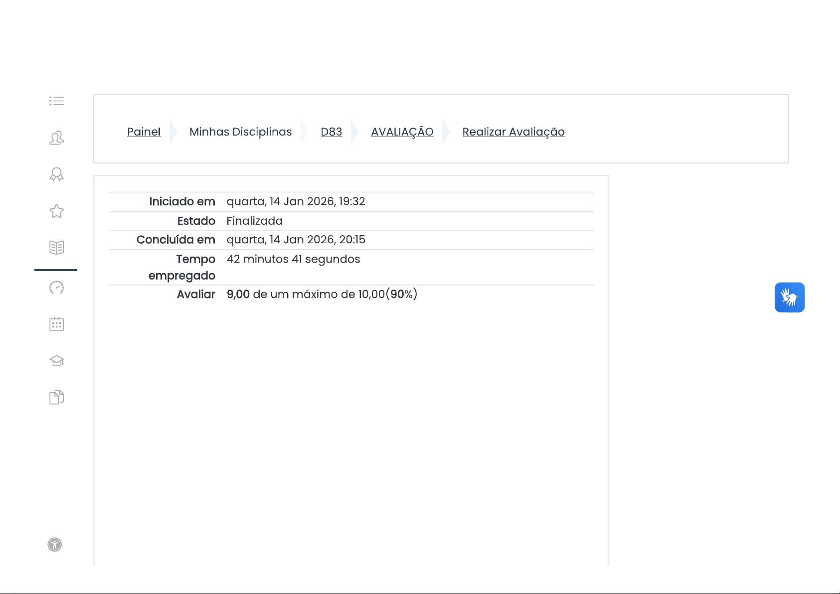 Painel Minhas Disciplinas D83 AVALIAÇÃO Realizar Avaliação Iniciado em quarta, 14 Jan 2026, 19:32 Estado Finalizada Concluída em quarta, 14 Jan 2026, 20:15 Tempo 42 minutos 41 segundos empregado Avaliar 9,00 de um máximo de 10,00(90%)Questão 1 Sobre a Educação Especial, é INCORRETO afirmar que: Correto Atingiu 1,00 de 1,00 a. Durante muito tempo, a educação especial foi oferecida em instituições especializadas, escolas especiais e classes especiais, em substituição ao ensino comum. b. Desde a sua origem, a educação especial se caracteriza por uma perspectiva inclusiva, em que se consideram as necessidades educacionais específicas da criança. C. Nenhuma das alternativas d. projeto pedagógico da escola deve articular a educação comum e a educação especial, buscando atender às necessidades dos educandos. e. O trabalho colaborativo entre os professores da sala de aula comum e da sala de recursos multifuncionais busca promover condições de aprendizagem da criança com deficiência. Sua resposta está correta. iQuestão 2 Leia atentamente trecho abaixo: Correto As causas da deficiência mental são variadas e podem ser Atingiu 1,00 de 1,00 divididas da seguinte maneira: Genéticas e Congênitas, Infecciosas, Mecânicas, Físicas, Tóxicas, Má Alimentação, dentre outras. A rubéola, sífilis e toxoplasmose se enquadrariam como causas: a. Mecânicas b. Congênitas C. Físicas d. Nenhuma das alternativas e. Infecciosas Sua resposta está correta.Questão 3 Marc tem uma dificuldade de aprendizagem leve. Sua Correto habilidade de leitura está com dois anos de defasagem em Atingiu 1,00 de relação ao nível do ano em que estuda. Como resultado, ele 1,00 tem dificuldade nas matérias que envolvem muita leitura, como linguagem, estudos sociais e ciências. Ele vai muito melhor em matemática. Que tipos de serviços seriam mais apropriados para Marc? a. Marc deveria frequentar uma classe regular com algumas modificações feitas em seu currículo e talvez com a ajuda de um auxiliar ou serviços ocasionais na sala auxiliar. b. Marc deveria frequentar uma classe regular, com um professor de educação regular, sem nenhuma modificação. Marc deveria ser educado por um professor especial, numa classe apenas para alunos com necessidades especiais, mas em uma escola regular. d. Marc deveria ser educado em casa, pelos seus pais, aprendendo os conteúdos na escola apenas.e. Marc deveria estudar em uma escola separada para estudantes com deficiências, pois convívio com crianças sem deficiência não lhe faria bem. Sua resposta está correta.Questão 4 De acordo com as diretrizes da Política Nacional de Educação Correto Especial na Perspectiva da Educação Inclusiva sobre Atingiu 1,00 de atendimento educacional especializado: 1,00 a. O acesso à educação para as pessoas com deficiência inicia-se no ensino atendimento educacional especializado tem como função identificar, elaborar e organizar recursos pedagógicos e de acessibilidade que eliminem as barreiras para a plena participação dos alunos considerando suas necessidades específicas. C. Os programas de enriquecimento curricular, ensino de linguagens e códigos específicos de comunicação e sinalização e tecnologia assistiva devem ser oferecidos somente nas escolas regulares. d. As atividades propostas durante atendimento educacional especializado funcionam da mesma forma que as realizadas na sala de aula, podendo substituí-las. Sua resposta está correta.Questão 5 A partir dos documentos estudados nesta Unidade de Incorreto Aprendizagem, assinale qual documento recomenda que a Atingiu 0,00 matricula dos sujeitos da Educação Especial seja realizada de 1,00 preferencialmente nas escolas regulares: a. Lei 8.069 de 13 de julho de 1990. b. Lei n° 9.394 - Lei de Diretrizes e Bases da Educação Nacional (LDBEN). C. Plano de Desenvolvimento da Educação - PDE d. Diretrizes Nacionais para a Educação Especial na Educação Básica - Resolução CNE/CEB n° 2. e. Política Nacional da Educação Especial na Perspectiva da Educação Inclusiva. Sua resposta está incorreta.Questão 6 Assinale a alternativa que indica níveis de escolaridade Correto atendidos pela Educação Especial, conforme previsto na Atingiu 1,00 de legislação federal em vigor. 1,00 a. Ensino Fundamental e Ensino Superior. b. Educação Infantil e Ensino Superior. C. Educação Infantil, Ensino Fundamental e Ensino Médio d. Nenhuma das alternativas e. Educação Infantil, Ensino Fundamental, Ensino Médio e Ensino Superior. e EJA Sua resposta está correta.Questão 7 Decreto n° 3.956/2001, afirma que as pessoas com deficiência Correto têm mesmos direitos humanos e liberdades fundamentais Atingiu 1,00 de que as demais pessoas, definindo como discriminação com 1,00 base na deficiência toda diferenciação ou exclusão que possa impedir ou anular exercício dos direitos humanos e de suas liberdades fundamentais. Este documento foi construído a partir de um encontro internacional que como outros, influenciou na formulação de políticas públicas da educação inclusiva em nosso país. a. Constituição de 1988 b. Convenção da Berlim C. Declaração de Costa Rica d. Política Nacional de Educação Especial e. Convenção Interamericana Sua resposta está correta.Questão 8 Em relação a deficiência visual é INCORRETO afirmar que: Correto Atingiu 1,00 de 1,00 a. Dentro do conceito educacional, a pessoa com baixa visão é aquela que possui resíduos visuais em grau que permitam ler textos impressos à tinta, desde que se empreguem recursos didáticos e equipamentos especiais, excluindo as deficiências facilmente corrigidas pelo uso adequado de lentes. b. Nenhuma das alternativas C. Miopia, astigmatismo e hipermetropia são considerados deficientes visuais de baixa visão. d. A ferramenta de escrita e leitura mais apropriada para a pessoa cega é método Braille e. São recursos e exemplos de tecnologias assistivas para cego: 