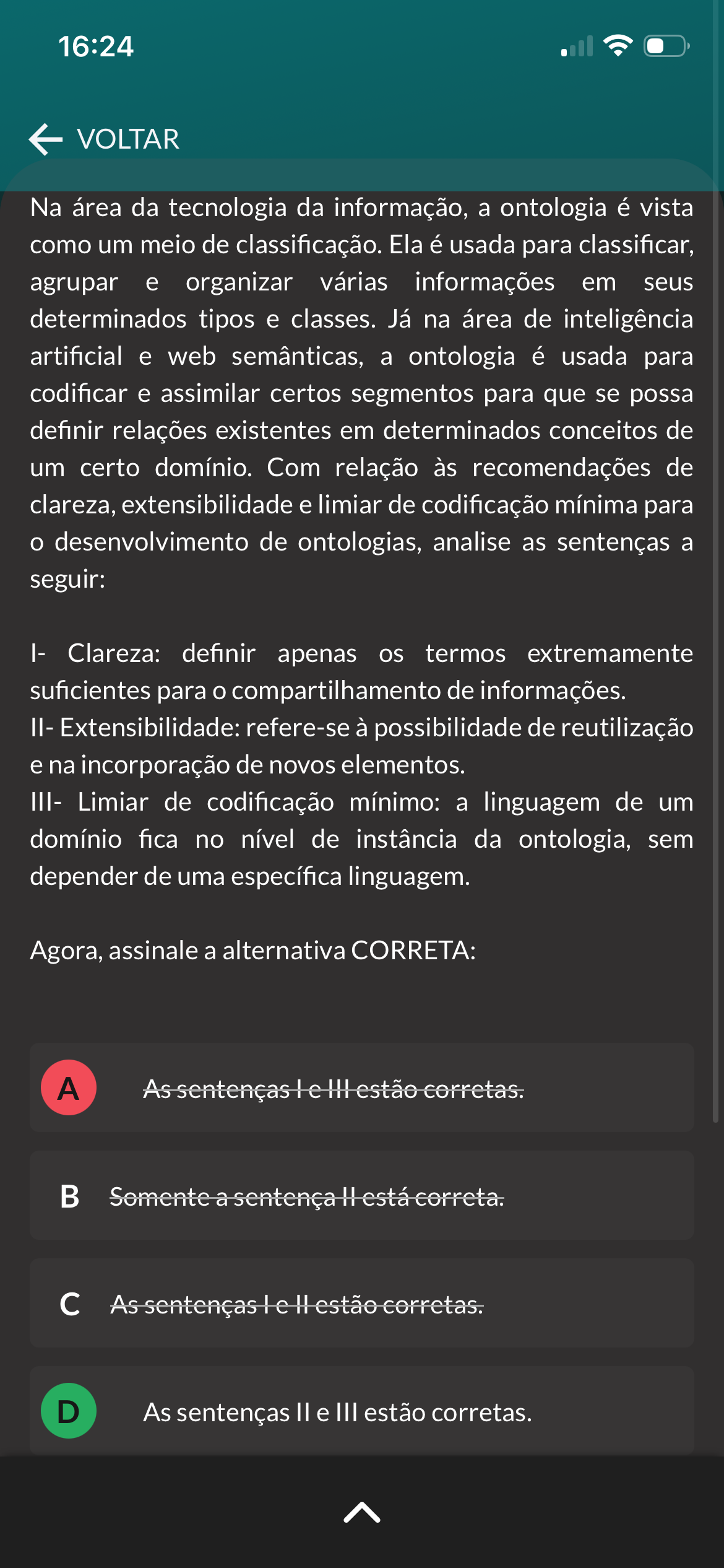 16:24 VOLTAR Na área da tecnologia da informação, a ontologia é vista como um meio de classificação. Ela é usada para classificar, agrupar e organizar várias informações em seus determinados tipos e classes. Já na área de inteligência artificial e web semânticas, a ontologia é usada para codificar e assimilar certos segmentos para que se possa definir relações existentes em determinados conceitos de um certo domínio. Com relação às recomendações de clareza, extensibilidade e limiar de codificação mínima para desenvolvimento de ontologias, analise as sentenças a seguir: I- Clareza: definir apenas os termos extremamente suficientes para compartilhamento de informações. II- Extensibilidade: refere-se à possibilidade de reutilização e na incorporação de novos elementos. III- Limiar de codificação mínimo: a linguagem de um domínio fica no nível de instância da ontologia, sem depender de uma específica linguagem. Agora, assinale a alternativa CORRETA: A As sentenças le estão corretas. Somente a sentença H está correta. c As sentenças le H estão corretas. D As sentenças e III estão corretas.