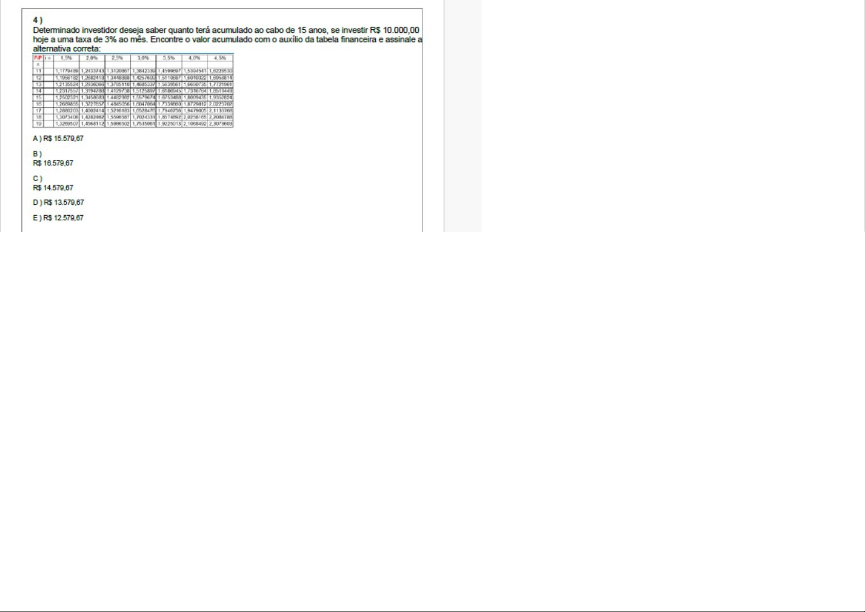 4) Determinado investidor deseja saber quanto terá acumulado ao cabo de 15 anos, se investir R$ 10.000,00 hoje a uma taxa de 3% ao mês. Encontre valor acumulado com 0 auxílio da tabela financeira e assinale a alternativa correta: F/P 1,5% 2,0% 3,5% 4,0% 11 1,1779489 1,2433743 1,3120867 1,3842339 1,5394541 1,6228530 12 1,1956182 1,2682418 1,4257609 13 1,2936066 1,4685337 1,5639561 1,7721961 14 15 1,3458683 1,5579674 1,8009435 16 2.0223702 17 1,4002414 1,9479005 2,1133768 18 1,7024331 1,8574892 2,2084788 19 1,4568112 1,7535061 1,9225013 2,3078603 A) R$ 15.579,67 B) R$ 16.579,67 D) E)