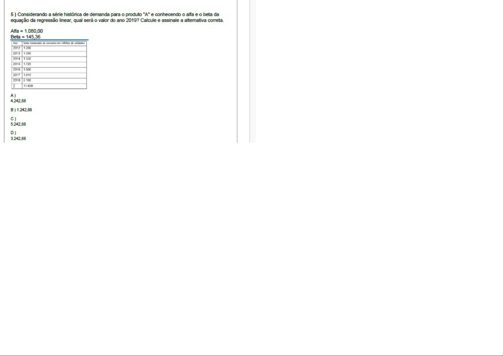 5) Considerando a série histórica de demanda para o produto "A" e conhecendo o alfa e beta da equação da regressão linear, qual será o valor do ano 2019? Calcule e assinale a correta. Alfa = 1.080,00 Beta = 145,36 de en de 2012 2013 1,350 2014 2015 1.720 2016 2017 2018 E 11.630 A) 4.242,88 B) 1.242,88 C) 5.242,88 D) 3.242,88