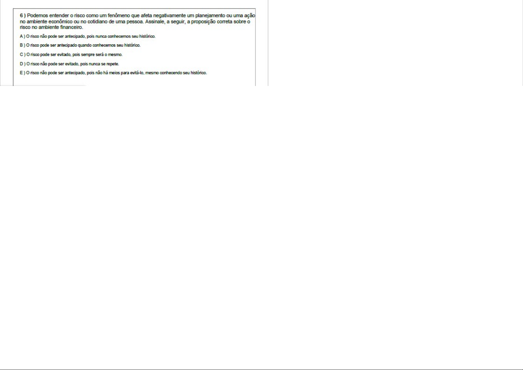 6) Podemos entender o risco como um fenômeno que afeta negativamente um planejamento ou uma ação no ambiente econômico ou no cotidiano de uma pessoa. Assinale, a seguir, a proposição correta sobre o risco no ambiente financeiro. A) risco não pode ser antecipado, pois nunca conhecemos seu histórico. B) risco pode ser antecipado quando conhecemos seu histórico. risco pode ser evitado, pois sempre será o mesmo. D) risco não pode ser evitado, pois nunca se repete. E) risco não pode ser antecipado, pois não há meios para evitá-lo, mesmo conhecendo seu histórico.
