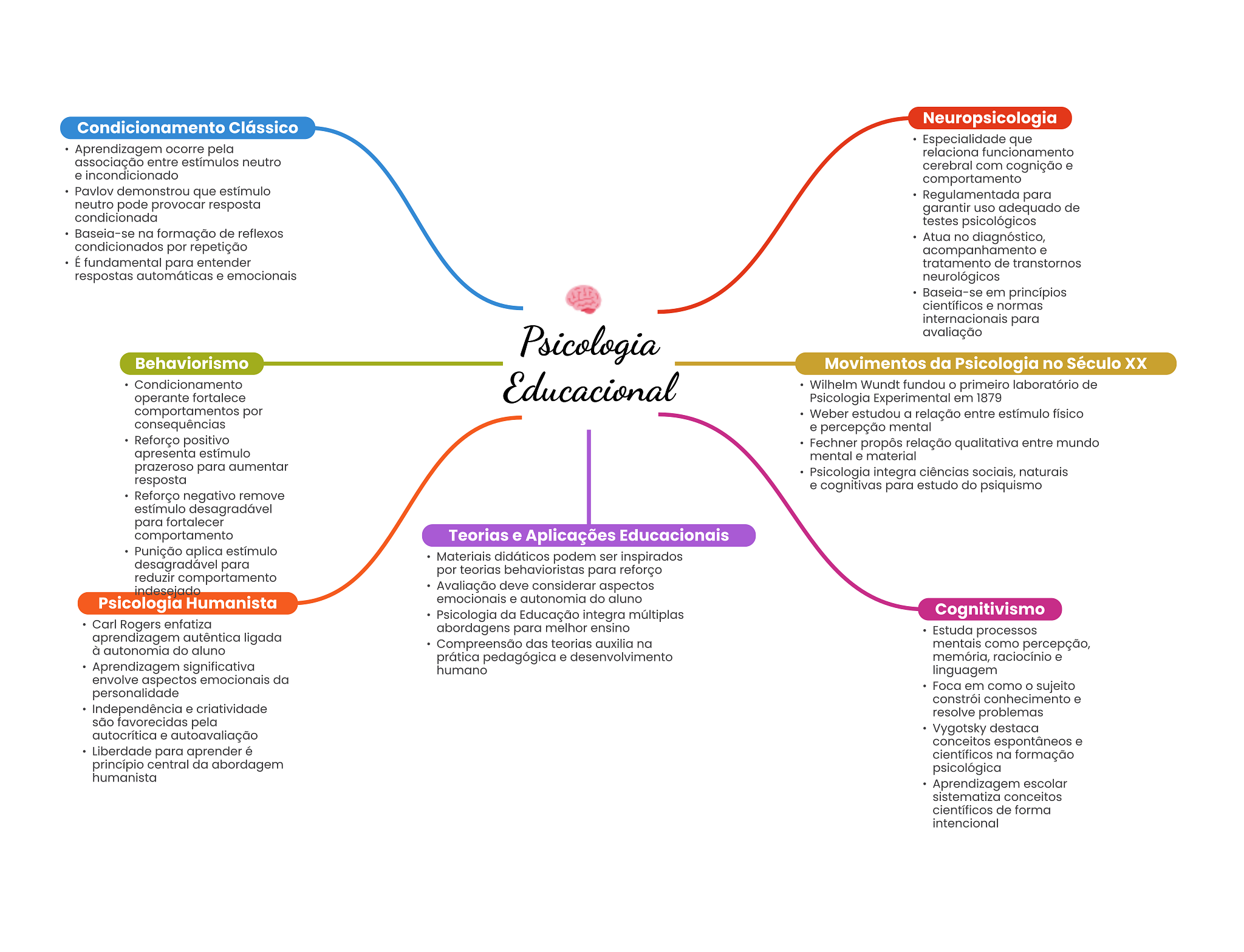 Condicionamento Clássico Neuropsicologia Especialidade que Aprendizagem ocorre pela relaciona funcionamento associação entre estímulos neutro cerebral com cognição e e incondicionado comportamento Pavlov demonstrou que estímulo Regulamentada para neutro pode provocar resposta garantir uso adequado de condicionada testes psicológicos Baseia-se na formação de reflexos Atua no diagnóstico, condicionados por repetição acompanhamento e É fundamental para entender tratamento de transtornos respostas automáticas e emocionais neurológicos Baseia-se em princípios científicos e normas internacionais para Psicologia avaliação Behaviorismo Movimentos da Psicologia no Século Condicionamento operante fortalece Educacional Wilhelm Wundt fundou primeiro laboratório de Psicologia Experimental em 1879 comportamentos por Weber estudou a relação entre estímulo físico consequências e percepção mental Reforço positivo Fechner propôs relação qualitativa entre mundo apresenta estímulo mental e material prazeroso para aumentar Psicologia integra ciências sociais, naturais resposta e cognitivas para estudo do psiquismo Reforço negativo remove estímulo desagradável para fortalecer comportamento Teorias e Aplicações Educacionais Punição aplica estímulo Materiais didáticos podem ser inspirados desagradável para por teorias behavioristas para reforço reduzir comportamento indesejado Avaliação deve considerar aspectos Psicologia Humanista emocionais e autonomia do aluno Psicologia da Educação integra múltiplas Cognitivismo Carl Rogers enfatiza abordagens para melhor ensino aprendizagem autêntica ligada Estuda processos à autonomia do aluno Compreensão das teorias auxilia na mentais como percepção, prática pedagógica e desenvolvimento memória, raciocínio e Aprendizagem significativa humano linguagem envolve aspectos emocionais da Foca em como O sujeito personalidade constrói conhecimento e Independência e criatividade resolve problemas são favorecidas pela autocrítica e autoavaliação Vygotsky destaca conceitos espontâneos e Liberdade para aprender é científicos na formação princípio central da abordagem psicológica humanista Aprendizagem escolar sistematiza conceitos científicos de forma intencional