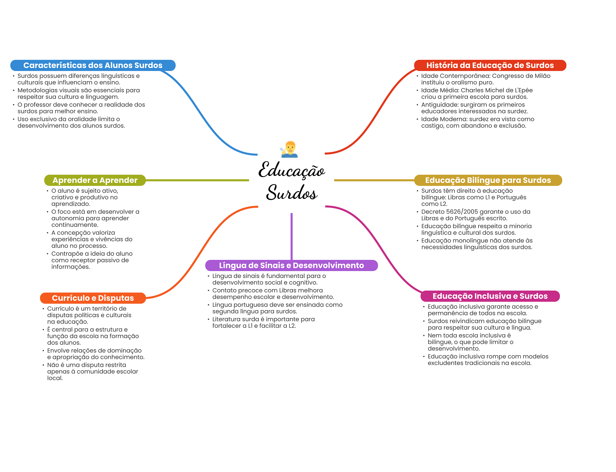 Características dos Alunos Surdos História da Educação de Surdos Surdos possuem diferenças linguísticas e Idade Contemporânea: Congresso de Milão culturais que influenciam ensino. instituiu oralismo puro. Metodologias visuais são essenciais para Idade Média: Charles Michel de L'Epée respeitar sua cultura e linguagem. criou a primeira escola para surdos. professor deve conhecer a realidade dos Antiguidade: surgiram primeiros surdos para melhor ensino. educadores interessados na surdez. Uso exclusivo da oralidade limita Idade Moderna: surdez era vista como desenvolvimento dos alunos surdos. castigo, com abandono e exclusão. Educação Aprender a Aprender Educação Bilíngue para Surdos aluno é sujeito ativo, criativo e produtivo no Surdos Surdos têm direito à educação bilíngue: Libras como L1 e Português aprendizado. como L2. foco está em desenvolver a Decreto 5626/2005 garante uso da autonomia para aprender Libras e do Português escrito. continuamente. Educação bilíngue respeita a minoria A concepção valoriza linguística e cultural dos surdos. experiências e vivências do Educação não atende às aluno no processo. necessidades linguísticas dos surdos. Contrapõe a ideia do aluno como receptor passivo de informações. Língua de Sinais e Desenvolvimento Língua de sinais é fundamental para O desenvolvimento social e cognitivo. Contato precoce com Libras melhora Currículo e Disputas desempenho escolar e desenvolvimento. Educação Inclusiva e Surdos Currículo é um território de Língua portuguesa deve ser ensinada como Educação inclusiva garante acesso e disputas políticas e culturais segunda língua para surdos. permanência de todos na escola. na educação. Literatura surda é importante para Surdos reivindicam educação bilíngue fortalecer a L1 e facilitar a L2. É central para a estrutura e para respeitar sua cultura e língua. função da escola na formação Nem toda escola inclusiva é dos alunos. bilíngue, que pode limitar Envolve relações de dominação desenvolvimento. e apropriação do conhecimento. Educação inclusiva rompe com modelos Não é uma disputa restrita excludentes tradicionais na escola. apenas à comunidade escolar local.