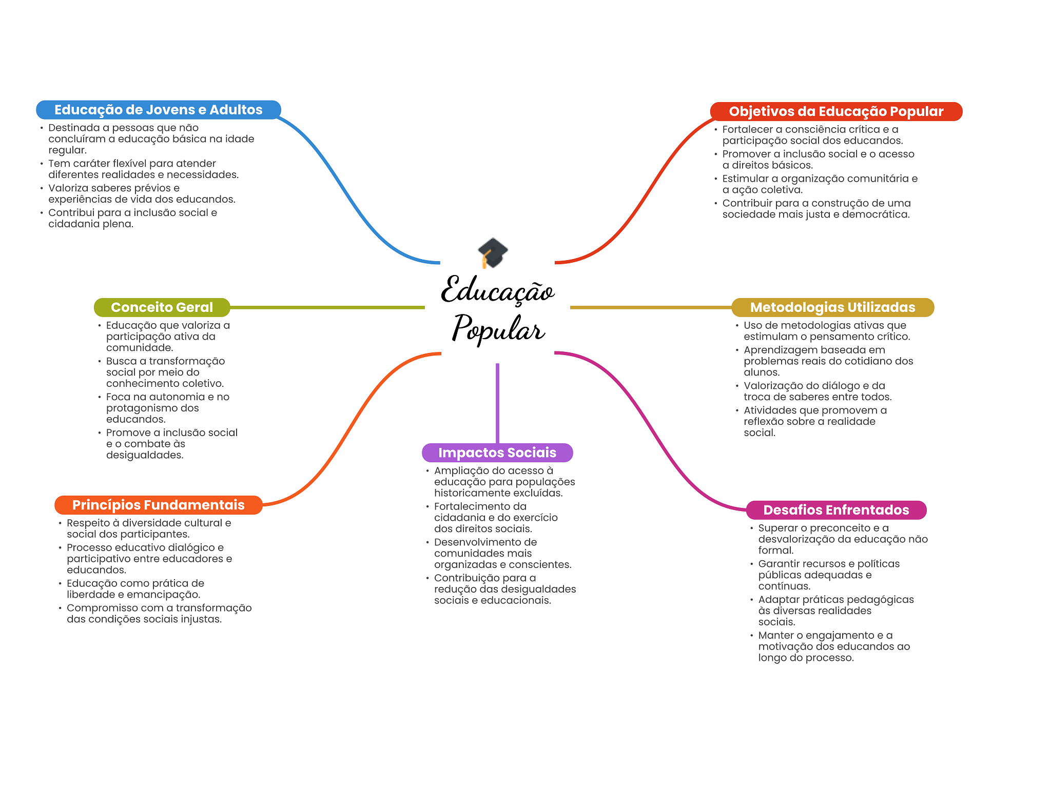 Educação de Jovens e Adultos Objetivos da Educação Popular Destinada a pessoas que não Fortalecer a consciência crítica e a concluíram a educação básica na idade participação social dos educandos. regular. Promover a inclusão social e acesso Tem caráter flexível para atender a direitos básicos. diferentes realidades e necessidades. Estimular a organização comunitária e Valoriza saberes prévios e a ação coletiva. experiências de vida dos educandos. Contribuir para a construção de uma Contribui para a inclusão social e sociedade mais justa e democrática. cidadania plena. Educação Conceito Geral Metodologias Utilizadas Educação que valoriza a participação ativa da Popular Uso de metodologias ativas que estimulam pensamento crítico. comunidade. Aprendizagem baseada em Busca a transformação problemas reais do cotidiano dos social por meio do alunos. conhecimento coletivo. Valorização do diálogo e da Foca na autonomia e no troca de saberes entre todos. protagonismo dos Atividades que promovem a educandos. reflexão sobre a realidade Promove a inclusão social social. e combate às desigualdades. Impactos Sociais Ampliação do acesso à educação para populações historicamente excluídas. Princípios Fundamentais Fortalecimento da Desafios Enfrentados cidadania e do exercício Respeito à diversidade cultural e dos direitos sociais. Superar preconceito e a social dos participantes. Desenvolvimento de desvalorização da educação não Processo educativo dialógico e comunidades mais formal. participativo entre educadores e educandos. organizadas e conscientes. Garantir recursos e políticas Contribuição para a públicas adequadas e Educação como prática de redução das desigualdades contínuas. liberdade e emancipação. sociais e educacionais. Adaptar práticas pedagógicas Compromisso com a transformação às diversas realidades das condições sociais injustas. sociais. Manter engajamento e a motivação dos educandos ao longo do processo.