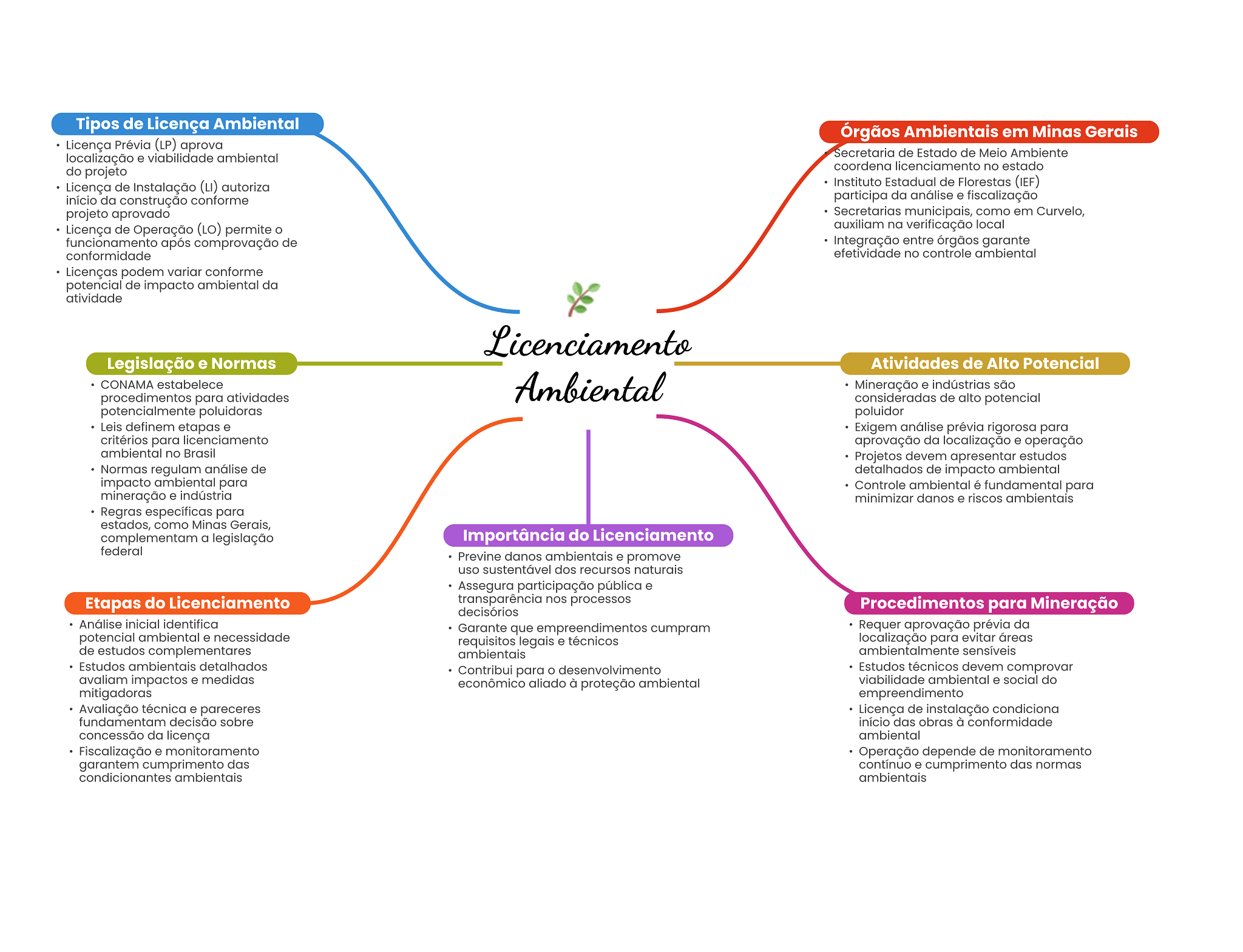 Tipos de Licença Ambiental Órgãos Ambientais em Minas Gerais Licença Prévia (LP) aprova localização e viabilidade ambiental Secretaria de Estado de Meio Ambiente coordena licenciamento no estado do projeto Licença de Instalação (LI) autoriza Instituto Estadual de Florestas (IEF) início da construção conforme participa da análise e fiscalização projeto aprovado Secretarias municipais, como em Curvelo, Licença de Operação (LO) permite auxiliam na verificação local funcionamento após comprovação de Integração entre órgãos garante conformidade efetividade no controle ambiental Licenças podem variar conforme potencial de impacto ambiental da atividade Licenciamento Legislação e Normas Atividades de Alto Potencial CONAMA estabelece Ambiental Mineração e indústrias são procedimentos para atividades consideradas de alto potencial potencialmente poluidoras poluidor Leis definem etapas e Exigem análise prévia rigorosa para critérios para licenciamento aprovação da localização e operação ambiental no Brasil Projetos devem apresentar estudos Normas regulam análise de detalhados de impacto ambiental impacto ambiental para Controle ambiental é fundamental para mineração e indústria minimizar danos e riscos ambientais Regras específicas para estados, como Minas Gerais, complementam a legislação Importância do Licenciamento federal Previne danos ambientais e promove uso sustentável dos recursos naturais Assegura participação pública e Etapas do Licenciamento transparência nos processos decisórios Procedimentos para Mineração Análise inicial identifica Garante que empreendimentos cumpram Requer aprovação prévia da potencial ambiental e necessidade requisitos legais e técnicos localização para evitar áreas de estudos complementares ambientais ambientalmente sensíveis Estudos ambientais detalhados Contribui para desenvolvimento Estudos técnicos devem comprovar avaliam impactos e medidas econômico aliado à proteção ambiental viabilidade ambiental e social do mitigadoras empreendimento Avaliação técnica e pareceres Licença de instalação condiciona fundamentam decisão sobre início das obras à conformidade concessão da licença ambiental Fiscalização e monitoramento Operação depende de monitoramento garantem cumprimento das contínuo e cumprimento das normas condicionantes ambientais ambientais