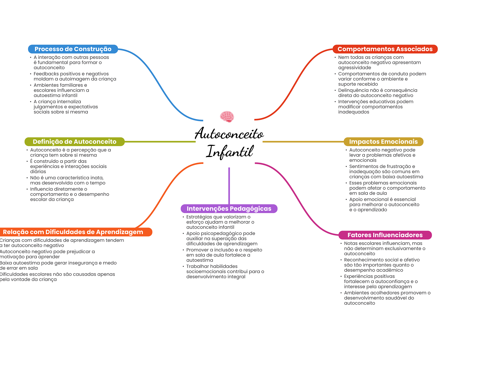 Processo de Construção Comportamentos Associados A interação com outras pessoas Nem todas as crianças com é fundamental para formar autoconceito negativo apresentam autoconceito agressividade Feedbacks positivos e negativos Comportamentos de conduta podem moldam a autoimagem da criança variar conforme ambiente e Ambientes familiares e suporte recebido escolares influenciam a Delinquência não é consequência autoestima infantil direta do autoconceito negativo A criança internaliza Intervenções educativas podem julgamentos e expectativas modificar comportamentos sociais sobre si mesma inadequados Autoconceito Definição de Autoconceito Impactos Emocionais Autoconceito é a percepção que a Infantil Autoconceito negativo pode criança tem sobre si mesma levar a problemas afetivos e É construído a partir das emocionais experiências e interações sociais Sentimentos de frustração e diárias inadequação são comuns em Não é uma característica inata, crianças com baixa autoestima mas desenvolvida com O tempo Esses problemas emocionais Influencia diretamente podem afetar comportamento comportamento e desempenho em sala de aula escolar da criança Apoio emocional é essencial para melhorar O autoconceito Intervenções Pedagógicas e O aprendizado Estratégias que valorizam O esforço ajudam a melhorar autoconceito infantil Relação com Dificuldades de Aprendizagem Apoio psicopedagógico pode Fatores Influenciadores Crianças com dificuldades de aprendizagem tendem auxiliar na superação das ter autoconceito negativo dificuldades de aprendizagem Notas escolares influenciam, mas Autoconceito negativo pode prejudicar a Promover a inclusão e O respeito não determinam exclusivamente em sala de aula fortalece a autoconceito motivação para aprender autoestima Reconhecimento social e afetivo Baixa autoestima pode gerar insegurança e medo de errar em sala Trabalhar habilidades são tão importantes quanto Dificuldades escolares não são causadas apenas socioemocionais contribui para desempenho acadêmico pela vontade da criança desenvolvimento integral Experiências positivas fortalecem a autoconfiança e interesse pela aprendizagem Ambientes acolhedores promovem O desenvolvimento saudável do autoconceito
