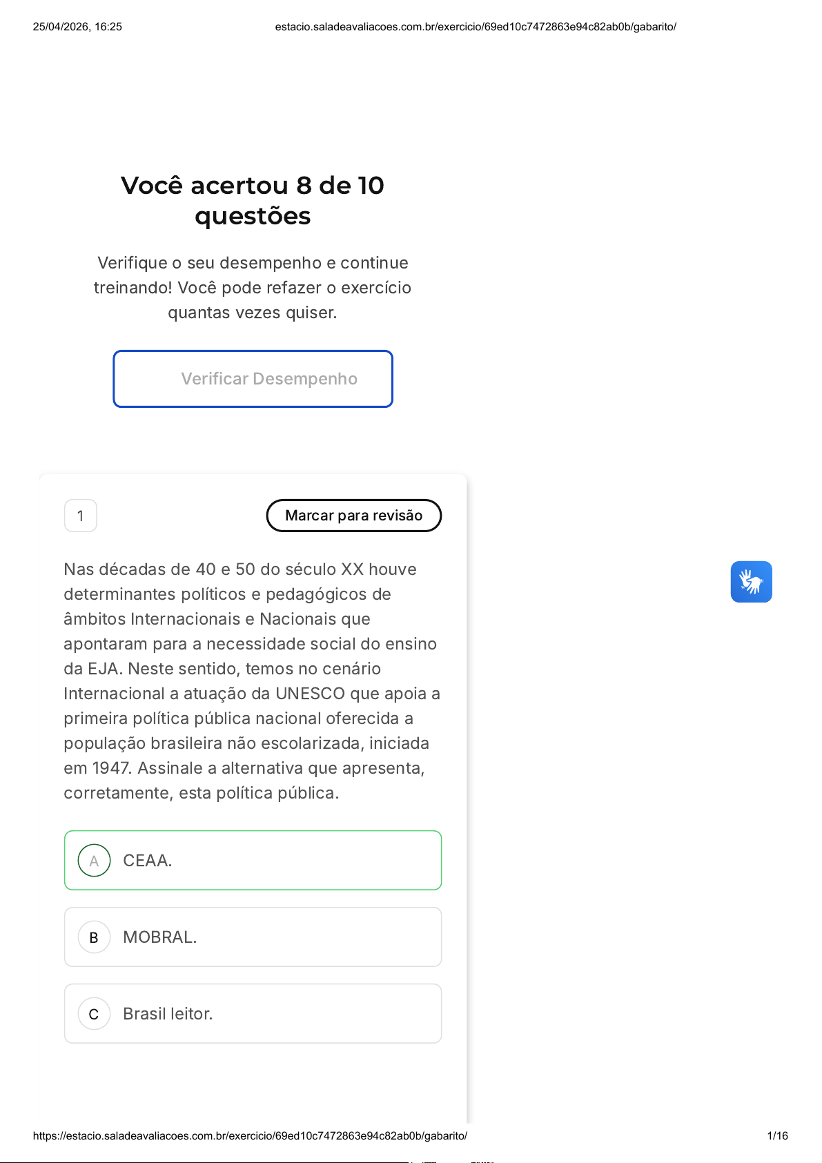 Você acertou 8 de 10 questões Verifique o seu desempenho e continue treinando! Você pode refazer o exercício quantas vezes quiser. Verificar Desempenho A B C 1 Marcar para revisão Nas décadas de 40 e 50 do século XX houve determinantes políticos e pedagógicos de âmbitos Internacionais e Nacionais que apontaram para a necessidade social do ensino da EJA. Neste sentido, temos no cenário Internacional a atuação da UNESCO que apoia a primeira política pública nacional oferecida a população brasileira não escolarizada, iniciada em 1947. Assinale a alternativa que apresenta, corretamente, esta política pública. CEAA. MOBRAL. Brasil leitor. 25/04/2026, 16:25 estacio.saladeavaliacoes.com.br/exercicio/69ed10c7472863e94c82ab0b/gabarito/ https://estacio.saladeavaliacoes.com.br/exercicio/69ed10c7472863e94c82ab0b/gabarito/ 1/16 D E Pátria alfabetizadora. FUNABEM. Resposta correta Parabéns, você selecionou a alternativa correta. Confira o gabarito comentado! Gabarito Comentado A Campanha de Educação de Adolescentes e Adultos (CEAA) tinha grande apoio da Organização das Nações Unidas para a Educação e a Cultura (Unesco), órgão da então recém-fundada Organização das Nações Unidas - ONU, que tinha um grande projeto de educação de base voltado para a promoção da educação em seus países-membros. 2 Marcar para revisão Pensando a Educação de Adultos, mesmo dentro da problemática do ensino elementar, nota-se que a partir dos anos de 1920 ela começa a ter uma importância maior. Sobre isso, analise as afirmativas: I. No início do governo Getúlio Vargas teremos a primeira manifestação em direção da separação da Educação dos Adultos da Educação Elementar Comum. II. O Censo de 1940 apresentou altos índices de analfabetismo e mais uma vez a problemática 25/04/2026, 16:25 estacio.saladeavaliacoes.com.br/exercicio/69ed10c7472863e94c82ab0b/gabarito/ https://estacio.saladeavaliacoes.com.br/exercicio/69ed10c7472863e94c82ab0b/gabarito/ 2/16 A B C D E do analfabetismo concentra atenções. III. O tema passa a ter maior relevância e destacar-se como uma temática distinta daquela relacionada à difusão do ensino elementar das crianças em idade escolar. IV. Neste período os baixos índices de analfabetismo fizeram com que a Educação de Jovens e Adultos fosse pensada para níveis superiores de instrução, elevando os investimentos como nunca visto. É correto o que se afirma em: I e II, apenas. II e IV, apenas. I e III, apenas. I, II e III, apenas. I, II, III e IV. Resposta correta Parabéns, você selecionou a alternativa correta. Confira o gabarito comentado! Gabarito Comentado A Educação de Adultos desde os anos de 1920 passa a ter uma importância maior, embora ainda seja discutida dentro da problemática do ensino elementar. No início do governo Getúlio Vargas teremos a 25/04/2026, 16:25 estacio.saladeavaliacoes.com.br/exercicio/69ed10c7472863e94c82ab0b/gabarito/ https://estacio.saladeavaliacoes.com.br/exercicio/69ed10c7472863e94c82ab0b/gabarito/ 3/16 A B C D E primeira manifestação em direção da separação da Educação dos Adultos da Educação Elementar Comum. A experiência do Distrito Federal também chamou a atenção para a Educação de Adultos. O censo de 1940 mostrou que 55% da população em idade economicamente ativa era analfabeta. Assim o tema passa a ter maior relevância e destacar-se como uma temática distinta daquela relacionada à difusão do ensino elementar das crianças em idade escolar. 3 Marcar para revisão Iniciada em 1947, pelo Governo Federal, a Campanha de Educação de Adolescentes e Adultos (CEAA), criada pelo Ministério da Educação e Saúde, constitui-se na primeira política pública nacional oferecida a população brasileira não escolarizada. Uma das principais críticas a esta campanha era direcionada ao: seu caráter teórico. seu caráter pedagógico. seu caráter eleitoreiro. seu caráter internacionalista. seu caráter ideológico de esquerda. Questão 5 de 10 Corretas (8) 1 2 3 4 5 6 7 8 9 10 Lista de exercícios Uma Visão… Sair 25/04/2026, 16:25 estacio.saladeavaliacoes.com.br/exercicio/69ed10c7472863e94c82ab0b/gabarito/ https://estacio.saladeavaliacoes.com.br/exercicio/69ed10c7472863e94c82ab0b/gabarito/ 4/16 Resposta incorreta Opa! A alternativa correta é a letra C. Confira o gabarito comentado! Gabarito Comentado A CEAA teve grande penetração em praticamente todos os estados da federação. Com firme coordenação de Lourenço Filho, estabeleceu convênios com muitas secretarias dos estados e municípios. Não se limitou a atuar nas capitais, atingiu muitas cidades do interior. Significou, ao mesmo tempo, um movimento de alfabetização de adultos e um movimento de extensão da escolarização no meio rural. Embora definindo-se como educação de adultos, a Campanha limitou-se à alfabetização; foi mesmo muito criticada por ter se tornado uma "fábrica de eleitores". 4 Marcar para revisão Em 1947, o Governo Federal empreendeu a primeira grande iniciativa nacional e massiva, voltada ao problema do analfabetismo entre adolescentes e adultos. Tendo como base o conteúdo do recorte acima, considere as seguintes afirmativas: I - A visão que se tinha do analfabeto, à época, era de um sujeito cujos saberes e conhecimentos eram reconhecidos e respeitados como principal ponto de partida do processo pedagógico. II - Os analfabetos eram vistos como incapazes e marginais, psicológica e socialmente infantilizados. Incorretas (2) Em branco (0) 25/04/2026, 16:25 estacio.saladeavaliacoes.com.br/exercicio/69ed10c7472863e94c82ab0b/gabarito/ https://estacio.saladeavaliacoes.com.br/exercicio/69ed10c7472863e94c82ab0b/gabarito/ 5/16 A B C D E III - Havia um sentimento de que a salvação do País e o resgate da condição humana dos analfabetos era obra da ação educacional. IV - Nos princípios pedagógicos da campanha, a condição do analfabeto não significava que este fosse "inferior" em compa