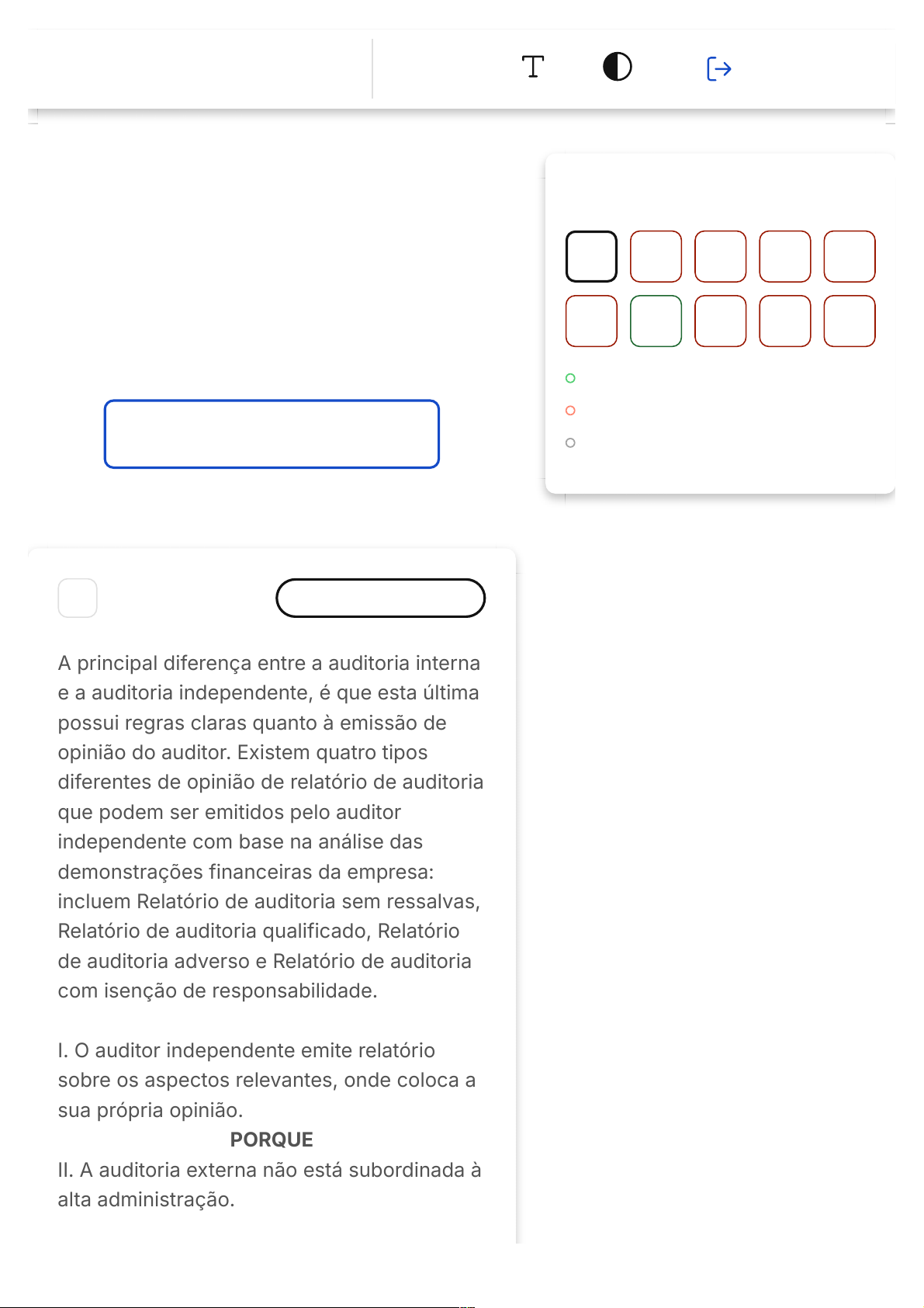 Você acertou 1 de 10 questões Verifique o seu desempenho e continue treinando! Você pode refazer o exercício quantas vezes quiser. Verificar Desempenho 1 Marcar para revisão A principal diferença entre a auditoria interna e a auditoria independente, é que esta última possui regras claras quanto à emissão de opinião do auditor. Existem quatro tipos diferentes de opinião de relatório de auditoria que podem ser emitidos pelo auditor independente com base na análise das demonstrações financeiras da empresa: incluem Relatório de auditoria sem ressalvas, Relatório de auditoria qualificado, Relatório de auditoria adverso e Relatório de auditoria com isenção de responsabilidade. I. O auditor independente emite relatório sobre os aspectos relevantes, onde coloca a sua própria opinião. PORQUE II. A auditoria externa não está subordinada à alta administração. Questão 1 de 10 Corretas (1) Incorretas (9) Em branco (0) 1 2 3 4 5 6 7 8 9 10 Lista de exercícios A Previdênc… Social e Sistema Previdenciário Brasileiro Sair A B C D E Marque a alternativa correta. A segunda afirmativa é incorreta e somente a primeira é verdadeira. A primeira afirmativa é correta, apenas. A primeira afirmativa é correta, a segunda é correta e justifica a primeira. As duas afirmativas são corretas, mas não têm relação entre si. As duas afirmativas são incorretas. Resposta incorreta Opa! A alternativa correta é a letra C. Confira o gabarito comentado! Gabarito Comentado As duas afirmativas são corretas e a segunda justifica a primeira. O auditor independente, ao analisar as demonstrações financeiras da empresa, emite um relatório onde expressa a sua opinião sobre os aspectos relevantes. Esta opinião é baseada em sua análise e julgamento profissional, sem interferência da alta administração da empresa. Isso ocorre porque a auditoria A B C externa, ao contrário da auditoria interna, não está subordinada à alta administração da empresa, o que garante a sua independência e isenção na emissão do relatório de auditoria. 2 Marcar para revisão O auditor da companhia de seguros "Delta S/A" contratou um auditor independente, o qual, durante os seus trabalhos, deu o que falar... As equipes das áreas pelas quais ele passou comentaram que o auditor tinha uma mente questionadora e, quando pedia evidências para o seu trabalho de auditoria, parecia estar muito alerta quanto a possíveis erros ou fraudes. Além disso, ele fez muitas avaliações críticas das evidências apresentadas, o que gerou muita insegurança nos gerentes da área de seguros. A postura do auditor foi correta, pois na sua função ele agiu com: Ética Asseguração Razoável Risco D E Ceticismo Profissional Distorções Resposta incorreta Opa! A alternativa correta é a letra D. Confira o gabarito comentado! Gabarito Comentado O auditor demonstrou uma postura de ceticismo profissional. Isso significa que ele manteve uma mente questionadora e alerta durante todo o processo de auditoria, sempre atento a possíveis erros ou fraudes. Além disso, ele realizou avaliações críticas das evidências apresentadas, o que é uma parte essencial do trabalho de um auditor. O ceticismo profissional é uma característica fundamental para um auditor, pois permite que ele identifique possíveis irregularidades e garanta a precisão e a confiabilidade das informações financeiras. Portanto, a postura do auditor foi correta e alinhada com as melhores práticas de auditoria. 3 Marcar para revisão Em uma Companhia de Seguros e Previdência, João é auditor interno e José A B C D trabalha no controle interno. Juntos, analisaram os cálculos atuariais e perceberam que a conta contábil de reservas técnicas estava com saldos diferentes do exercício de 2018 para 2019. José buscou as últimas Demonstrações Contábeis publicadas e os relatórios emitidos pela Auditoria Independente da época e observou que a estrutura do relatório financeiro aplicável estava em conformidade com as leis e regulamentos, mas que a apresentação dos relatórios da auditoria não estava adequada. José (controle interno) perguntou a João (auditor) qual a consequência disso para a próxima auditoria. O que você responderia a José se fosse João? Assinale a afirmativa correta: Que as evidências de auditoria são insuficientes para expressar uma opinião. Que as diferenças de saldos na apresentação do relatório contábil indicam risco de distorção relevante. Que a premissa adotada é satisfatória e existe asseguração razoável. Que o auditor não verá como um risco de distorção relevante, pois a estrutura do relatório financeiro aplicável está em conformidade com leis e regulamentos. E Que as evidências de auditoria são de responsabilidade do auditor, na etapa da auditoria, e não cabe a eles avaliar. Resposta incorreta Opa! A alternativa correta é a letra B. Confira o gabarito comentado! Gabarito Comentado A alternativa correta é "Que as diferenças de saldos na apresentação do relatório contábil indicam risco de distorção relevante". Isso ocorre porque, mesmo que a estrutura do relatório financeiro esteja em conformidade com as leis e regulamentos, a diferença nos saldos entre os anos é um indicativo de possíveis distorções relevantes que podem afetar a precisão e a confiabilidade das informações contábeis. Portanto, essa situação deve ser considerada como um risco na próxima auditoria. As outras alternativas são incorretas por diversos motivos. "Que as evidências de auditoria são insuficientes para expressar uma opinião", está incorreta porque a insuficiência de evidências de auditoria para expressar uma opinião não está diretamente relacionada à diferença de saldos. "Que a premissa adotada é satisfatória e existe asseguração razoável". está incorreta porque a premissa adotada não justifica uma asseguração razoável sem uma explicação adequada para a diferença de sald