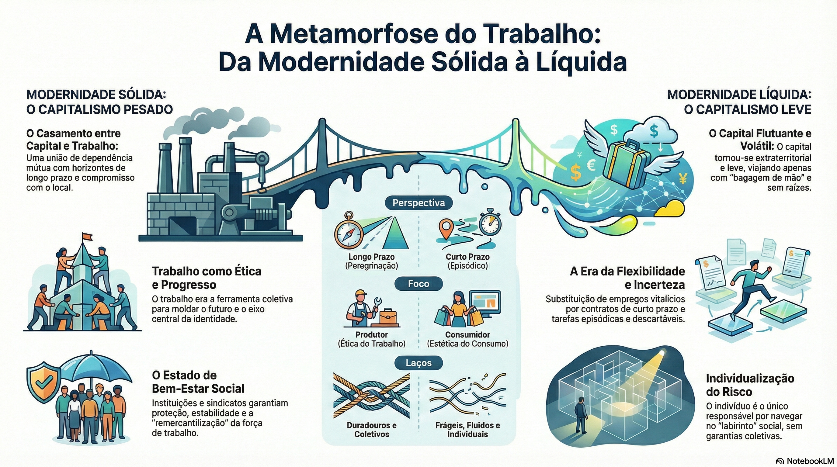 A Metamorfose do Trabalho: Da Modernidade Sólida à Líquida MODERNIDADE SÓLIDA: MODERNIDADE LÍQUIDA: CAPITALISMO PESADO CAPITALISMO LEVE Casamento entre $ $ Capital Flutuante e Capital e Trabalho: Volátil: capital Uma união de dependência tornou-se extraterritorial mútua com horizontes de $ € e leve, viajando apenas longo prazo e compromisso com "bagagem de mão" e com local. sem raízes. Perspectiva Longo Prazo Curto Prazo Trabalho como Ética (Peregrinação) (Episódico) A Era da Flexibilidade e Progresso Foco e Incerteza trabalho era a ferramenta coletiva Substituição de empregos vitalícios para moldar futuro e eixo por contratos de curto prazo e central da identidade. tarefas episódicas e descartâveis. Produtor Consumidor (Ética do Trabalho) (Estética do Consumo) Laços Estado de Individualização Bem-Estar Social do Risco Instituições e sindicatos garantiam indivíduo é único proteção, estabilidade e a responsável por navegar "remercantilização" da força Duradouros e Frágeis, Fluidos e no "labirinto" social, sem de trabalho. Coletivos Individuais garantias coletivas. NotebookLM