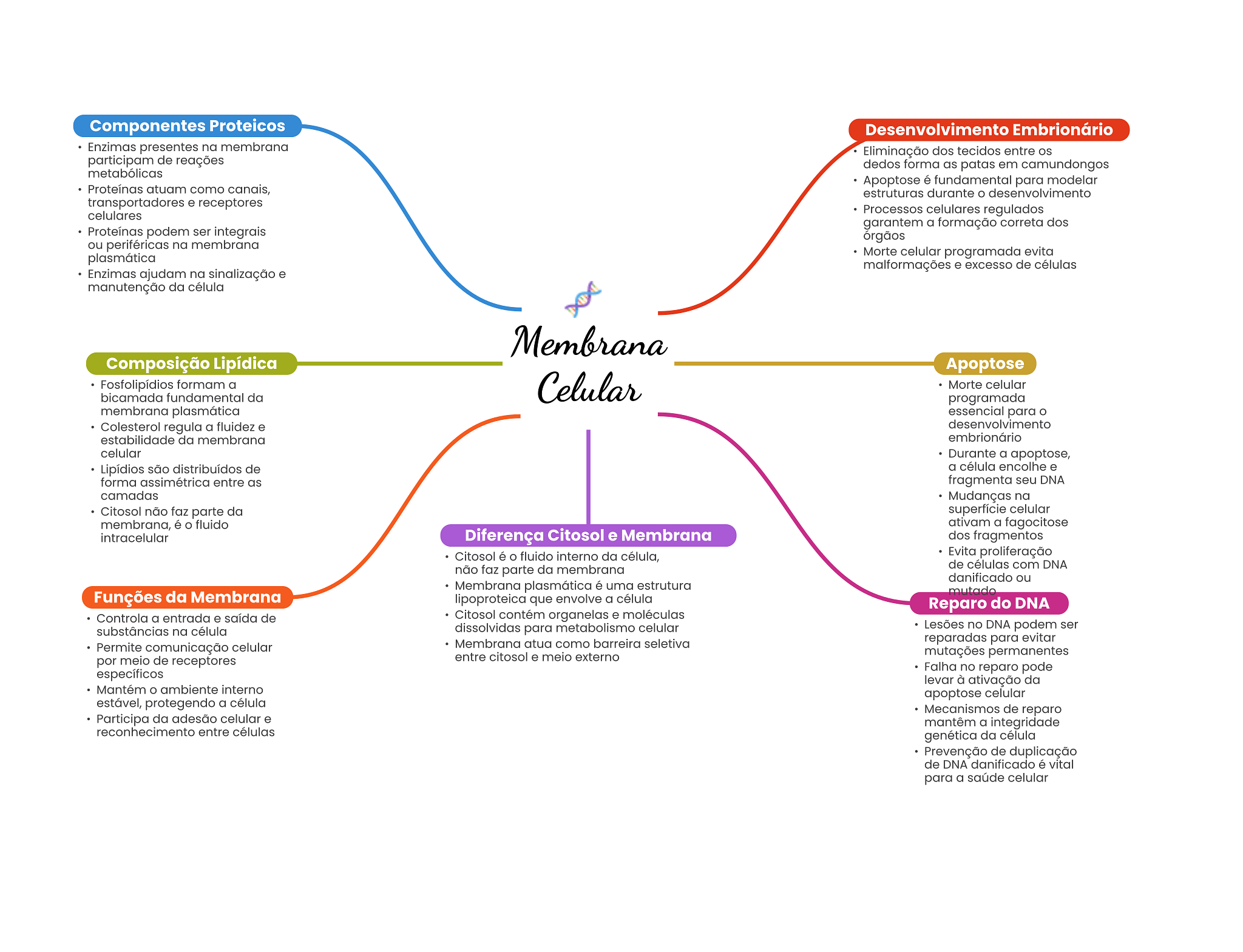 Componentes Proteicos Desenvolvimento Embrionário Enzimas presentes na membrana Eliminação dos tecidos entre os participam de reações dedos forma as patas em camundongos metabólicas Apoptose é fundamental para modelar Proteínas atuam como canais, estruturas durante O desenvolvimento transportadores e receptores celulares Processos celulares regulados garantem a formação correta dos Proteínas podem ser integrais órgãos ou periféricas na membrana plasmática Morte celular programada evita malformações e excesso de células Enzimas ajudam na sinalização e manutenção da célula Membrana Composição Lipídica Apoptose Fosfolipídios formam a Celular Morte celular bicamada fundamental da programada membrana plasmática essencial para Colesterol regula a fluidez e desenvolvimento estabilidade da membrana embrionário celular Durante a apoptose, Lipídios são distribuídos de a célula encolhe e forma assimétrica entre as fragmenta seu DNA camadas Mudanças na Citosol não faz parte da superficie celular membrana, é O fluido ativam a fagocitose intracelular Diferença Citosol e Membrana dos fragmentos Citosol é O fluido interno da célula, Evita proliferação não faz parte da membrana de células com DNA danificado ou Membrana plasmática é uma estrutura mutado Funções da Membrana lipoproteica que envolve a célula Reparo do DNA Controla a entrada e saída de Citosol contém organelas e moléculas substâncias na célula dissolvidas para metabolismo celular Lesões no DNA podem ser Membrana atua como barreira seletiva reparadas para evitar Permite comunicação celular entre citosol e meio externo mutações permanentes por meio de receptores específicos Falha no reparo pode levar à ativação da Mantém O ambiente interno apoptose celular estável, protegendo a célula Mecanismos de reparo Participa da adesão celular e mantêm a integridade reconhecimento entre células genética da célula Prevenção de duplicação de DNA danificado é vital para a saúde celular