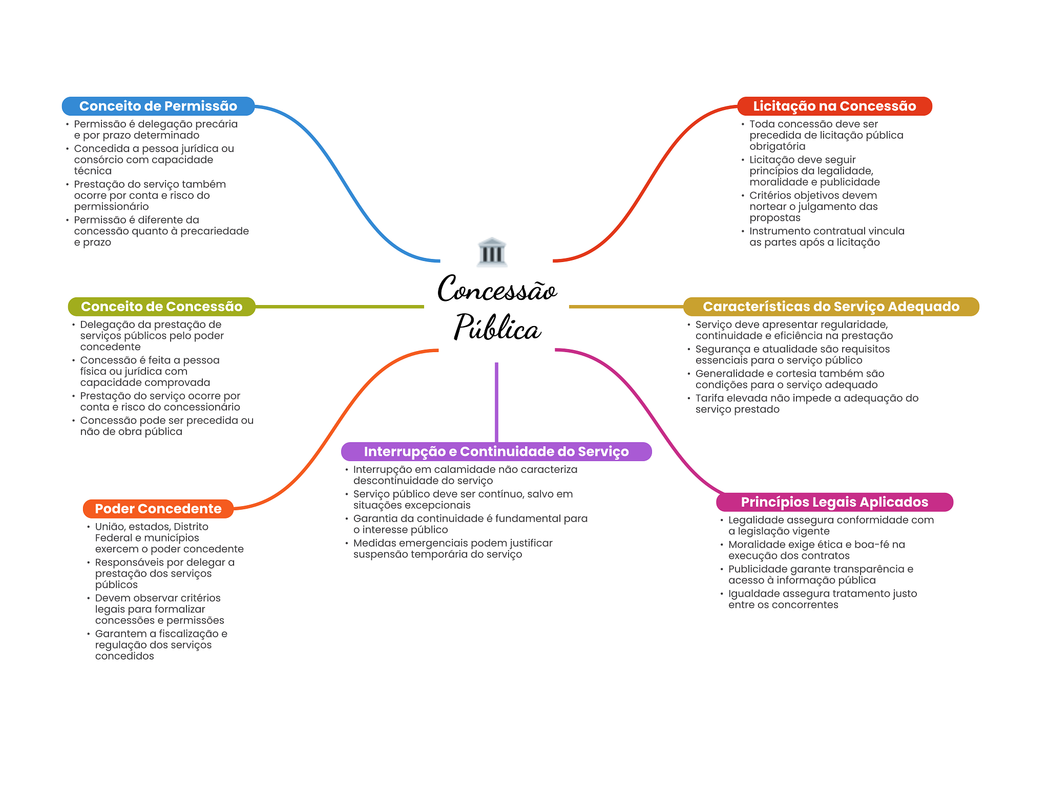 Conceito de Permissão Licitação na Concessão Permissão é delegação precária Toda concessão deve ser e por prazo determinado precedida de licitação pública Concedida a pessoa jurídica ou obrigatória consórcio com capacidade Licitação deve seguir técnica princípios da legalidade, Prestação do serviço também moralidade e publicidade ocorre por conta e risco do Critérios objetivos devem permissionário nortear julgamento das Permissão é diferente da propostas concessão quanto à precariedade Instrumento contratual vincula e prazo as partes após a licitação Concessão Conceito de Concessão Características do Serviço Adequado Delegação da prestação de Pública Serviço deve apresentar regularidade, serviços públicos pelo poder continuidade e eficiência na prestação concedente Segurança e atualidade são requisitos Concessão é feita a pessoa essenciais para O serviço público física ou jurídica com Generalidade e cortesia também são capacidade comprovada condições para O serviço adequado Prestação do serviço ocorre por Tarifa elevada não impede a adequação do conta e risco do concessionário serviço prestado Concessão pode ser precedida ou não de obra pública Interrupção e Continuidade do Serviço Interrupção em calamidade não caracteriza descontinuidade do serviço Serviço público deve ser contínuo, salvo em Poder Concedente situações excepcionais Princípios Legais Aplicados Garantia da continuidade é fundamental para Legalidade assegura conformidade com União, estados, Distrito interesse público a legislação vigente Federal e municípios exercem poder concedente Medidas emergenciais podem justificar Moralidade exige ética e boa-fé na suspensão temporária do serviço execução dos contratos Responsáveis por delegar a prestação dos serviços Publicidade garante transparência e públicos acesso à informação pública Devem observar critérios Igualdade assegura tratamento justo legais para formalizar entre concorrentes concessões e permissões Garantem a fiscalização e regulação dos serviços concedidos